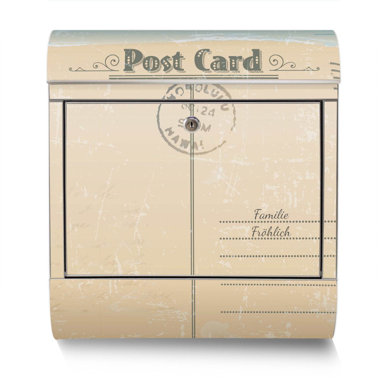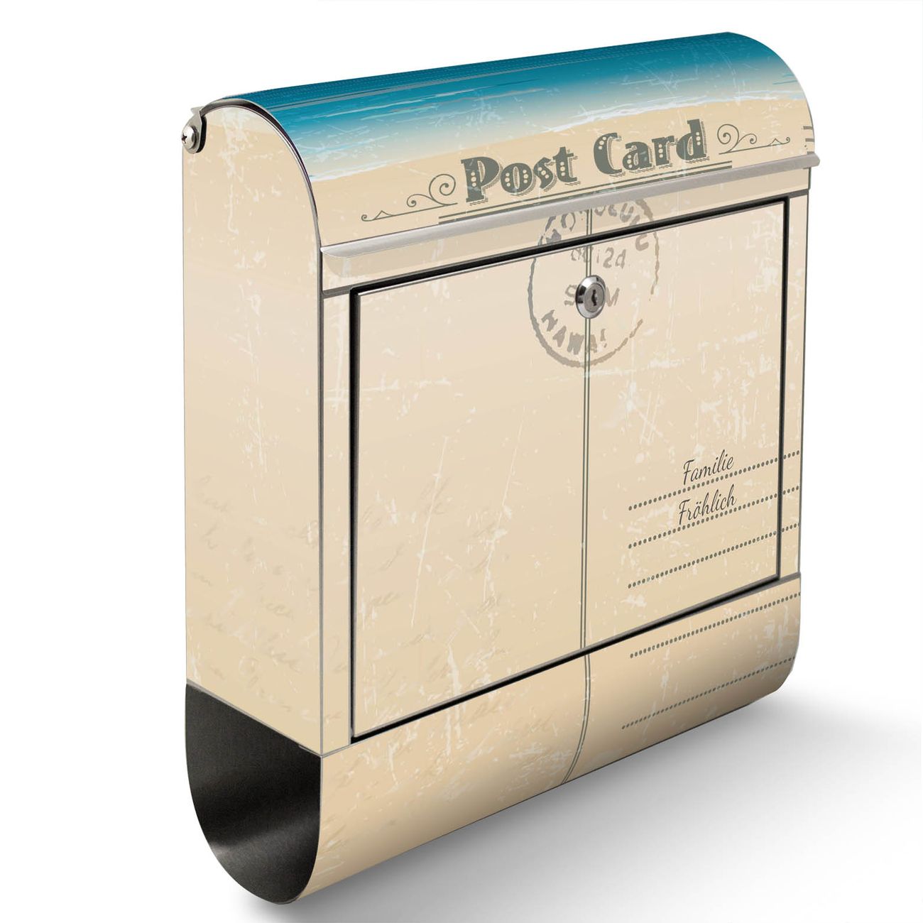 Der Motivstandbriefkasten hat ein sehr ansprechendes und ausgefallenes Design, damit entlocken Sie Ihren Nachbarn und dem Postboten ein Lächeln. Heben Sie Sich ab von der tristen grauen Masse, ohne auf Funktionalität zu verzichten. Der Briefkasten besteht aus hochwertigem 18/0 Edelstahl und die Wetter- und UV-resistenten Folie mit Postkarte Motiv ist zusätzlich mit einem Schutzlaminat überzogen. Der Standbriefkasten wird mit Montagematerial und zwei Schlüsseln geliefert.