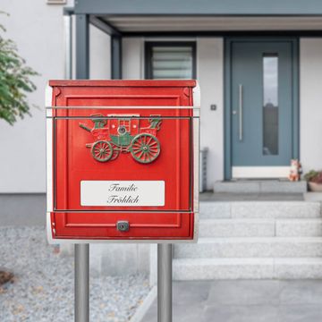 Der banjado Edelstahl Standbriefkasten mit Motiv Postkasten Nostalgie und eigenem Wunschtext bietet Ihnen mit seinem Fassungsvermögen genügend Platz auch für große A4 Sendungen. Das integrierte Zeitungsfach eignet sich hervorragend, um unkompliziert die Tageszeitung zu fassen.