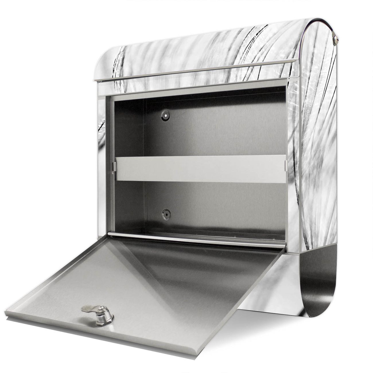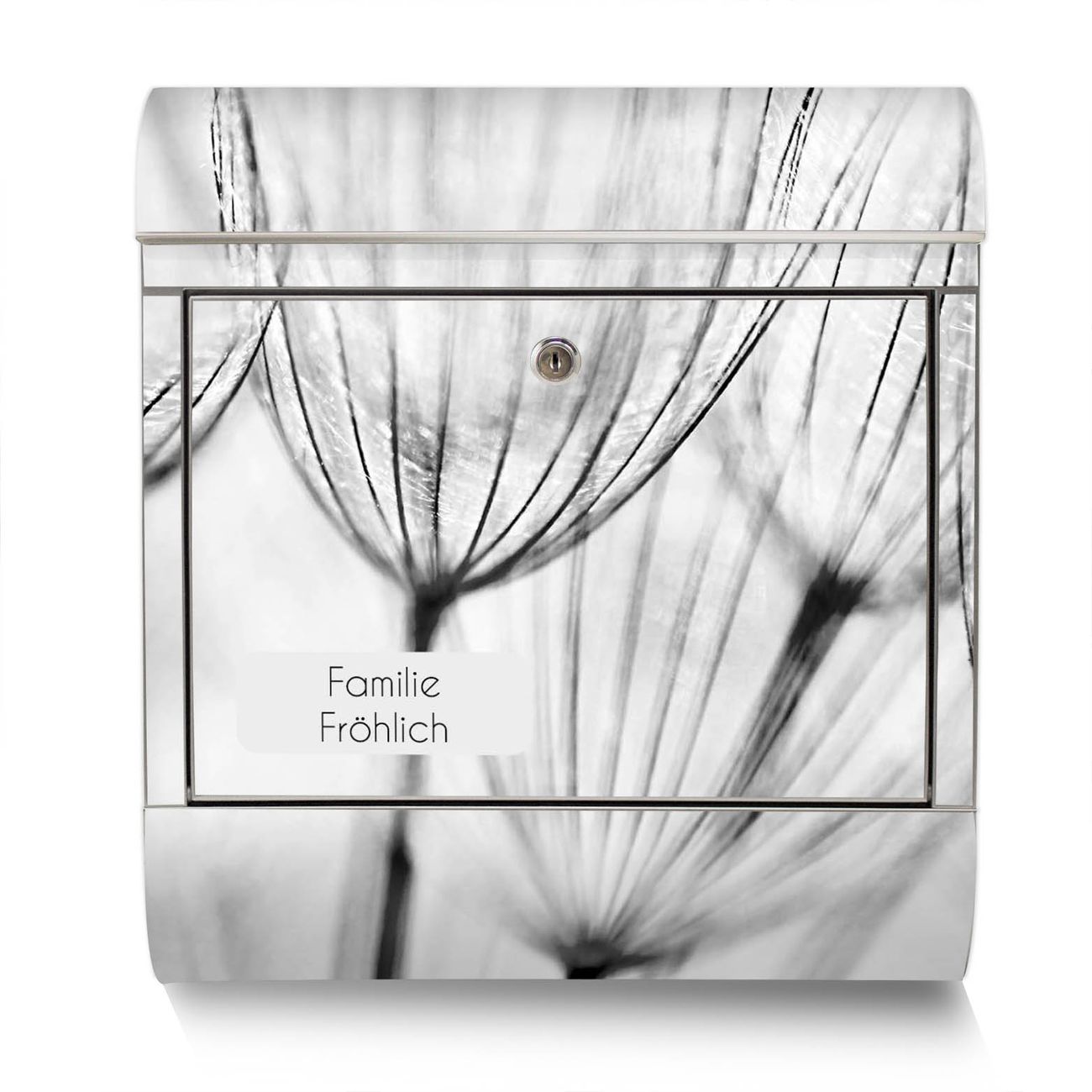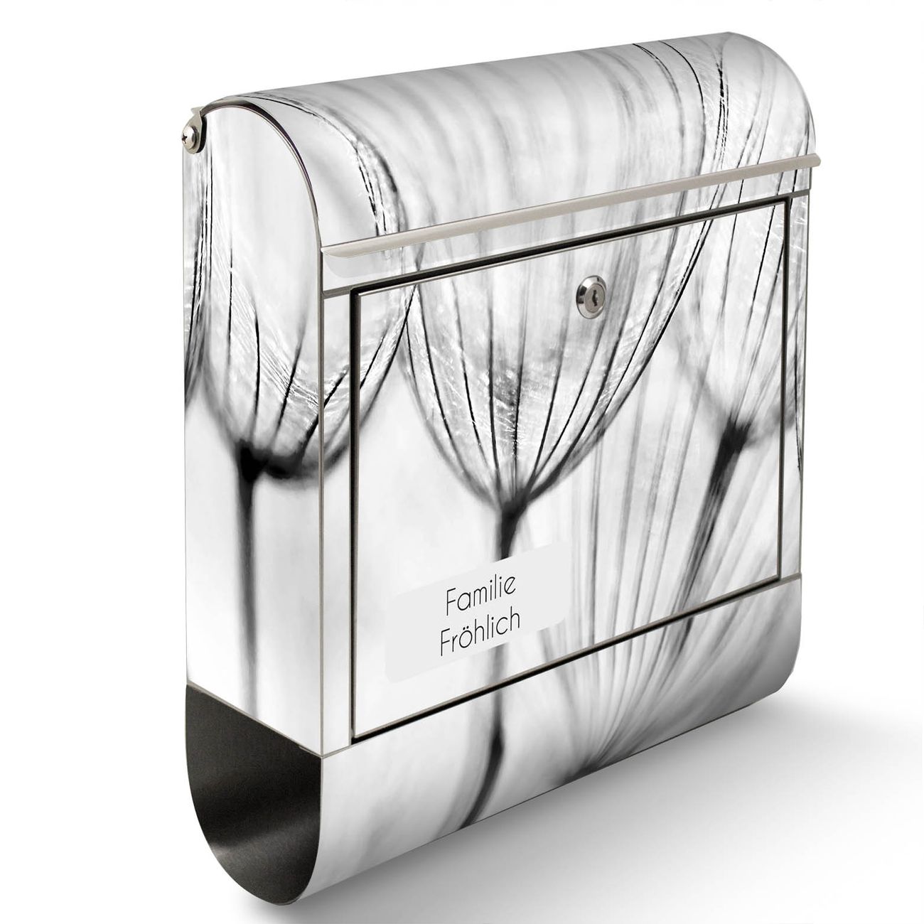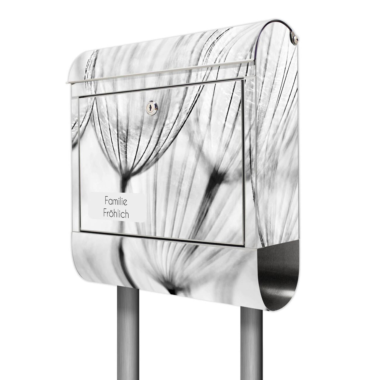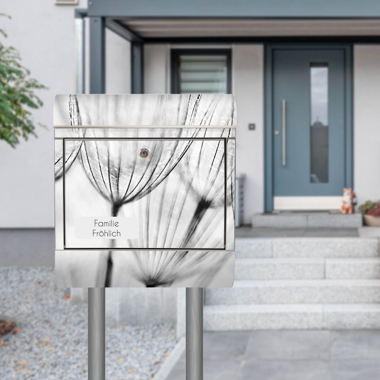 Der banjado Edelstahl Standbriefkasten mit Motiv Pusteblumen SW und eigenem Wunschtext bietet Ihnen mit seinem Fassungsvermögen genügend Platz auch für große A4 Sendungen. Das integrierte Zeitungsfach eignet sich hervorragend, um unkompliziert die Tageszeitung zu fassen.