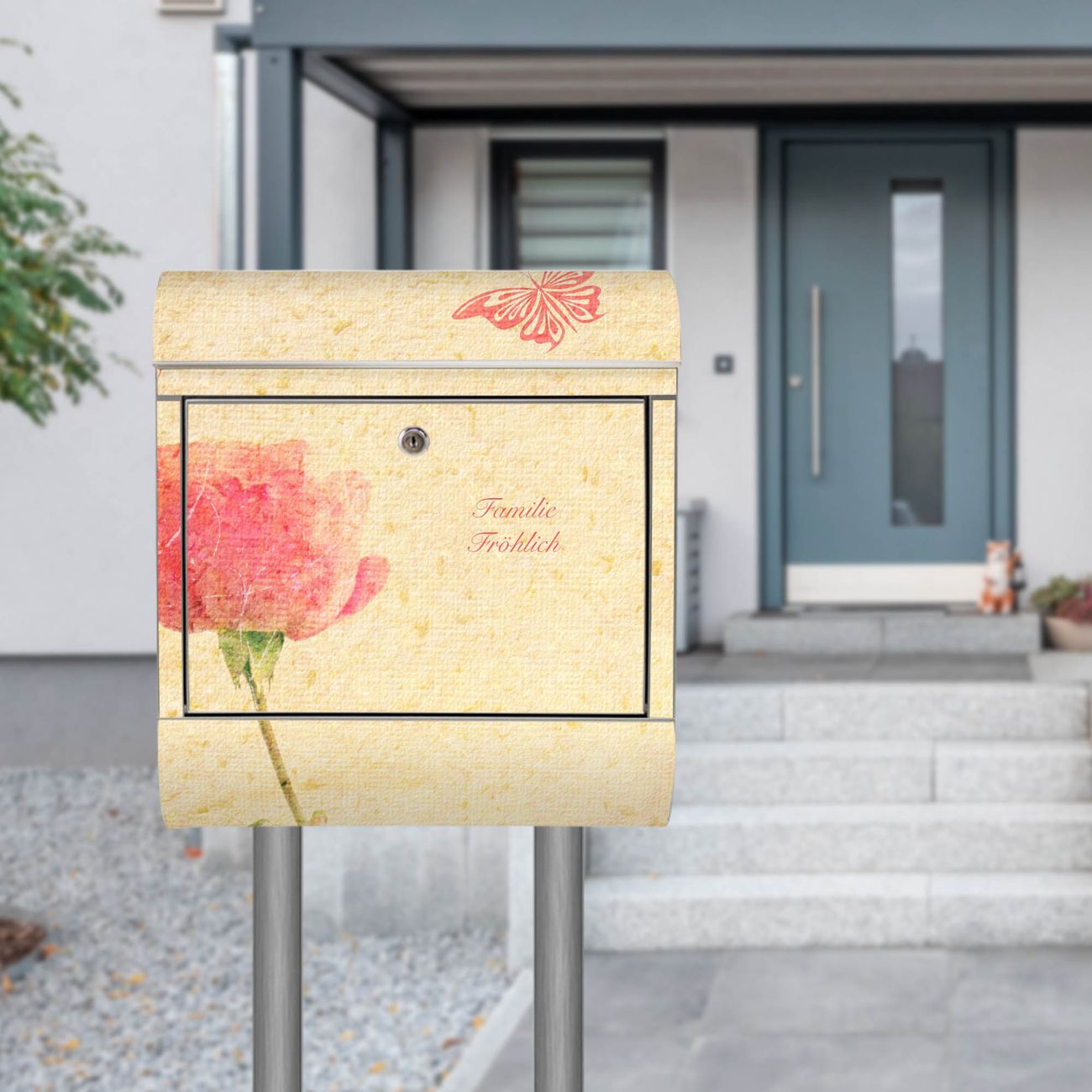 Der banjado Edelstahl Standbriefkasten mit Motiv Romantik und eigenem Wunschtext bietet Ihnen mit seinem Fassungsvermögen genügend Platz auch für große A4 Sendungen. Das integrierte Zeitungsfach eignet sich hervorragend, um unkompliziert die Tageszeitung zu fassen.
