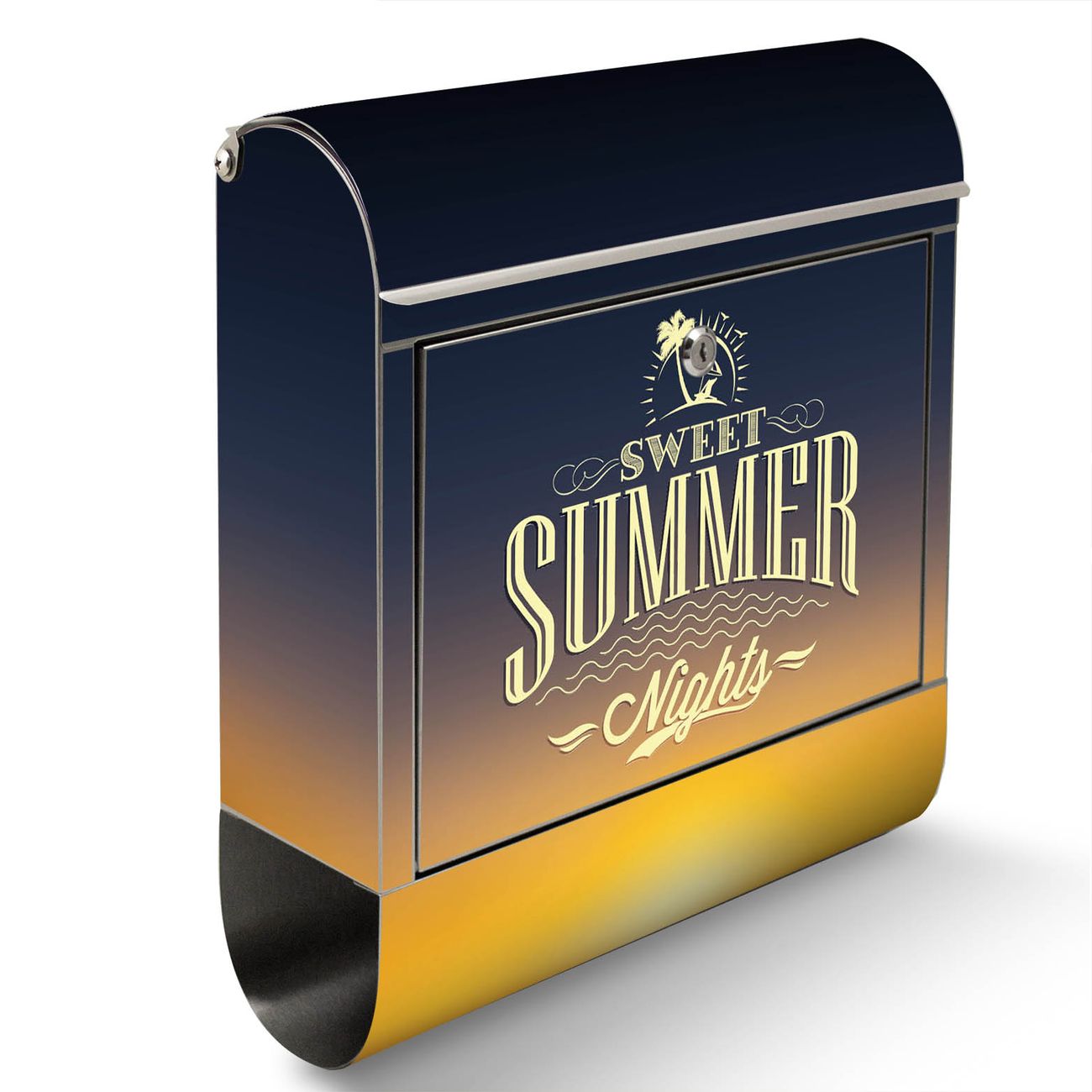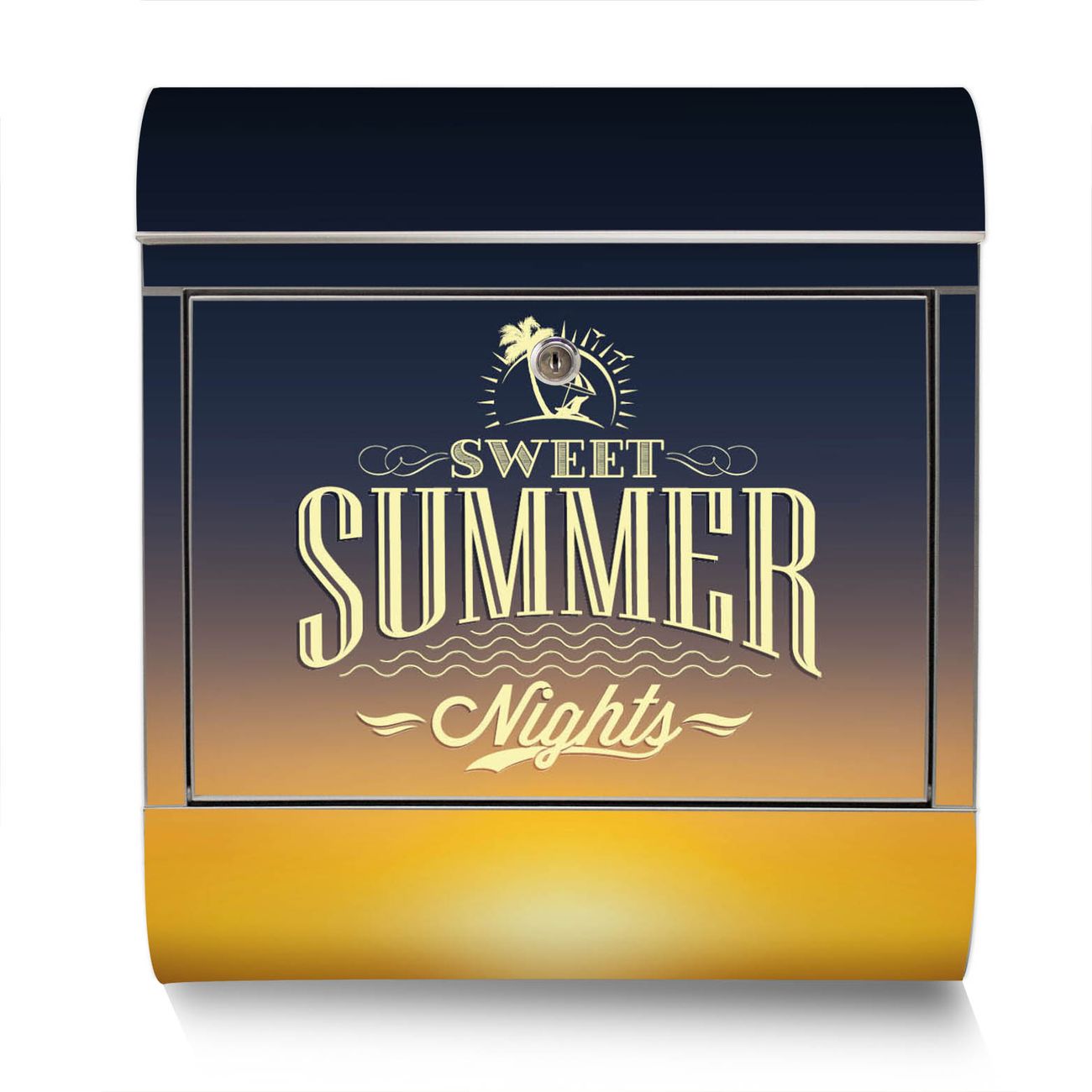 Der Motivstandbriefkasten hat ein sehr ansprechendes und ausgefallenes Design, damit entlocken Sie Ihren Nachbarn und dem Postboten ein Lächeln. Heben Sie Sich ab von der tristen grauen Masse, ohne auf Funktionalität zu verzichten. Der Briefkasten besteht aus hochwertigem 18/0 Edelstahl und die Wetter- und UV-resistenten Folie mit Sommer Night Motiv ist zusätzlich mit einem Schutzlaminat überzogen. Der Standbriefkasten wird mit Montagematerial und zwei Schlüsseln geliefert.