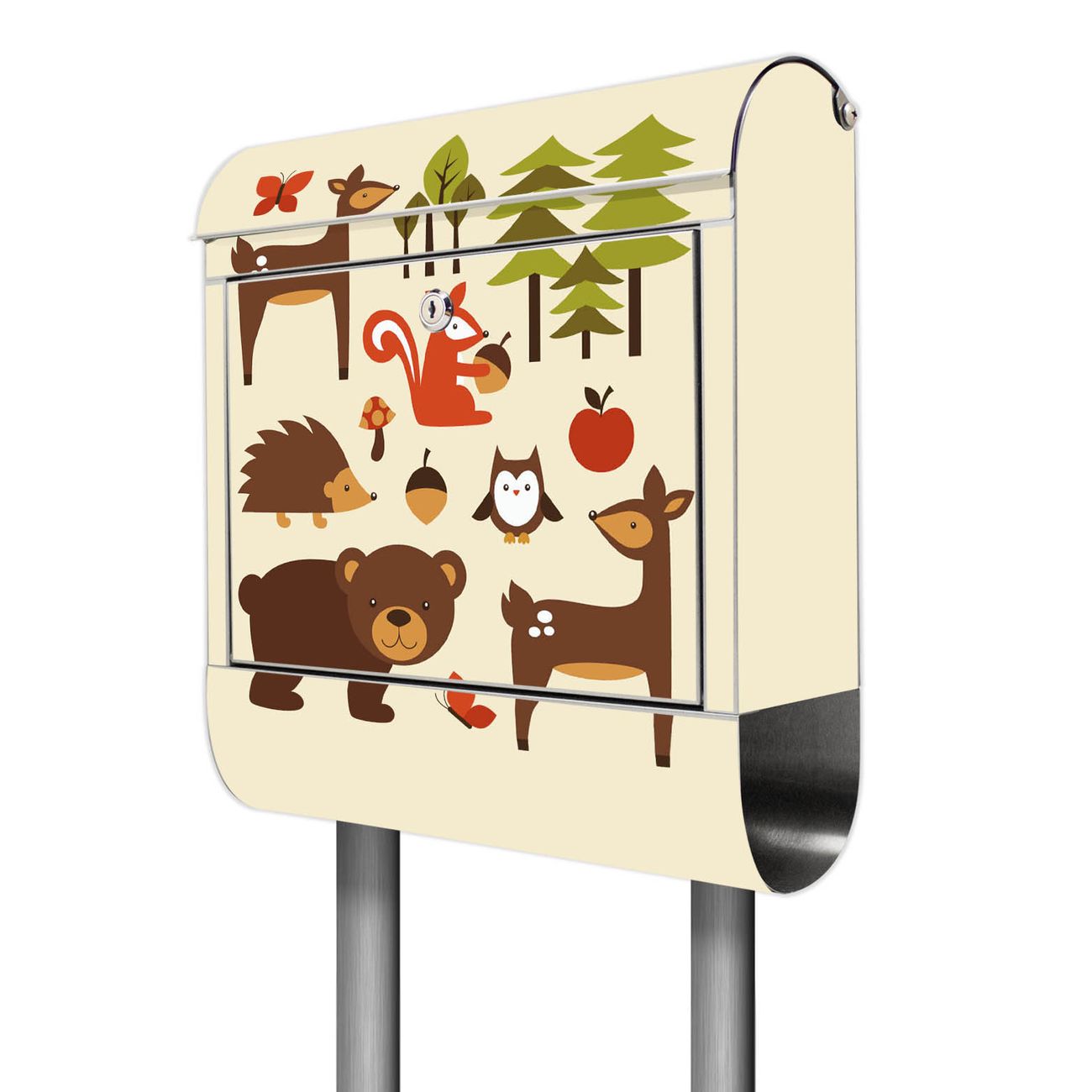 Der Motivstandbriefkasten hat ein sehr ansprechendes und ausgefallenes Design, damit entlocken Sie Ihren Nachbarn und dem Postboten ein Lächeln. Heben Sie Sich ab von der tristen grauen Masse, ohne auf Funktionalität zu verzichten. Der Briefkasten besteht aus hochwertigem 18/0 Edelstahl und die Wetter- und UV-resistenten Folie mit Waldfreunde Motiv ist zusätzlich mit einem Schutzlaminat überzogen. Der Standbriefkasten wird mit Montagematerial und zwei Schlüsseln geliefert.