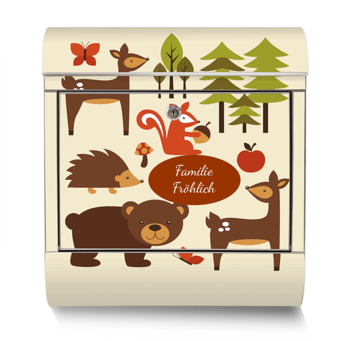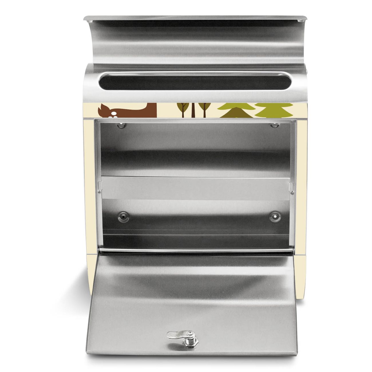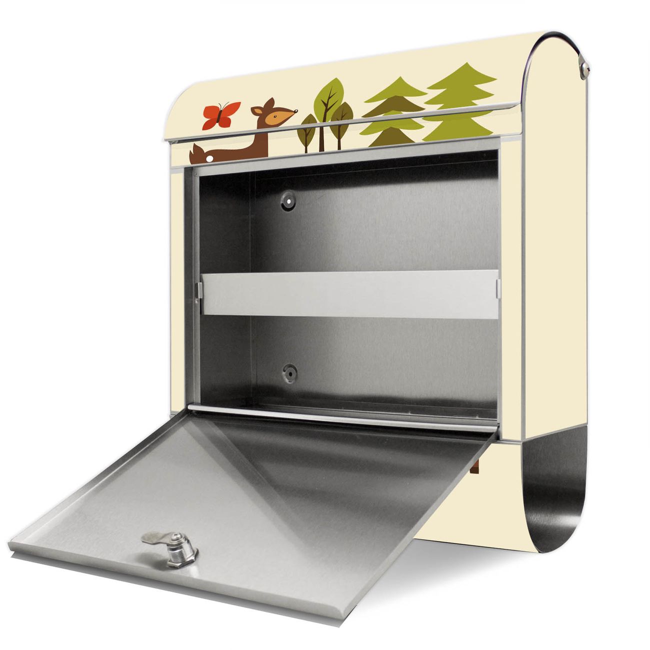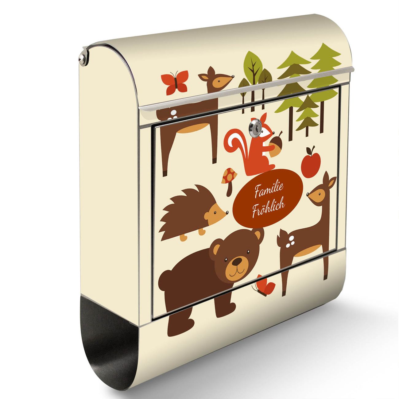 Der Motivstandbriefkasten hat ein sehr ansprechendes und ausgefallenes Design, damit entlocken Sie Ihren Nachbarn und dem Postboten ein Lächeln. Heben Sie Sich ab von der tristen grauen Masse, ohne auf Funktionalität zu verzichten. Der Briefkasten besteht aus hochwertigem 18/0 Edelstahl und die Wetter- und UV-resistenten Folie mit Waldfreunde Motiv ist zusätzlich mit einem Schutzlaminat überzogen. Der Standbriefkasten wird mit Montagematerial und zwei Schlüsseln geliefert.