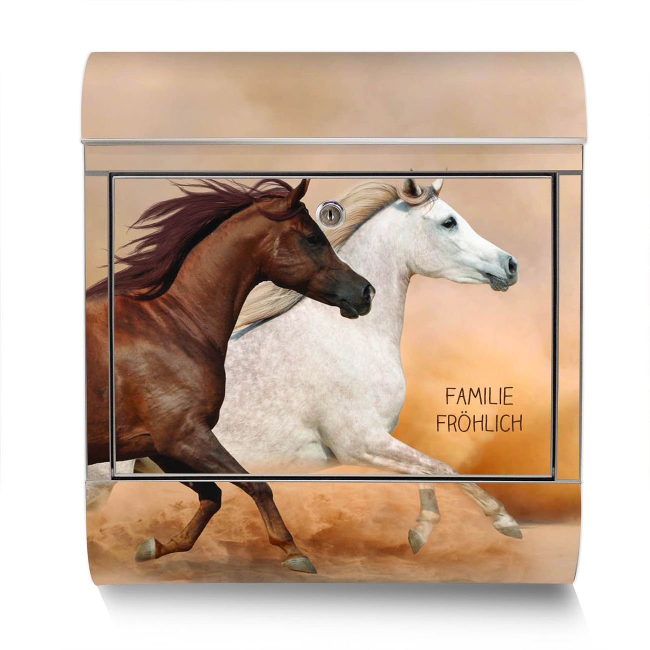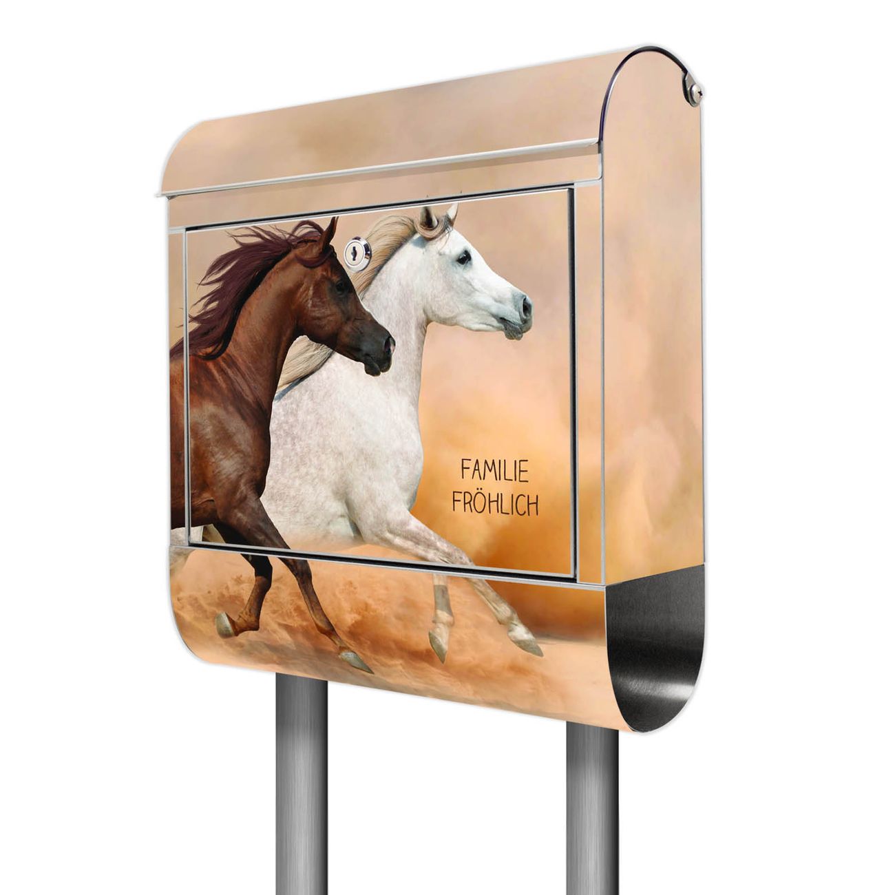 Der banjado Edelstahl Standbriefkasten mit Motiv Wilde Pferde und eigenem Wunschtext bietet Ihnen mit seinem Fassungsvermögen genügend Platz auch für große A4 Sendungen. Das integrierte Zeitungsfach eignet sich hervorragend, um unkompliziert die Tageszeitung zu fassen.