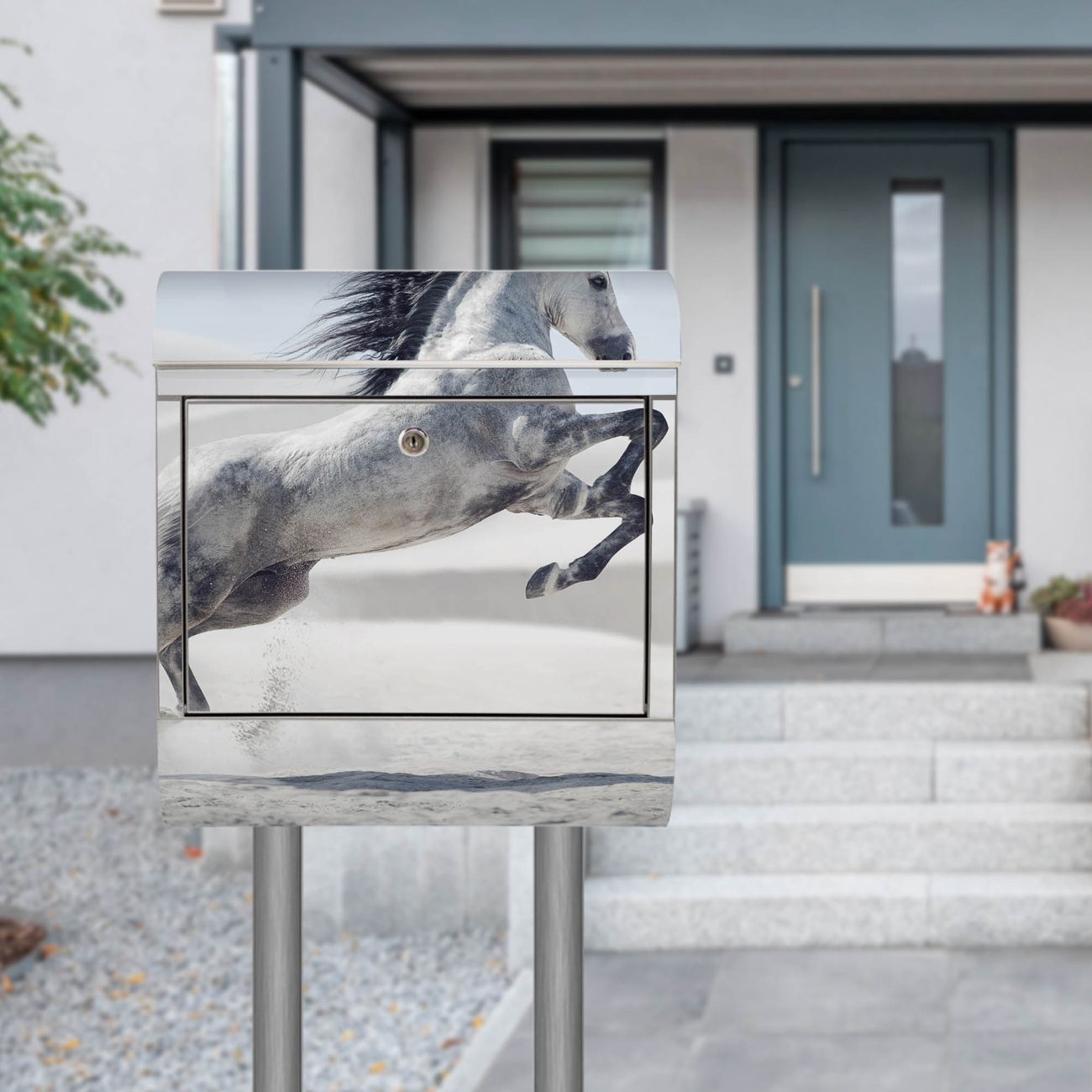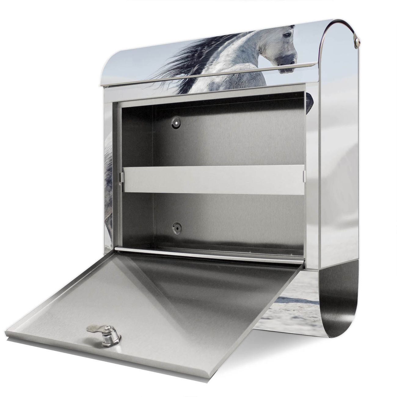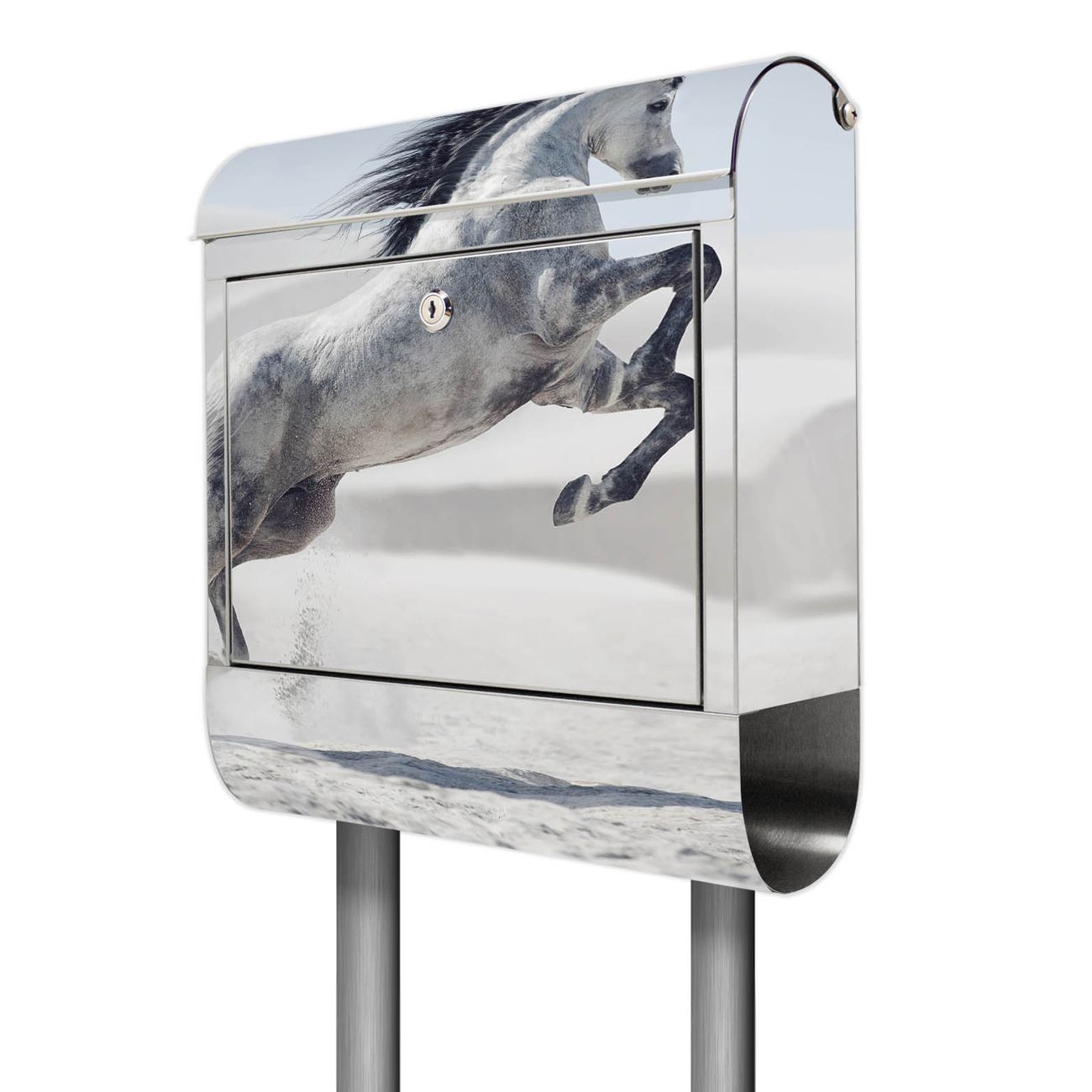 Der banjado Edelstahl Standbriefkasten mit Motiv Wildes Pferd bietet Ihnen mit seinem Fassungsvermögen genügend Platz auch für große A4 Sendungen. Das integrierte Zeitungsfach eignet sich hervorragend, um unkompliziert die Tageszeitung zu fassen.