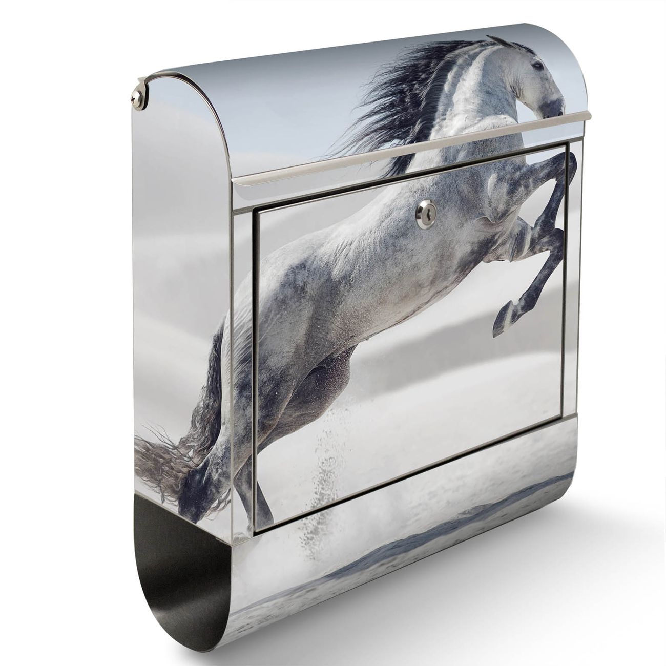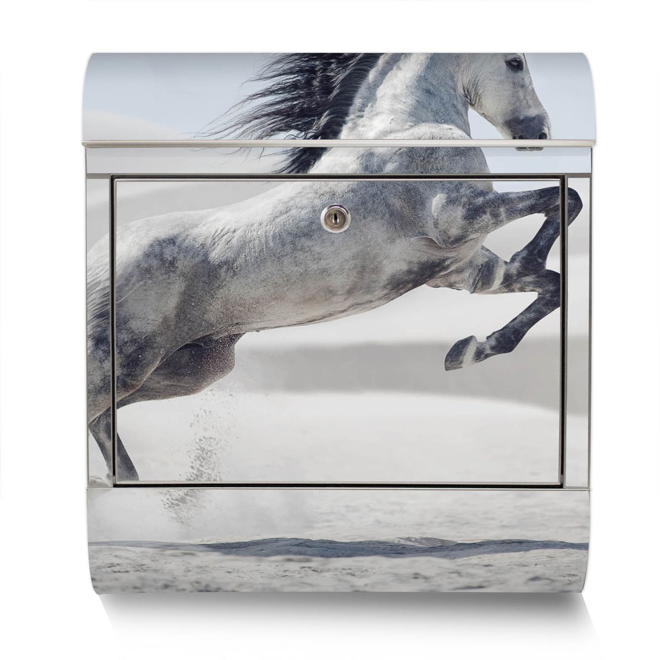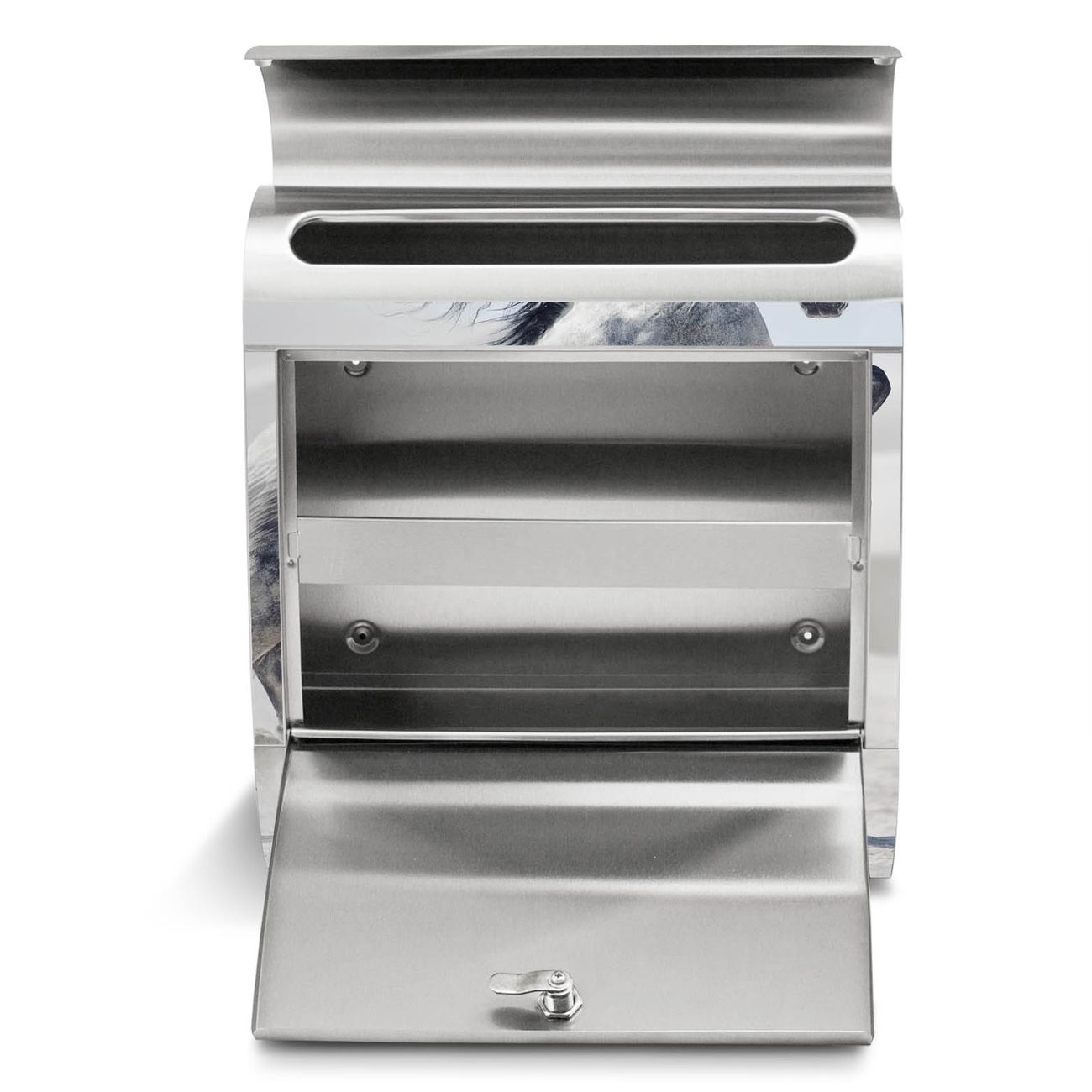 Der banjado Edelstahl Standbriefkasten mit Motiv Wildes Pferd bietet Ihnen mit seinem Fassungsvermögen genügend Platz auch für große A4 Sendungen. Das integrierte Zeitungsfach eignet sich hervorragend, um unkompliziert die Tageszeitung zu fassen.