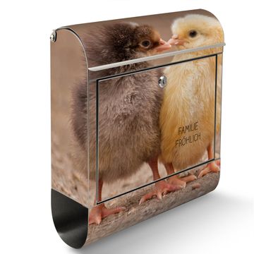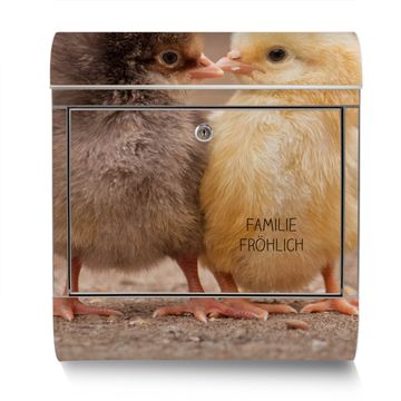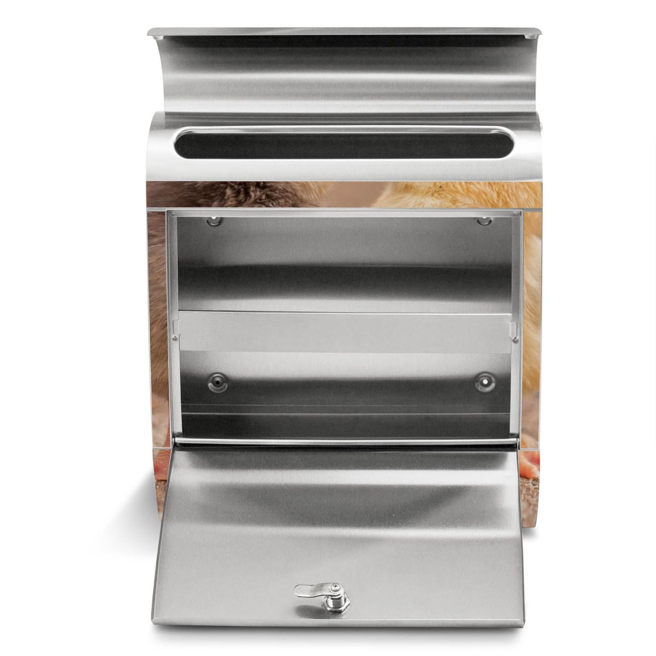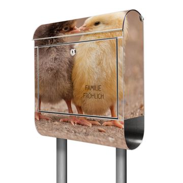Der banjado Edelstahl Standbriefkasten mit Motiv Zwei Küken und eigenem Wunschtext bietet Ihnen mit seinem Fassungsvermögen genügend Platz auch für große A4 Sendungen. Das integrierte Zeitungsfach eignet sich hervorragend, um unkompliziert die Tageszeitung zu fassen.