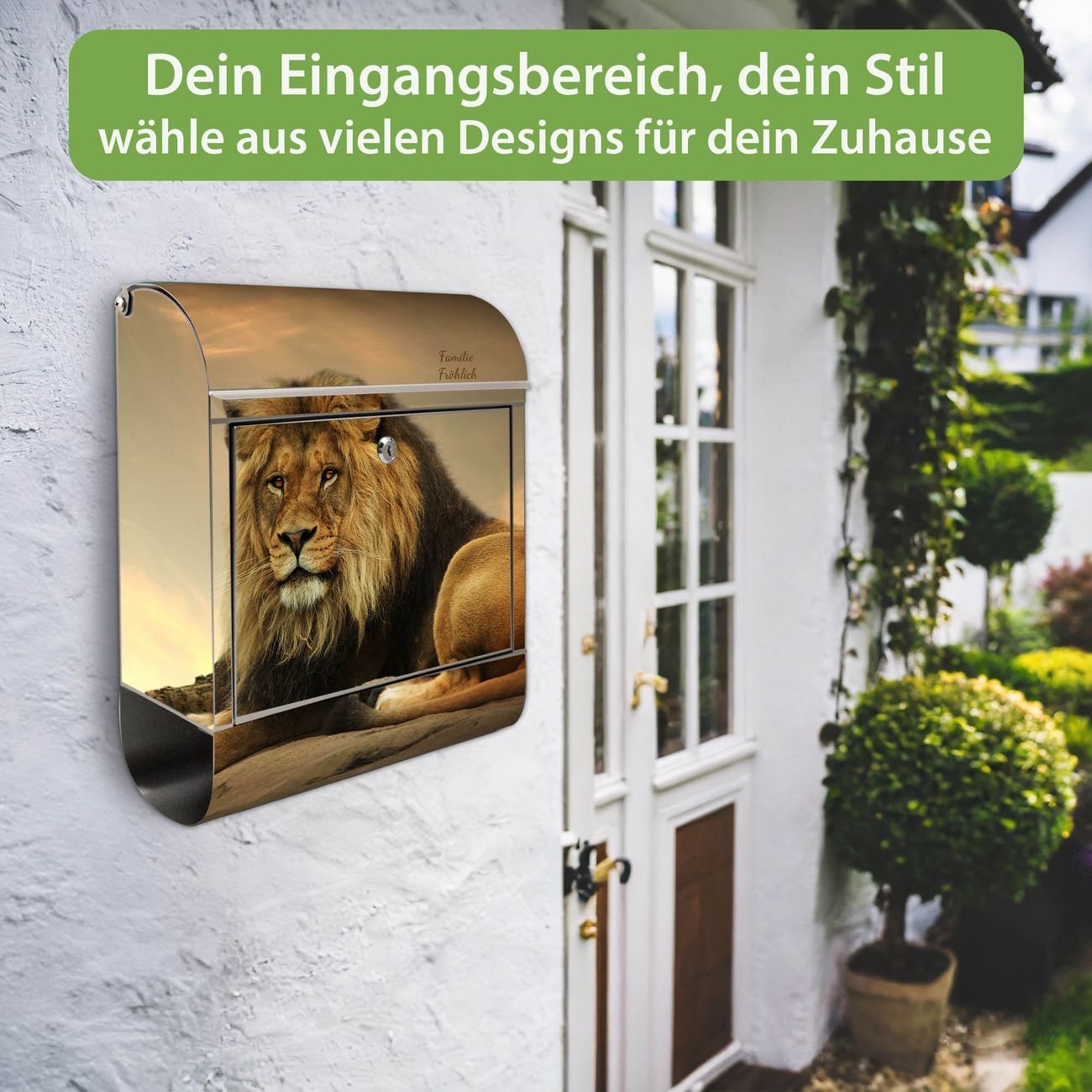 Der Vorschau-Text Familie Fröhlich wird durch Ihren persönlichen Wunschtext ersetzt. Die Schriftart und Farbe bleiben gleich wie in der Vorschau.