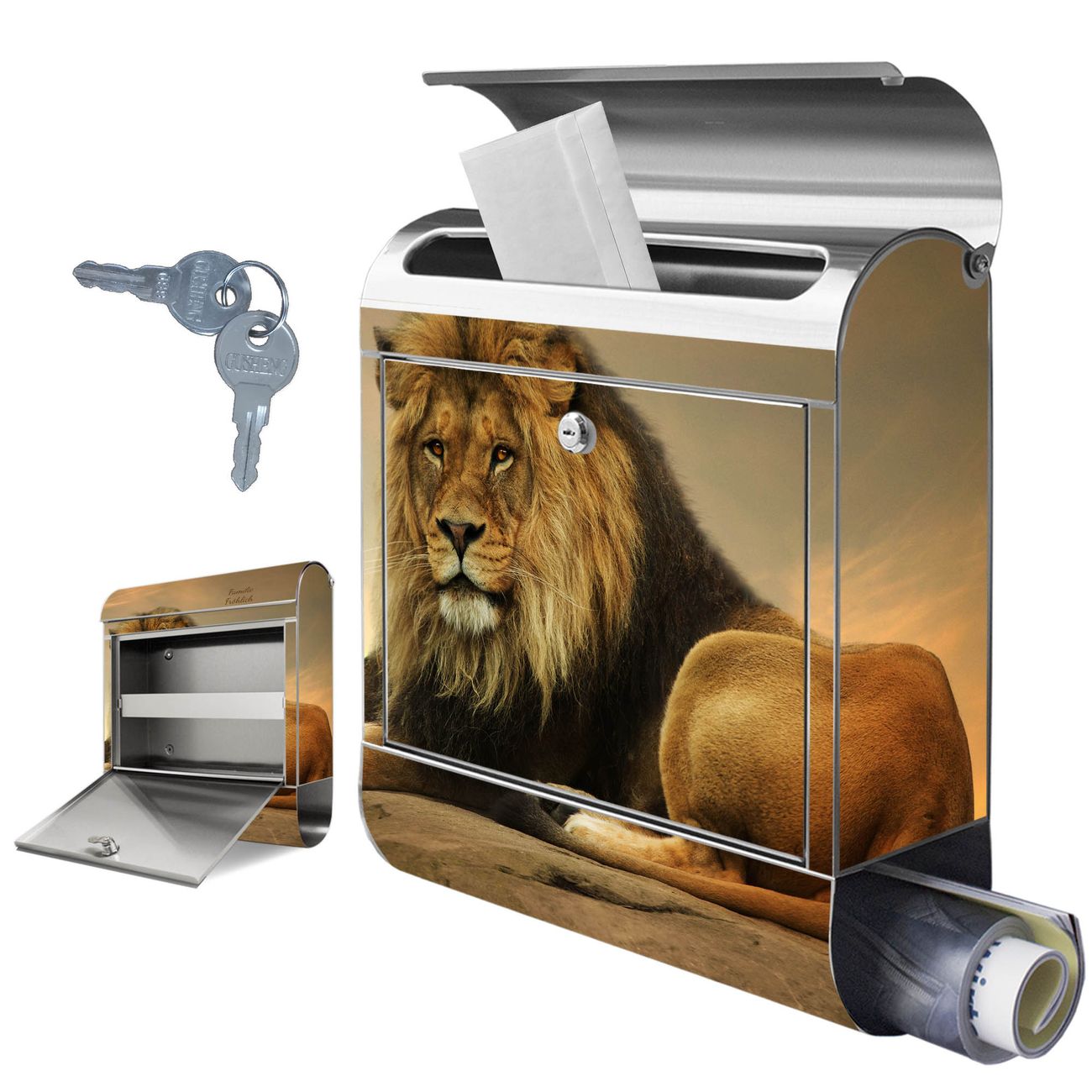 FUNKTION: Der banjado Edelstahl Briefkasten mit Motiv Motiv Adrian bietet Ihnen mit seinem Fassungsvermögen genügend Platz auch für große A4 Sendungen. Das integrierte Zeitungsfach eignet sich hervorragend um unkompliziert die Tageszeitung zu fassen. Auf Wunsch können Sie bei uns den passenden Ständer kaufen und so aus dem Wandbriefkasten einen Standbriefkasten machen. DESIGN: Der Motivbriefkasten hat ein sehr ansprechendes und ausgefallenes Design, damit entlocken Sie Ihren Nachbarn und dem Postboten ein Lächeln. Heben Sie Sich ab von der tristen grauen Masse ohne auf Funktionalität zu verzichten. DETAILS: Der Design Briefkasten mit Motiv Motiv Adrian besteht aus hochwertigem 18/0 Edelstahl. Das Motiv besteht aus einer wetter- und UV-resistenten Folie, die mit einem Schutzlaminat überzogen ist. Der Briefkasten wird mit Montagematerial und zwei Schlüsseln geliefert. NUTZEN: Sie können diesen Briefkasten sowohl als Wandbriefkasten montieren oder einen passenden Ständer auswählen und als Standbriefkasten einbetonieren. Die Größe bietet genügend Platz für Sendungen aller Art, das hochwertige Edelstahl ist rostfrei und die Motivfolie absolut wetterfest. SCHUTZ: Um Ihre Post optimal vor Witterungseinflüssen wie Starkregen zu schützen, empfehlen wir, den Briefkasten geschützt anzubringen. BANJADO: Ihr Briefkasten wird in Sachsen in einer kleinen Manufaktur von Hand veredelt. Die Motivfolie ist lösungsmittelfrei und schutzlaminiert, dies sorgt für einen langen Halt. Wir legen großen Wert auf die Verbindung von Funktionalität und Design. Sie erhalten Handarbeit aus Sachsen.