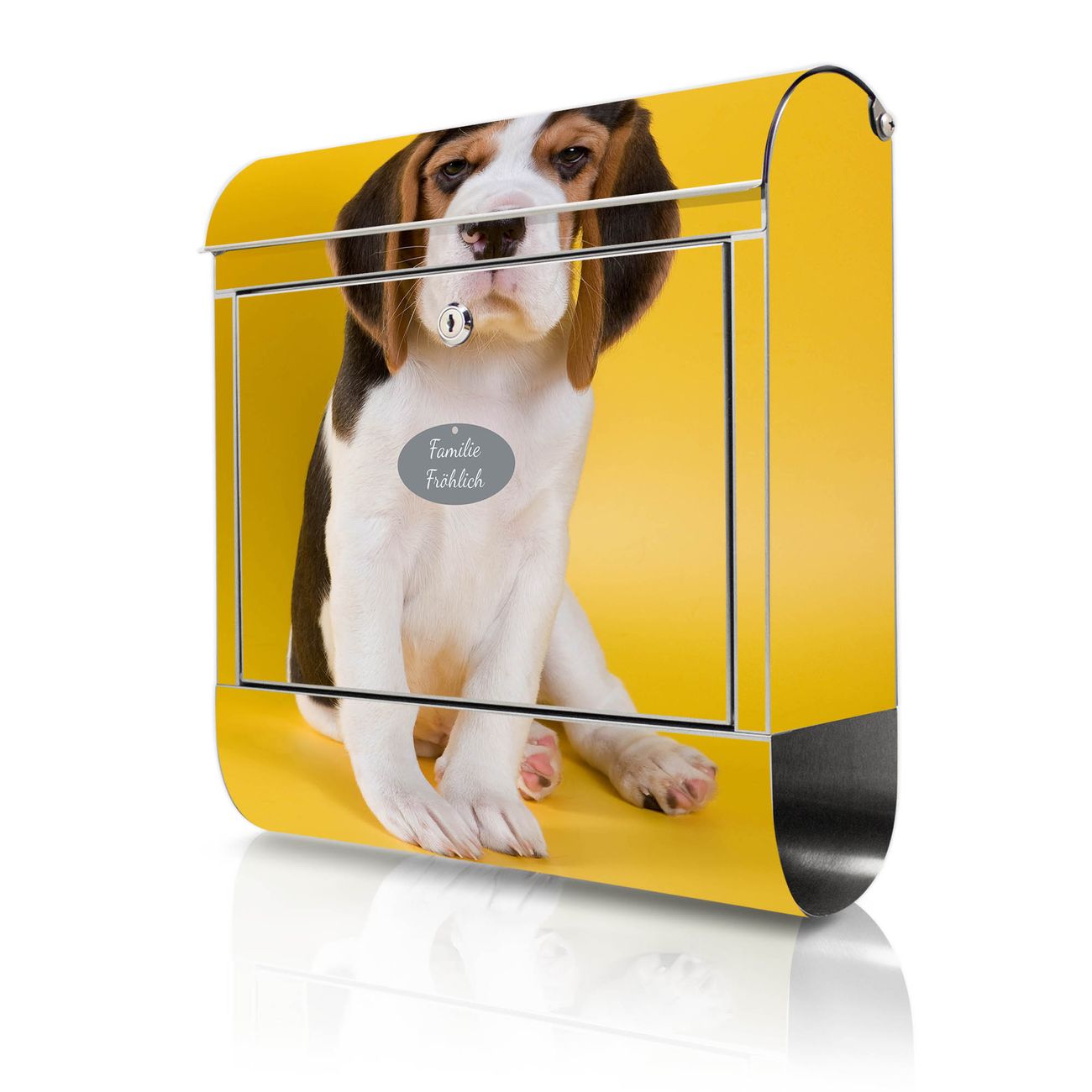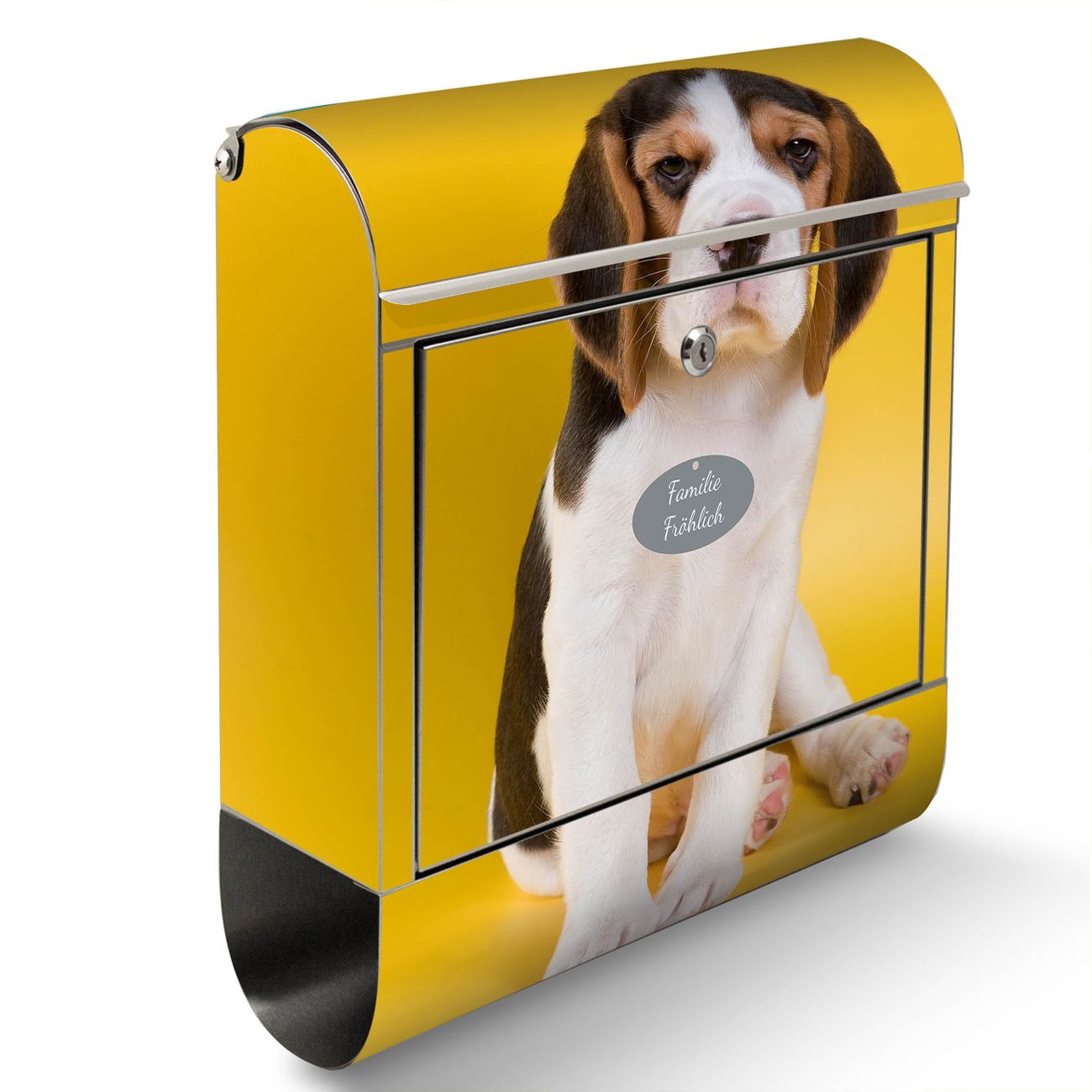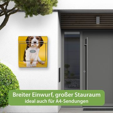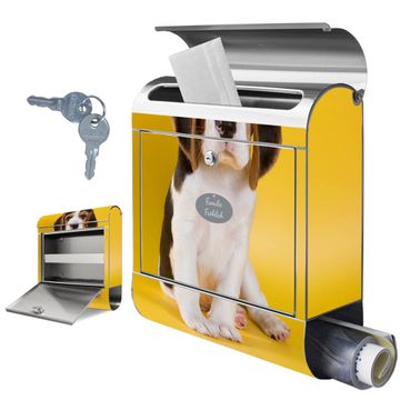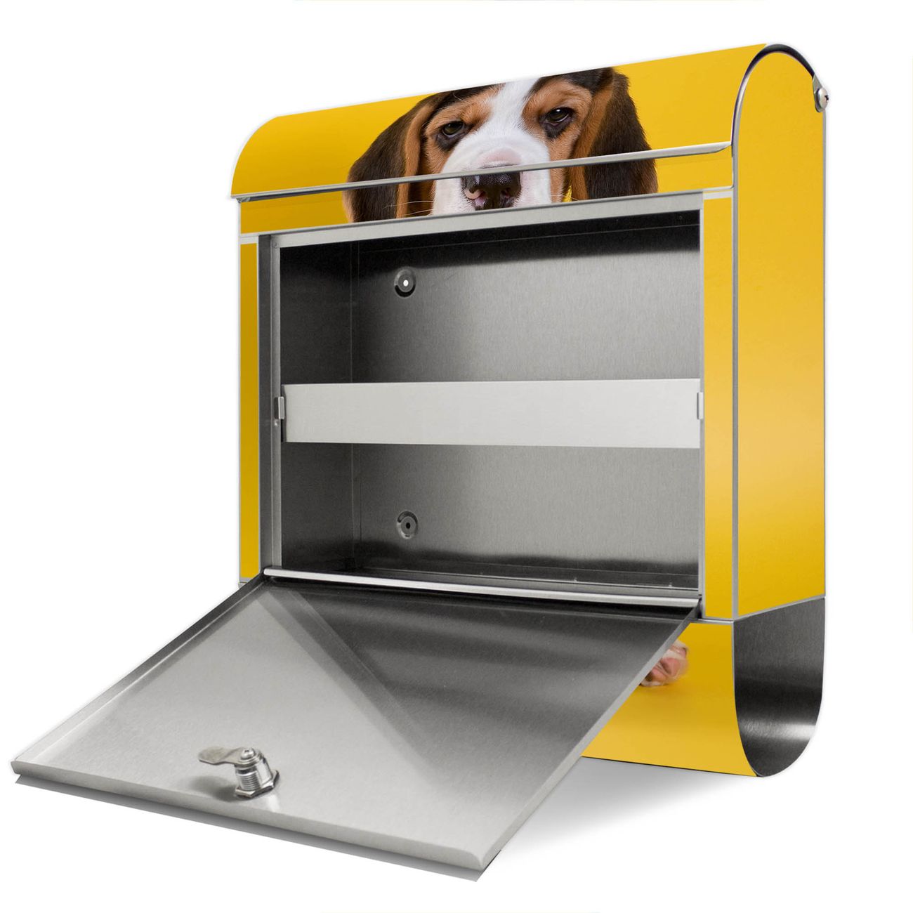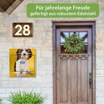 FUNKTION: Der banjado Edelstahl Briefkasten mit Motiv Motiv Beagle bietet Ihnen mit seinem Fassungsvermögen genügend Platz auch für große A4 Sendungen. Das integrierte Zeitungsfach eignet sich hervorragend um unkompliziert die Tageszeitung zu fassen. Auf Wunsch können Sie bei uns den passenden Ständer kaufen und so aus dem Wandbriefkasten einen Standbriefkasten machen. DESIGN: Der Motivbriefkasten hat ein sehr ansprechendes und ausgefallenes Design, damit entlocken Sie Ihren Nachbarn und dem Postboten ein Lächeln. Heben Sie Sich ab von der tristen grauen Masse ohne auf Funktionalität zu verzichten. DETAILS: Der Design Briefkasten mit Motiv Motiv Beagle besteht aus hochwertigem 18/0 Edelstahl. Das Motiv besteht aus einer wetter- und UV-resistenten Folie, die mit einem Schutzlaminat überzogen ist. Der Briefkasten wird mit Montagematerial und zwei Schlüsseln geliefert. NUTZEN: Sie können diesen Briefkasten sowohl als Wandbriefkasten montieren oder einen passenden Ständer auswählen und als Standbriefkasten einbetonieren. Die Größe bietet genügend Platz für Sendungen aller Art, das hochwertige Edelstahl ist rostfrei und die Motivfolie absolut wetterfest. SCHUTZ: Um Ihre Post optimal vor Witterungseinflüssen wie Starkregen zu schützen, empfehlen wir, den Briefkasten geschützt anzubringen. BANJADO: Ihr Briefkasten wird in Sachsen in einer kleinen Manufaktur von Hand veredelt. Die Motivfolie ist lösungsmittelfrei und schutzlaminiert, dies sorgt für einen langen Halt. Wir legen großen Wert auf die Verbindung von Funktionalität und Design. Sie erhalten Handarbeit aus Sachsen.