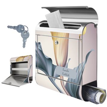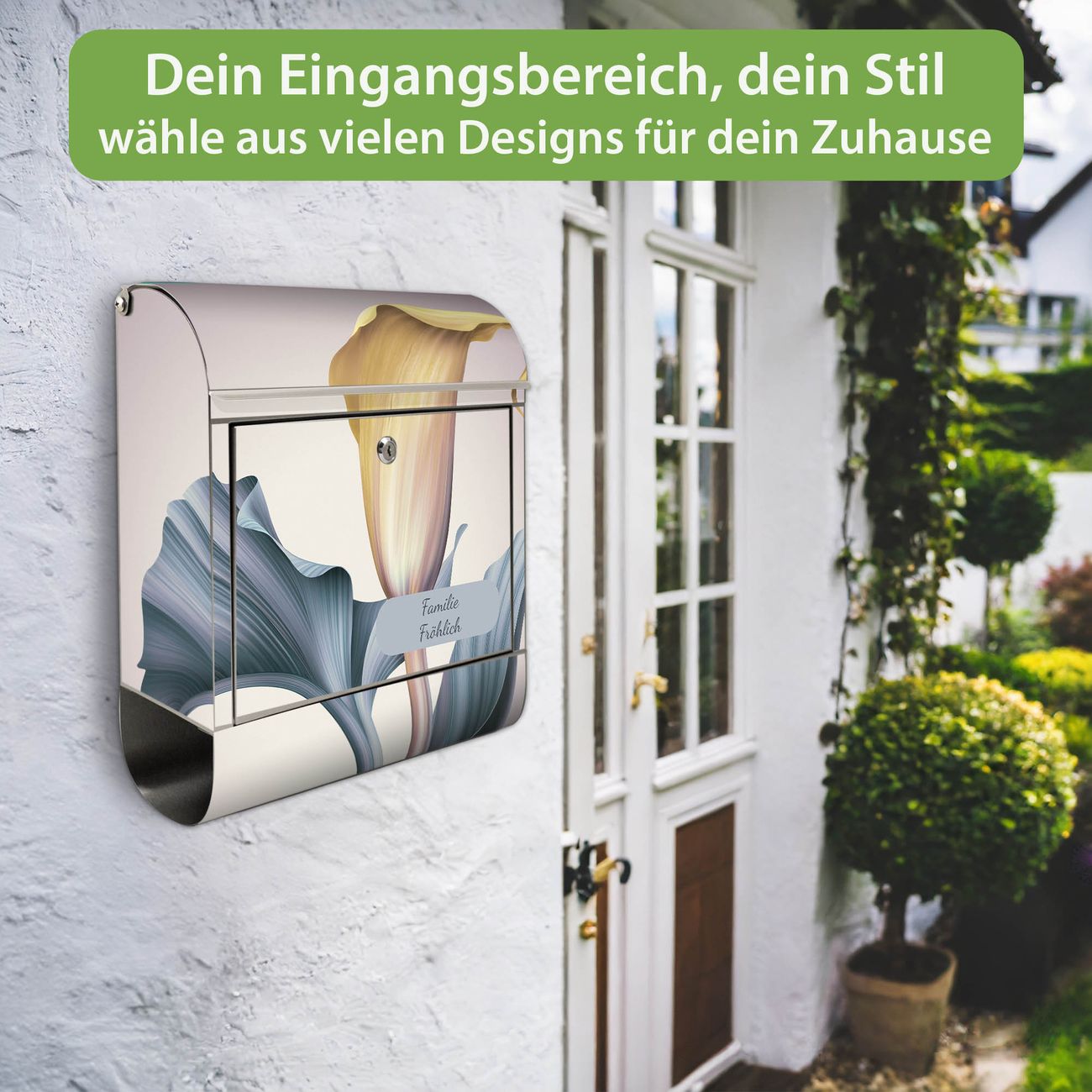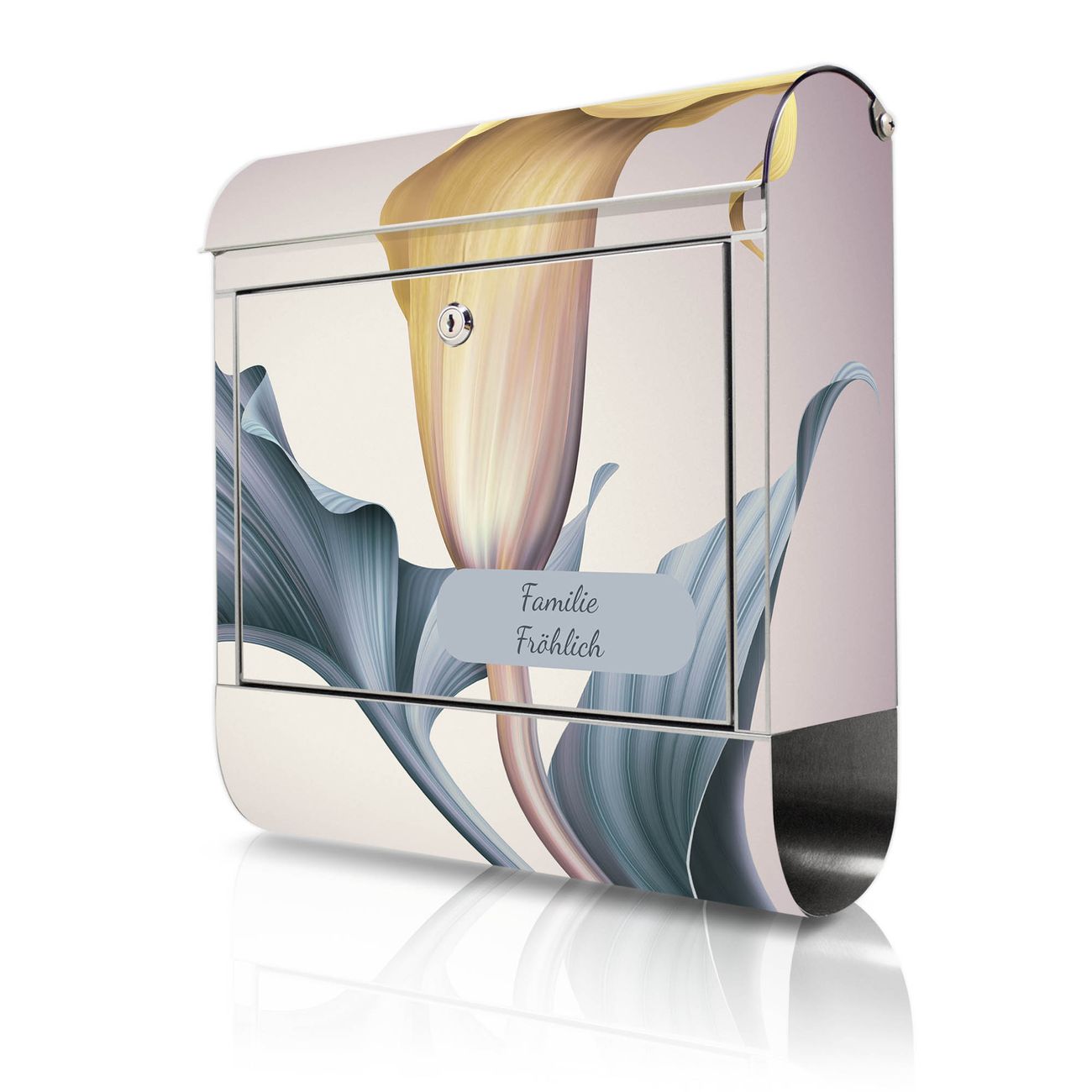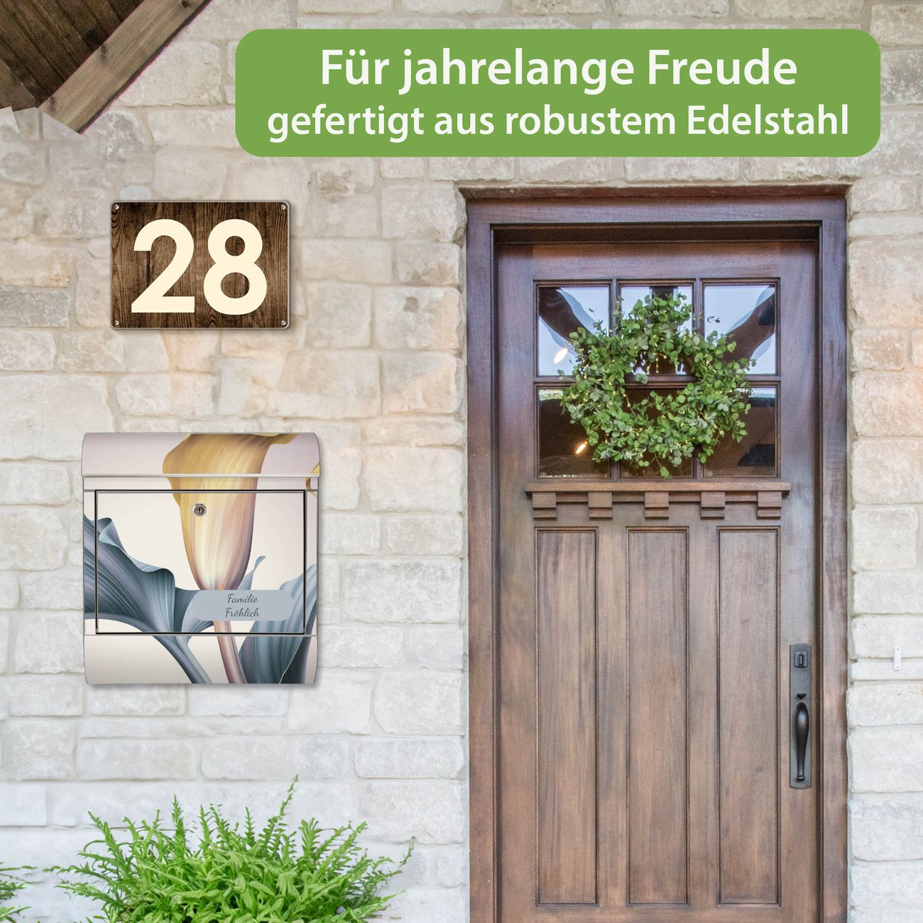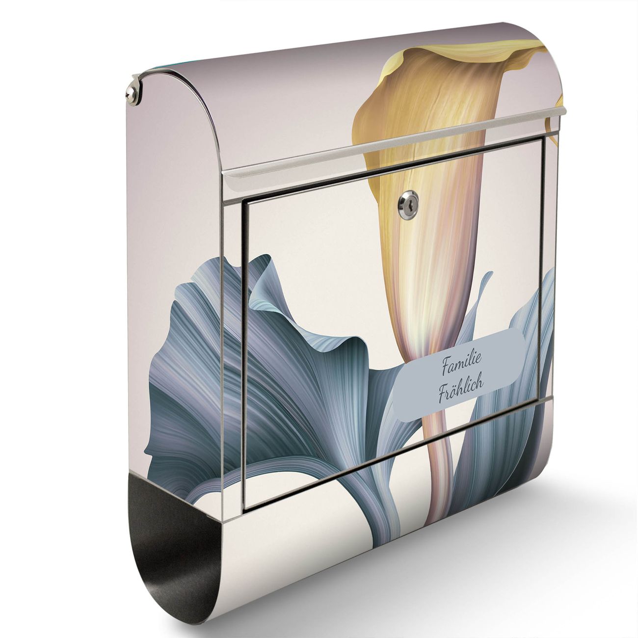 FUNKTION: Der banjado Edelstahl Briefkasten mit Motiv Motiv Calla bietet Ihnen mit seinem Fassungsvermögen genügend Platz auch für große A4 Sendungen. Das integrierte Zeitungsfach eignet sich hervorragend um unkompliziert die Tageszeitung zu fassen. Auf Wunsch können Sie bei uns den passenden Ständer kaufen und so aus dem Wandbriefkasten einen Standbriefkasten machen. DESIGN: Der Motivbriefkasten hat ein sehr ansprechendes und ausgefallenes Design, damit entlocken Sie Ihren Nachbarn und dem Postboten ein Lächeln. Heben Sie Sich ab von der tristen grauen Masse ohne auf Funktionalität zu verzichten. DETAILS: Der Design Briefkasten mit Motiv Motiv Calla besteht aus hochwertigem 18/0 Edelstahl. Das Motiv besteht aus einer wetter- und UV-resistenten Folie, die mit einem Schutzlaminat überzogen ist. Der Briefkasten wird mit Montagematerial und zwei Schlüsseln geliefert. NUTZEN: Sie können diesen Briefkasten sowohl als Wandbriefkasten montieren oder einen passenden Ständer auswählen und als Standbriefkasten einbetonieren. Die Größe bietet genügend Platz für Sendungen aller Art, das hochwertige Edelstahl ist rostfrei und die Motivfolie absolut wetterfest. SCHUTZ: Um Ihre Post optimal vor Witterungseinflüssen wie Starkregen zu schützen, empfehlen wir, den Briefkasten geschützt anzubringen. BANJADO: Ihr Briefkasten wird in Sachsen in einer kleinen Manufaktur von Hand veredelt. Die Motivfolie ist lösungsmittelfrei und schutzlaminiert, dies sorgt für einen langen Halt. Wir legen großen Wert auf die Verbindung von Funktionalität und Design. Sie erhalten Handarbeit aus Sachsen.