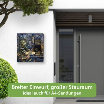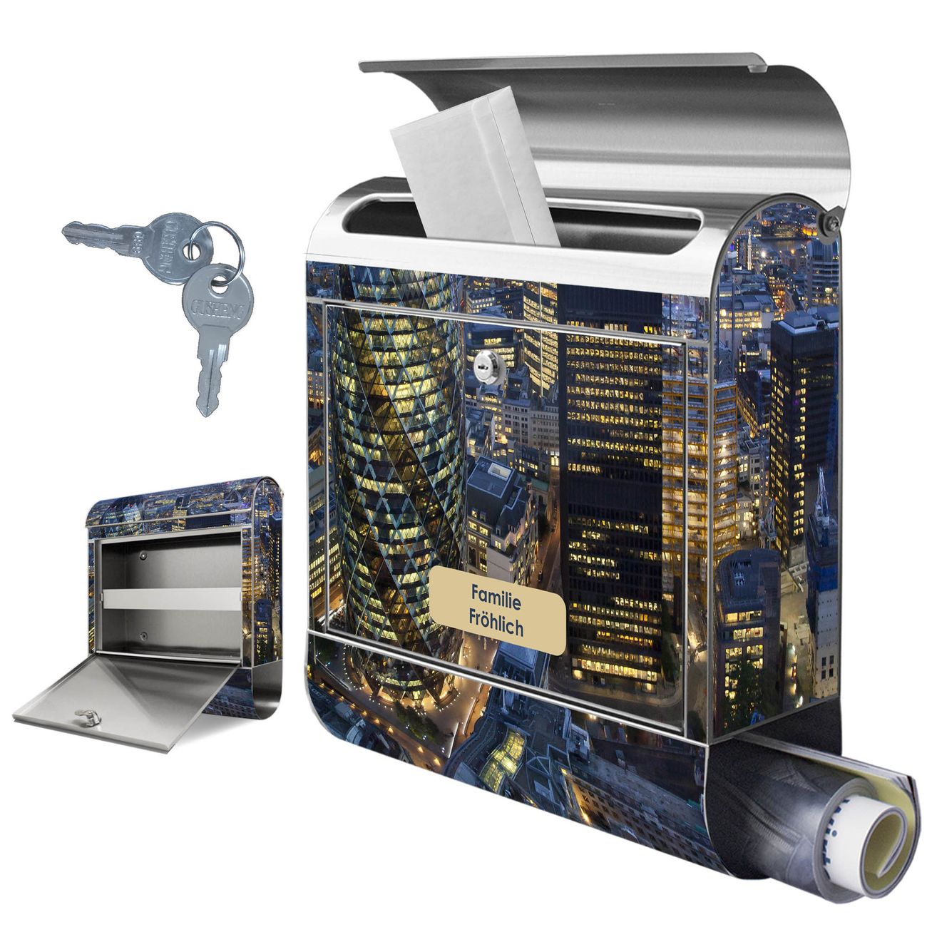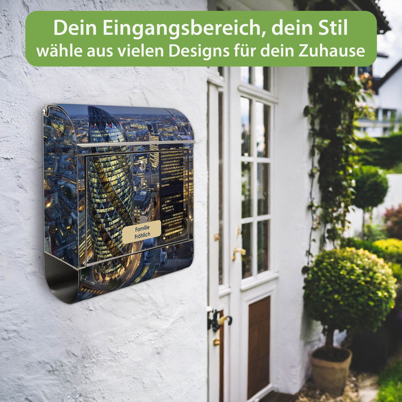 FUNKTION: Der banjado Edelstahl Briefkasten mit Motiv Motiv City Of London bietet Ihnen mit seinem Fassungsvermögen genügend Platz auch für große A4 Sendungen. Das integrierte Zeitungsfach eignet sich hervorragend um unkompliziert die Tageszeitung zu fassen. Auf Wunsch können Sie bei uns den passenden Ständer kaufen und so aus dem Wandbriefkasten einen Standbriefkasten machen. DESIGN: Der Motivbriefkasten hat ein sehr ansprechendes und ausgefallenes Design, damit entlocken Sie Ihren Nachbarn und dem Postboten ein Lächeln. Heben Sie Sich ab von der tristen grauen Masse ohne auf Funktionalität zu verzichten. DETAILS: Der Design Briefkasten mit Motiv Motiv City Of London besteht aus hochwertigem 18/0 Edelstahl. Das Motiv besteht aus einer wetter- und UV-resistenten Folie, die mit einem Schutzlaminat überzogen ist. Der Briefkasten wird mit Montagematerial und zwei Schlüsseln geliefert. NUTZEN: Sie können diesen Briefkasten sowohl als Wandbriefkasten montieren oder einen passenden Ständer auswählen und als Standbriefkasten einbetonieren. Die Größe bietet genügend Platz für Sendungen aller Art, das hochwertige Edelstahl ist rostfrei und die Motivfolie absolut wetterfest. SCHUTZ: Um Ihre Post optimal vor Witterungseinflüssen wie Starkregen zu schützen, empfehlen wir, den Briefkasten geschützt anzubringen. BANJADO: Ihr Briefkasten wird in Sachsen in einer kleinen Manufaktur von Hand veredelt. Die Motivfolie ist lösungsmittelfrei und schutzlaminiert, dies sorgt für einen langen Halt. Wir legen großen Wert auf die Verbindung von Funktionalität und Design. Sie erhalten Handarbeit aus Sachsen.