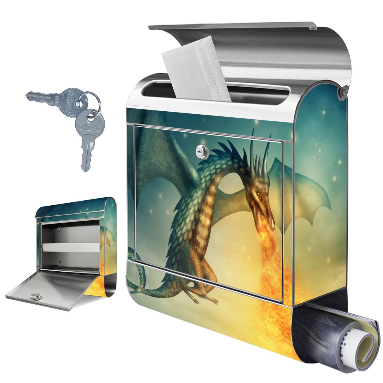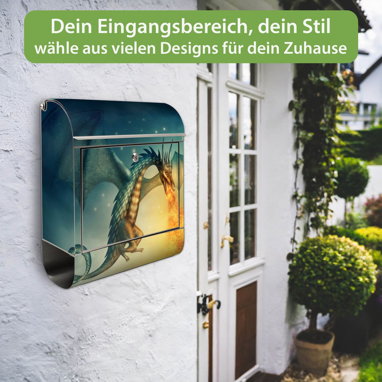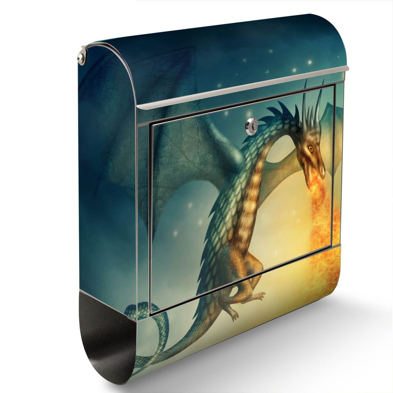 FUNKTION: Der banjado Edelstahl Briefkasten mit Motiv Motiv Drachen bietet Ihnen mit seinem Fassungsvermögen genügend Platz auch für große A4 Sendungen. Das integrierte Zeitungsfach eignet sich hervorragend um unkompliziert die Tageszeitung zu fassen. Auf Wunsch können Sie bei uns den passenden Ständer kaufen und so aus dem Wandbriefkasten einen Standbriefkasten machen. DESIGN: Der Motivbriefkasten hat ein sehr ansprechendes und ausgefallenes Design, damit entlocken Sie Ihren Nachbarn und dem Postboten ein Lächeln. Heben Sie Sich ab von der tristen grauen Masse ohne auf Funktionalität zu verzichten. DETAILS: Der Design Briefkasten mit Motiv Motiv Drachen besteht aus hochwertigem 18/0 Edelstahl. Das Motiv besteht aus einer wetter- und UV-resistenten Folie, die mit einem Schutzlaminat überzogen ist. Der Briefkasten wird mit Montagematerial und zwei Schlüsseln geliefert. NUTZEN: Sie können diesen Briefkasten sowohl als Wandbriefkasten montieren oder einen passenden Ständer auswählen und als Standbriefkasten einbetonieren. Die Größe bietet genügend Platz für Sendungen aller Art, das hochwertige Edelstahl ist rostfrei und die Motivfolie absolut wetterfest. SCHUTZ: Um Ihre Post optimal vor Witterungseinflüssen wie Starkregen zu schützen, empfehlen wir, den Briefkasten geschützt anzubringen. BANJADO: Ihr Briefkasten wird in Sachsen in einer kleinen Manufaktur von Hand veredelt. Die Motivfolie ist lösungsmittelfrei und schutzlaminiert, dies sorgt für einen langen Halt. Wir legen großen Wert auf die Verbindung von Funktionalität und Design. Sie erhalten Handarbeit aus Sachsen.