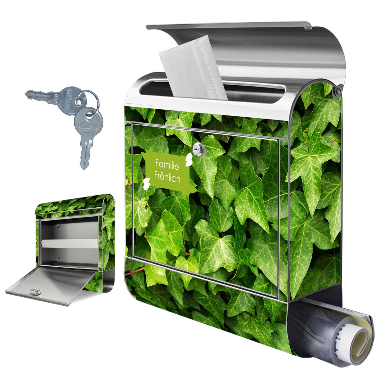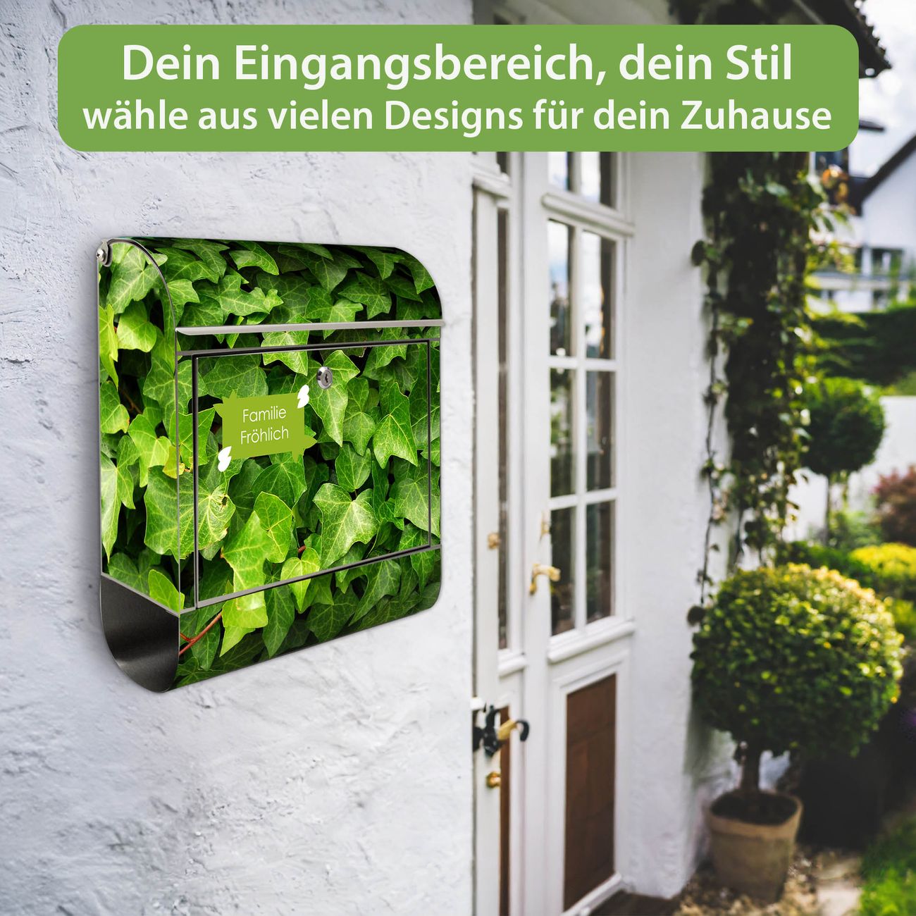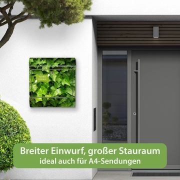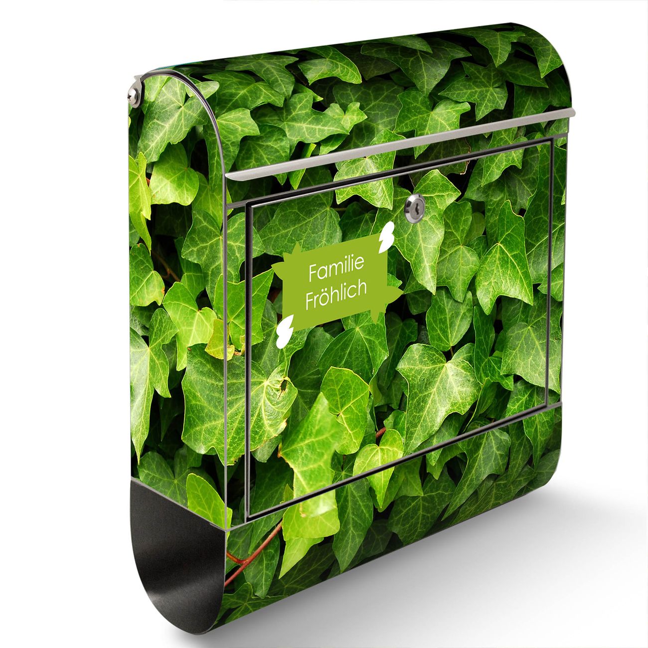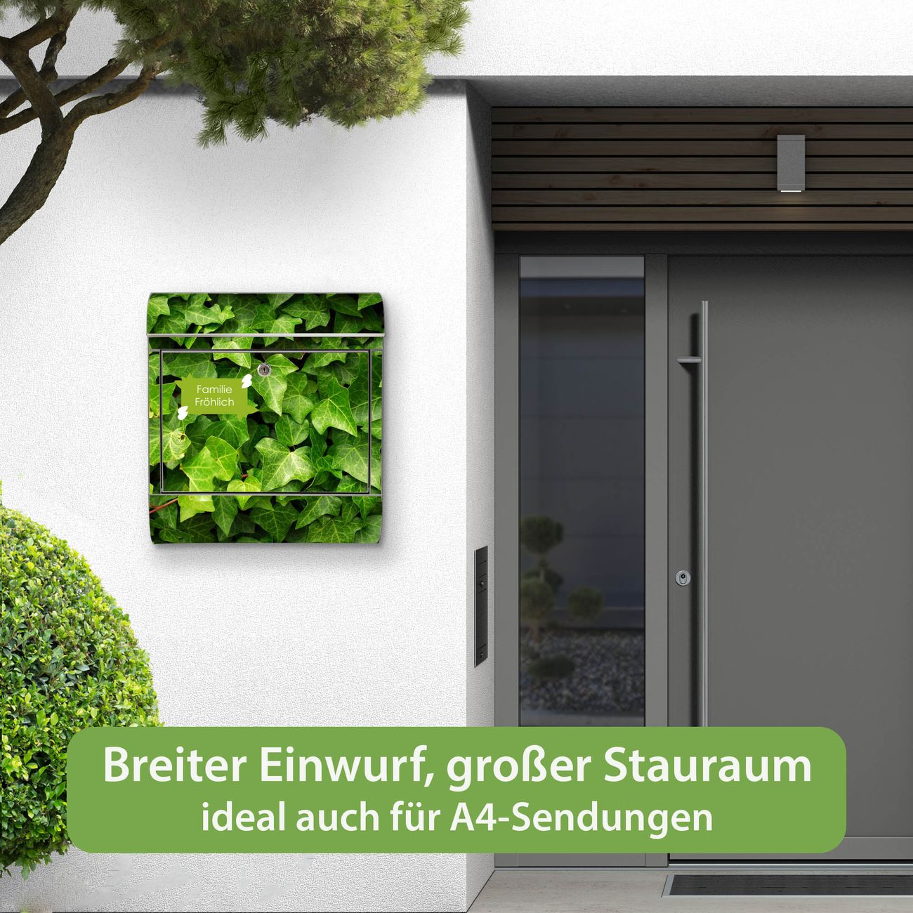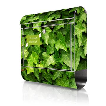 FUNKTION: Der banjado Edelstahl Briefkasten mit Motiv Motiv Efeu bietet Ihnen mit seinem Fassungsvermögen genügend Platz auch für große A4 Sendungen. Das integrierte Zeitungsfach eignet sich hervorragend um unkompliziert die Tageszeitung zu fassen. Auf Wunsch können Sie bei uns den passenden Ständer kaufen und so aus dem Wandbriefkasten einen Standbriefkasten machen. DESIGN: Der Motivbriefkasten hat ein sehr ansprechendes und ausgefallenes Design, damit entlocken Sie Ihren Nachbarn und dem Postboten ein Lächeln. Heben Sie Sich ab von der tristen grauen Masse ohne auf Funktionalität zu verzichten. DETAILS: Der Design Briefkasten mit Motiv Motiv Efeu besteht aus hochwertigem 18/0 Edelstahl. Das Motiv besteht aus einer wetter- und UV-resistenten Folie, die mit einem Schutzlaminat überzogen ist. Der Briefkasten wird mit Montagematerial und zwei Schlüsseln geliefert. NUTZEN: Sie können diesen Briefkasten sowohl als Wandbriefkasten montieren oder einen passenden Ständer auswählen und als Standbriefkasten einbetonieren. Die Größe bietet genügend Platz für Sendungen aller Art, das hochwertige Edelstahl ist rostfrei und die Motivfolie absolut wetterfest. SCHUTZ: Um Ihre Post optimal vor Witterungseinflüssen wie Starkregen zu schützen, empfehlen wir, den Briefkasten geschützt anzubringen. BANJADO: Ihr Briefkasten wird in Sachsen in einer kleinen Manufaktur von Hand veredelt. Die Motivfolie ist lösungsmittelfrei und schutzlaminiert, dies sorgt für einen langen Halt. Wir legen großen Wert auf die Verbindung von Funktionalität und Design. Sie erhalten Handarbeit aus Sachsen.