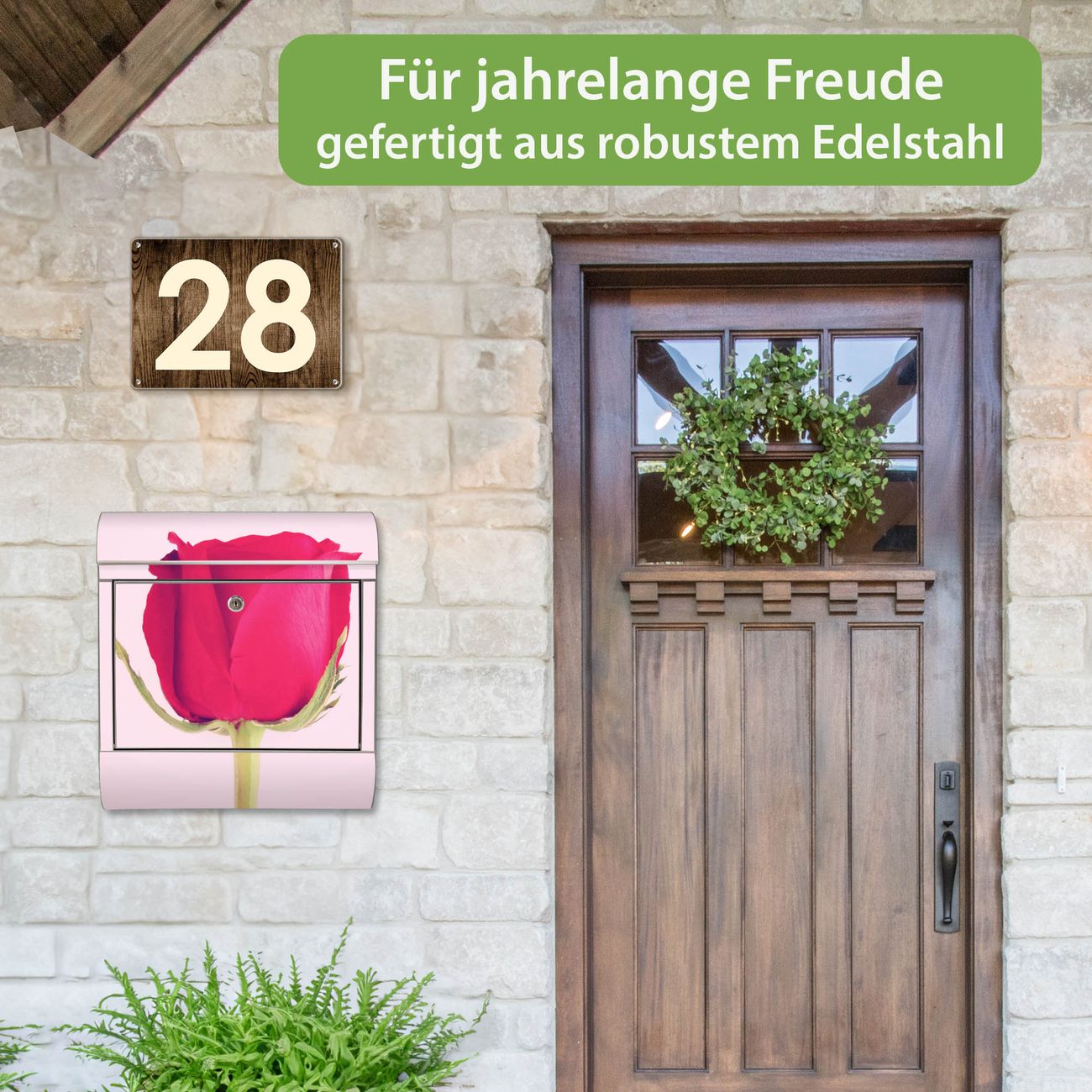 FUNKTION: Der banjado Edelstahl Briefkasten mit Motiv Motiv Einzelne Rose bietet Ihnen mit seinem Fassungsvermögen genügend Platz auch für große A4 Sendungen. Das integrierte Zeitungsfach eignet sich hervorragend um unkompliziert die Tageszeitung zu fassen. Auf Wunsch können Sie bei uns den passenden Ständer kaufen und so aus dem Wandbriefkasten einen Standbriefkasten machen. DESIGN: Der Motivbriefkasten hat ein sehr ansprechendes und ausgefallenes Design, damit entlocken Sie Ihren Nachbarn und dem Postboten ein Lächeln. Heben Sie Sich ab von der tristen grauen Masse ohne auf Funktionalität zu verzichten. DETAILS: Der Design Briefkasten mit Motiv Motiv Einzelne Rose besteht aus hochwertigem 18/0 Edelstahl. Das Motiv besteht aus einer wetter- und UV-resistenten Folie, die mit einem Schutzlaminat überzogen ist. Der Briefkasten wird mit Montagematerial und zwei Schlüsseln geliefert. NUTZEN: Sie können diesen Briefkasten sowohl als Wandbriefkasten montieren oder einen passenden Ständer auswählen und als Standbriefkasten einbetonieren. Die Größe bietet genügend Platz für Sendungen aller Art, das hochwertige Edelstahl ist rostfrei und die Motivfolie absolut wetterfest. SCHUTZ: Um Ihre Post optimal vor Witterungseinflüssen wie Starkregen zu schützen, empfehlen wir, den Briefkasten geschützt anzubringen. BANJADO: Ihr Briefkasten wird in Sachsen in einer kleinen Manufaktur von Hand veredelt. Die Motivfolie ist lösungsmittelfrei und schutzlaminiert, dies sorgt für einen langen Halt. Wir legen großen Wert auf die Verbindung von Funktionalität und Design. Sie erhalten Handarbeit aus Sachsen.