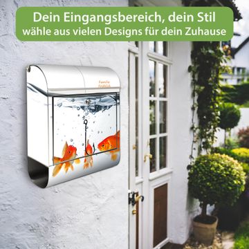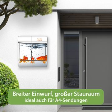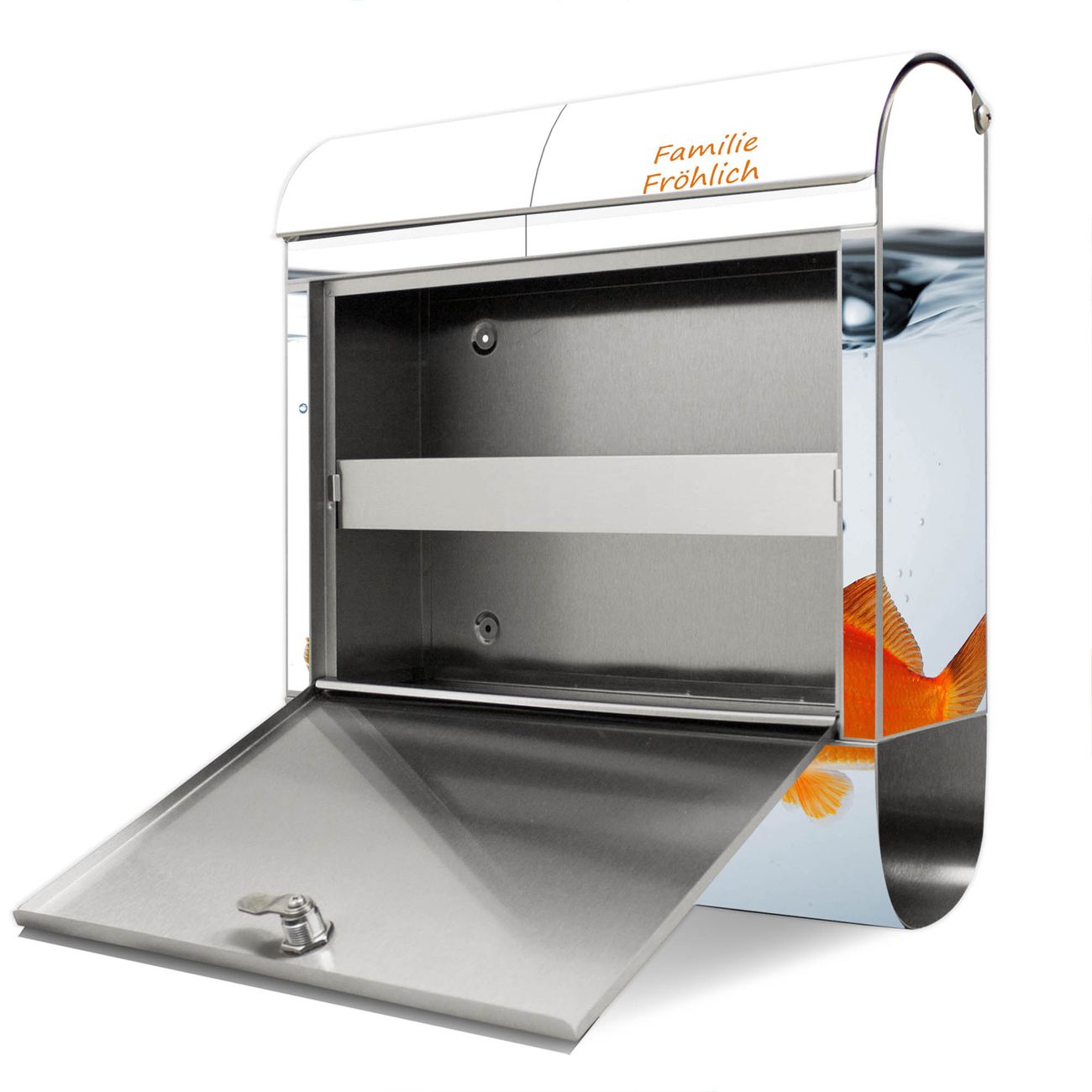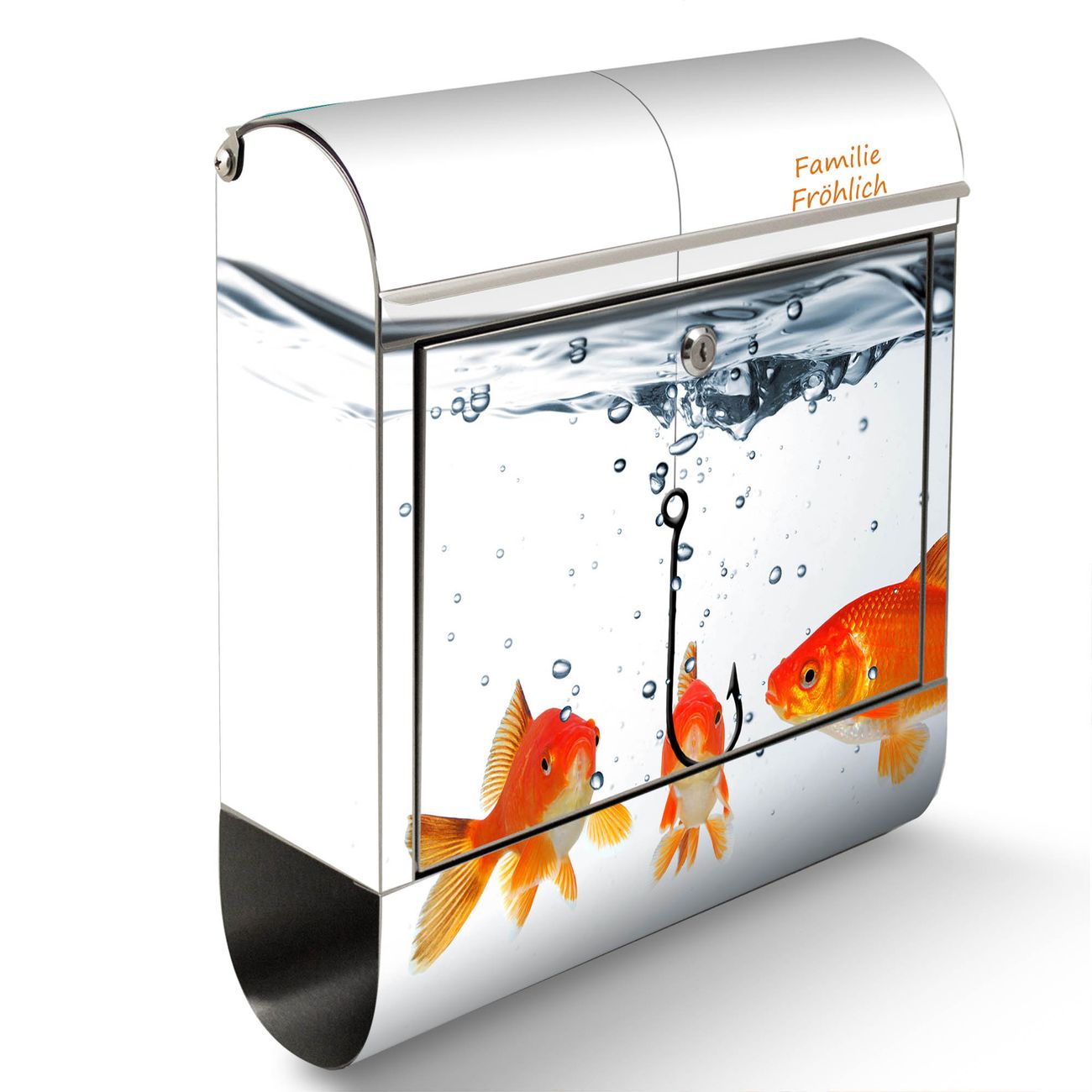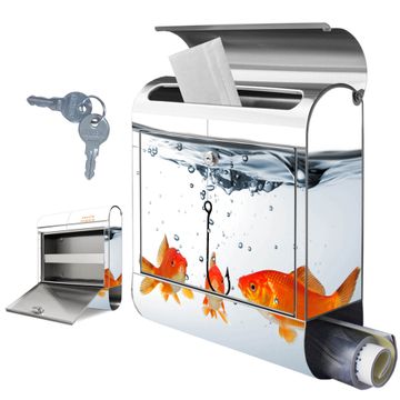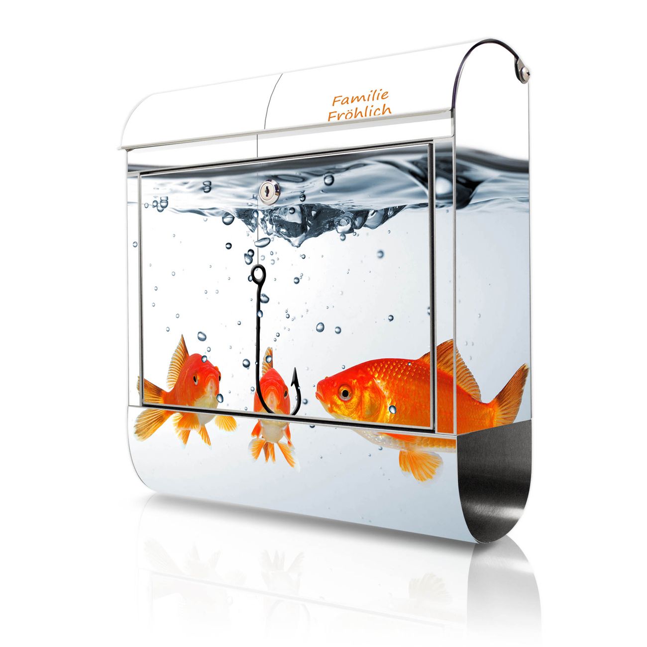 FUNKTION: Der banjado Edelstahl Briefkasten mit Motiv Motiv Fische bietet Ihnen mit seinem Fassungsvermögen genügend Platz auch für große A4 Sendungen. Das integrierte Zeitungsfach eignet sich hervorragend um unkompliziert die Tageszeitung zu fassen. Auf Wunsch können Sie bei uns den passenden Ständer kaufen und so aus dem Wandbriefkasten einen Standbriefkasten machen. DESIGN: Der Motivbriefkasten hat ein sehr ansprechendes und ausgefallenes Design, damit entlocken Sie Ihren Nachbarn und dem Postboten ein Lächeln. Heben Sie Sich ab von der tristen grauen Masse ohne auf Funktionalität zu verzichten. DETAILS: Der Design Briefkasten mit Motiv Motiv Fische besteht aus hochwertigem 18/0 Edelstahl. Das Motiv besteht aus einer wetter- und UV-resistenten Folie, die mit einem Schutzlaminat überzogen ist. Der Briefkasten wird mit Montagematerial und zwei Schlüsseln geliefert. NUTZEN: Sie können diesen Briefkasten sowohl als Wandbriefkasten montieren oder einen passenden Ständer auswählen und als Standbriefkasten einbetonieren. Die Größe bietet genügend Platz für Sendungen aller Art, das hochwertige Edelstahl ist rostfrei und die Motivfolie absolut wetterfest. SCHUTZ: Um Ihre Post optimal vor Witterungseinflüssen wie Starkregen zu schützen, empfehlen wir, den Briefkasten geschützt anzubringen. BANJADO: Ihr Briefkasten wird in Sachsen in einer kleinen Manufaktur von Hand veredelt. Die Motivfolie ist lösungsmittelfrei und schutzlaminiert, dies sorgt für einen langen Halt. Wir legen großen Wert auf die Verbindung von Funktionalität und Design. Sie erhalten Handarbeit aus Sachsen.