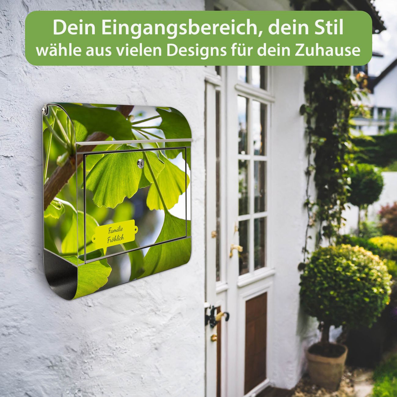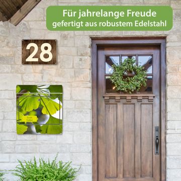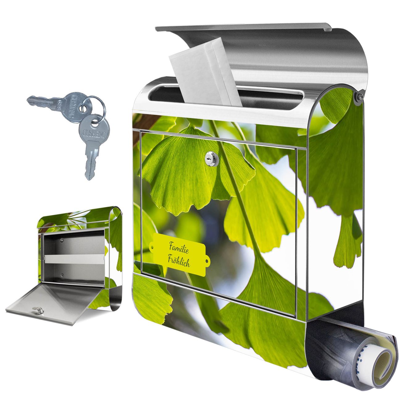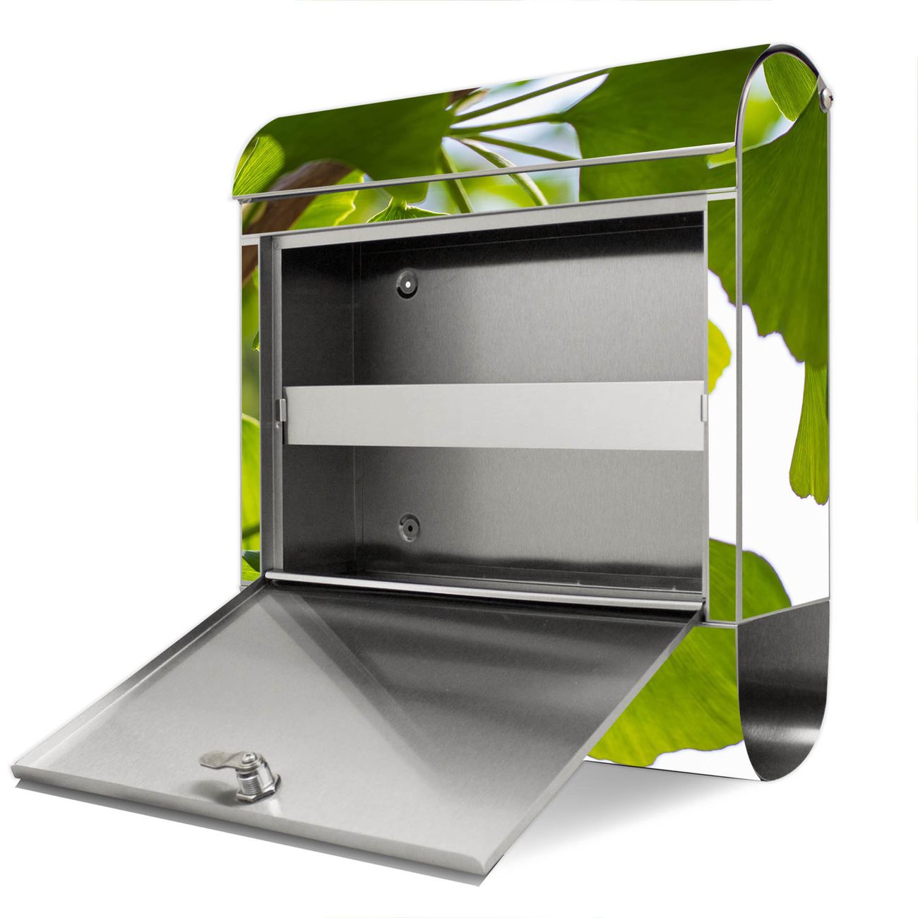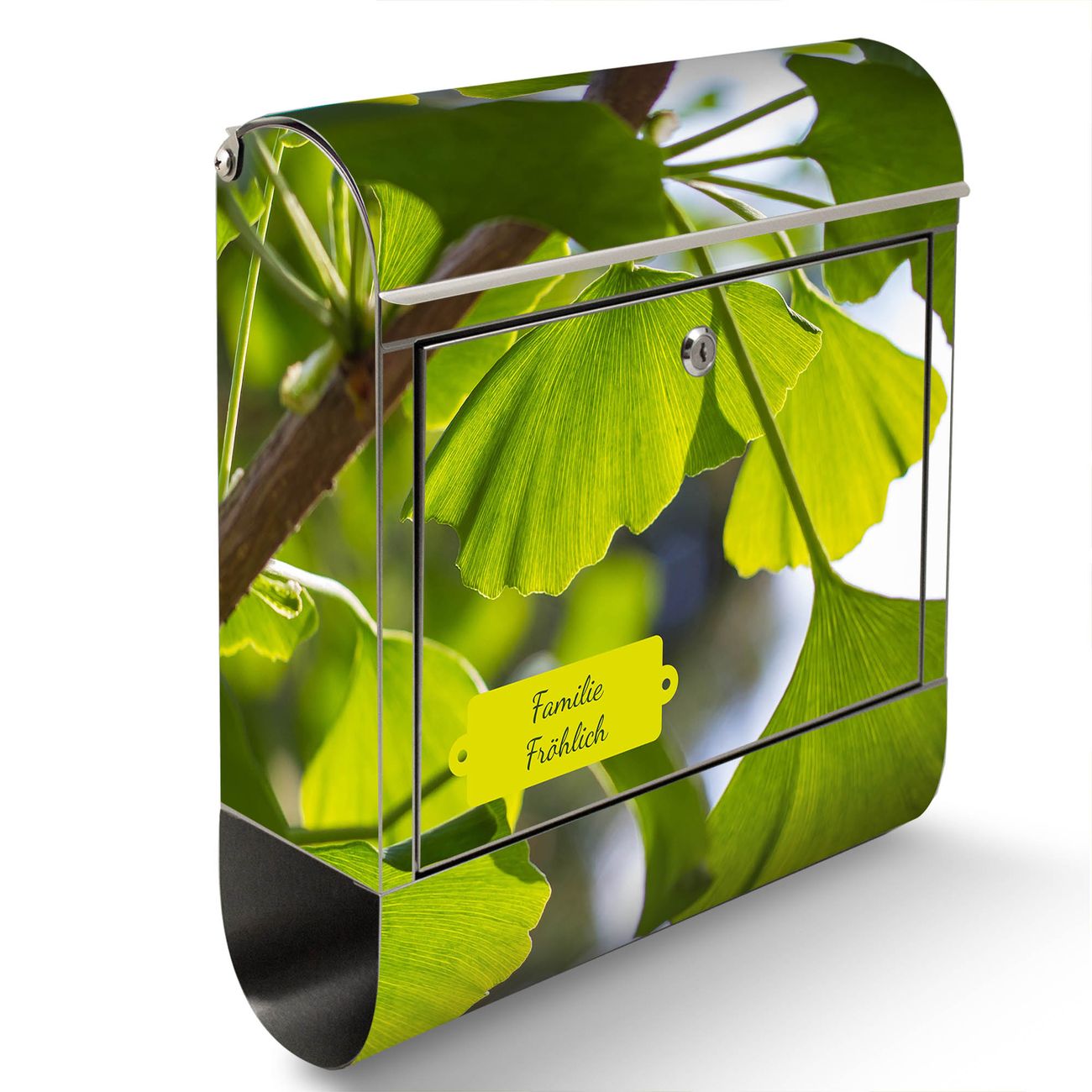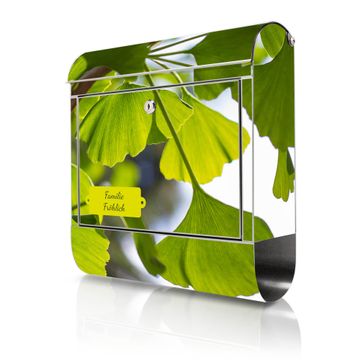 FUNKTION: Der banjado Edelstahl Briefkasten mit Motiv Motiv Gingko bietet Ihnen mit seinem Fassungsvermögen genügend Platz auch für große A4 Sendungen. Das integrierte Zeitungsfach eignet sich hervorragend um unkompliziert die Tageszeitung zu fassen. Auf Wunsch können Sie bei uns den passenden Ständer kaufen und so aus dem Wandbriefkasten einen Standbriefkasten machen. DESIGN: Der Motivbriefkasten hat ein sehr ansprechendes und ausgefallenes Design, damit entlocken Sie Ihren Nachbarn und dem Postboten ein Lächeln. Heben Sie Sich ab von der tristen grauen Masse ohne auf Funktionalität zu verzichten. DETAILS: Der Design Briefkasten mit Motiv Motiv Gingko besteht aus hochwertigem 18/0 Edelstahl. Das Motiv besteht aus einer wetter- und UV-resistenten Folie, die mit einem Schutzlaminat überzogen ist. Der Briefkasten wird mit Montagematerial und zwei Schlüsseln geliefert. NUTZEN: Sie können diesen Briefkasten sowohl als Wandbriefkasten montieren oder einen passenden Ständer auswählen und als Standbriefkasten einbetonieren. Die Größe bietet genügend Platz für Sendungen aller Art, das hochwertige Edelstahl ist rostfrei und die Motivfolie absolut wetterfest. SCHUTZ: Um Ihre Post optimal vor Witterungseinflüssen wie Starkregen zu schützen, empfehlen wir, den Briefkasten geschützt anzubringen. BANJADO: Ihr Briefkasten wird in Sachsen in einer kleinen Manufaktur von Hand veredelt. Die Motivfolie ist lösungsmittelfrei und schutzlaminiert, dies sorgt für einen langen Halt. Wir legen großen Wert auf die Verbindung von Funktionalität und Design. Sie erhalten Handarbeit aus Sachsen.