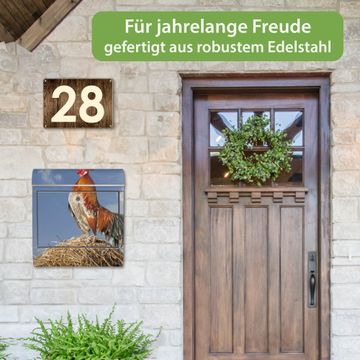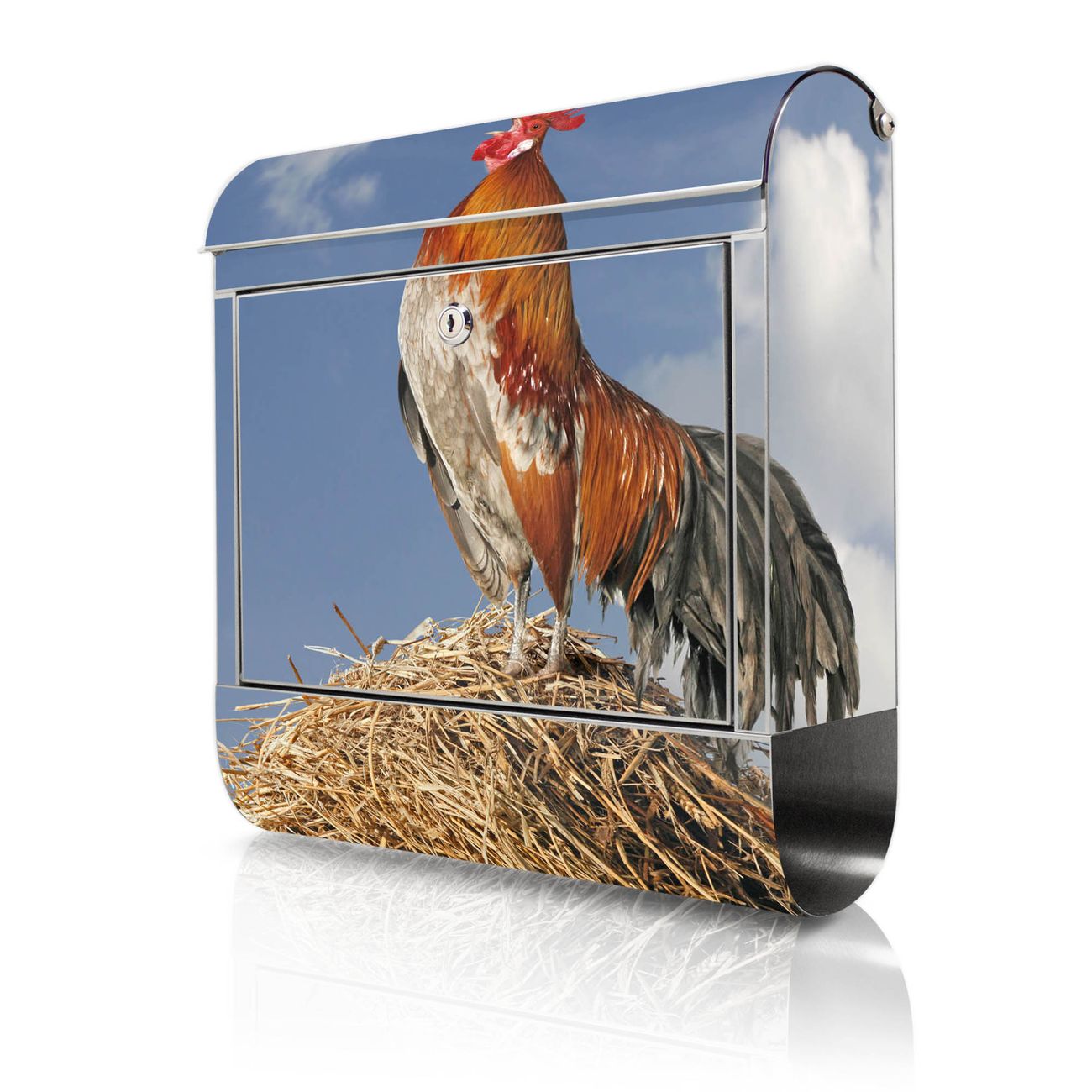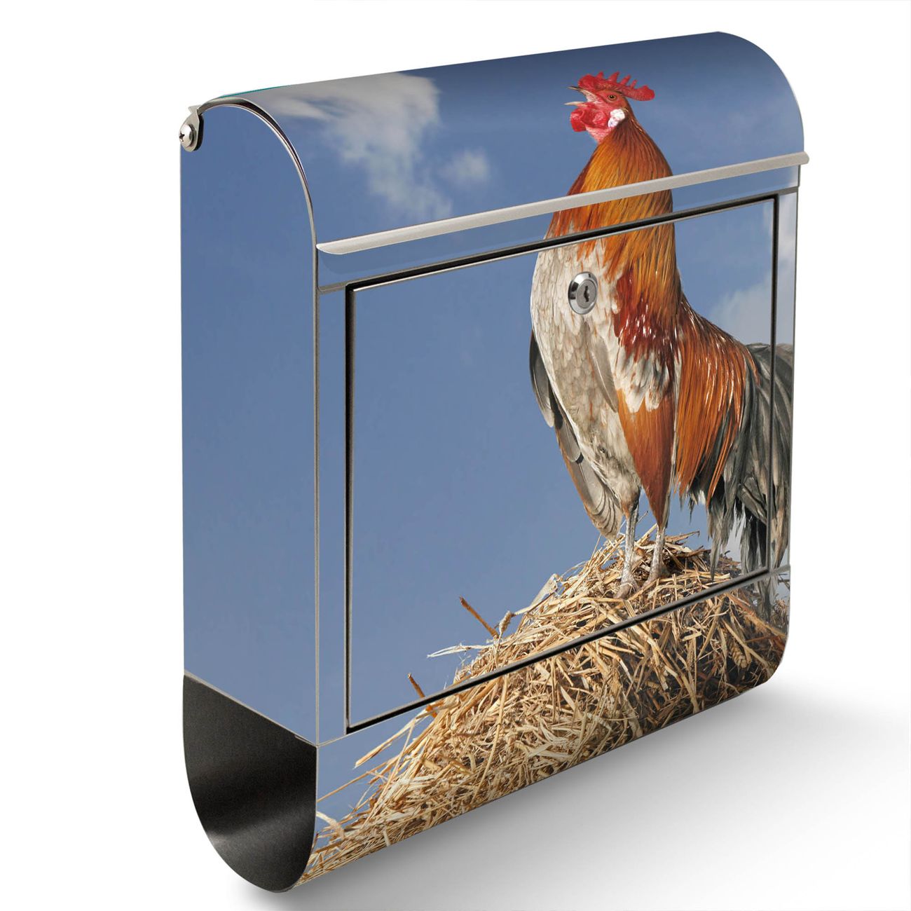 FUNKTION: Der banjado Edelstahl Briefkasten mit Motiv Motiv Hahn bietet Ihnen mit seinem Fassungsvermögen genügend Platz auch für große A4 Sendungen. Das integrierte Zeitungsfach eignet sich hervorragend um unkompliziert die Tageszeitung zu fassen. Auf Wunsch können Sie bei uns den passenden Ständer kaufen und so aus dem Wandbriefkasten einen Standbriefkasten machen. DESIGN: Der Motivbriefkasten hat ein sehr ansprechendes und ausgefallenes Design, damit entlocken Sie Ihren Nachbarn und dem Postboten ein Lächeln. Heben Sie Sich ab von der tristen grauen Masse ohne auf Funktionalität zu verzichten. DETAILS: Der Design Briefkasten mit Motiv Motiv Hahn besteht aus hochwertigem 18/0 Edelstahl. Das Motiv besteht aus einer wetter- und UV-resistenten Folie, die mit einem Schutzlaminat überzogen ist. Der Briefkasten wird mit Montagematerial und zwei Schlüsseln geliefert. NUTZEN: Sie können diesen Briefkasten sowohl als Wandbriefkasten montieren oder einen passenden Ständer auswählen und als Standbriefkasten einbetonieren. Die Größe bietet genügend Platz für Sendungen aller Art, das hochwertige Edelstahl ist rostfrei und die Motivfolie absolut wetterfest. SCHUTZ: Um Ihre Post optimal vor Witterungseinflüssen wie Starkregen zu schützen, empfehlen wir, den Briefkasten geschützt anzubringen. BANJADO: Ihr Briefkasten wird in Sachsen in einer kleinen Manufaktur von Hand veredelt. Die Motivfolie ist lösungsmittelfrei und schutzlaminiert, dies sorgt für einen langen Halt. Wir legen großen Wert auf die Verbindung von Funktionalität und Design. Sie erhalten Handarbeit aus Sachsen.