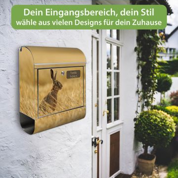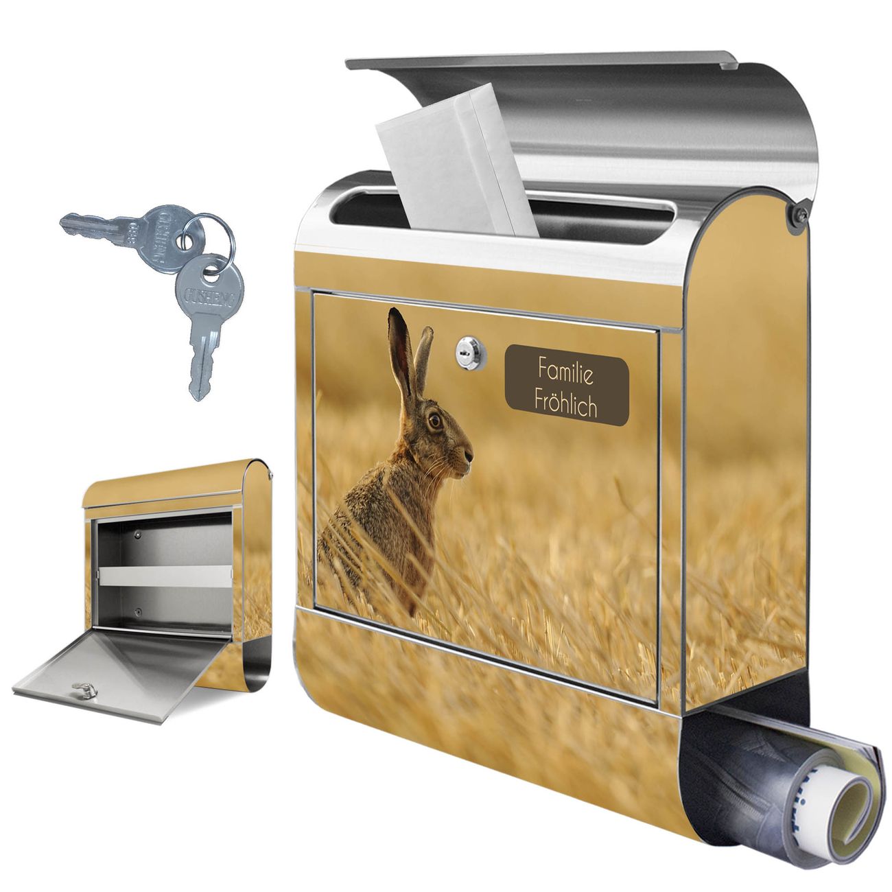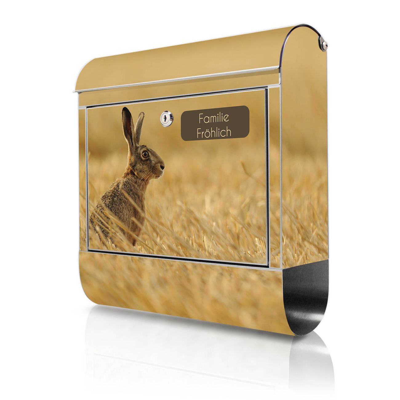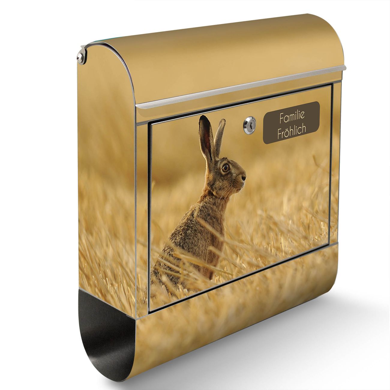 FUNKTION: Der banjado Edelstahl Briefkasten mit Motiv Motiv Hase bietet Ihnen mit seinem Fassungsvermögen genügend Platz auch für große A4 Sendungen. Das integrierte Zeitungsfach eignet sich hervorragend um unkompliziert die Tageszeitung zu fassen. Auf Wunsch können Sie bei uns den passenden Ständer kaufen und so aus dem Wandbriefkasten einen Standbriefkasten machen. DESIGN: Der Motivbriefkasten hat ein sehr ansprechendes und ausgefallenes Design, damit entlocken Sie Ihren Nachbarn und dem Postboten ein Lächeln. Heben Sie Sich ab von der tristen grauen Masse ohne auf Funktionalität zu verzichten. DETAILS: Der Design Briefkasten mit Motiv Motiv Hase besteht aus hochwertigem 18/0 Edelstahl. Das Motiv besteht aus einer wetter- und UV-resistenten Folie, die mit einem Schutzlaminat überzogen ist. Der Briefkasten wird mit Montagematerial und zwei Schlüsseln geliefert. NUTZEN: Sie können diesen Briefkasten sowohl als Wandbriefkasten montieren oder einen passenden Ständer auswählen und als Standbriefkasten einbetonieren. Die Größe bietet genügend Platz für Sendungen aller Art, das hochwertige Edelstahl ist rostfrei und die Motivfolie absolut wetterfest. SCHUTZ: Um Ihre Post optimal vor Witterungseinflüssen wie Starkregen zu schützen, empfehlen wir, den Briefkasten geschützt anzubringen. BANJADO: Ihr Briefkasten wird in Sachsen in einer kleinen Manufaktur von Hand veredelt. Die Motivfolie ist lösungsmittelfrei und schutzlaminiert, dies sorgt für einen langen Halt. Wir legen großen Wert auf die Verbindung von Funktionalität und Design. Sie erhalten Handarbeit aus Sachsen.