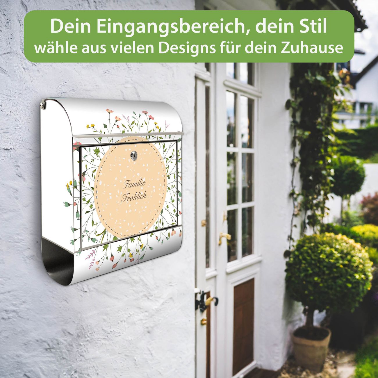 FUNKTION: Der banjado Edelstahl Briefkasten mit Motiv Motiv Hibiskus Kreis bietet Ihnen mit seinem Fassungsvermögen genügend Platz auch für große A4 Sendungen. Das integrierte Zeitungsfach eignet sich hervorragend um unkompliziert die Tageszeitung zu fassen. Auf Wunsch können Sie bei uns den passenden Ständer kaufen und so aus dem Wandbriefkasten einen Standbriefkasten machen. DESIGN: Der Motivbriefkasten hat ein sehr ansprechendes und ausgefallenes Design, damit entlocken Sie Ihren Nachbarn und dem Postboten ein Lächeln. Heben Sie Sich ab von der tristen grauen Masse ohne auf Funktionalität zu verzichten. DETAILS: Der Design Briefkasten mit Motiv Motiv Hibiskus Kreis besteht aus hochwertigem 18/0 Edelstahl. Das Motiv besteht aus einer wetter- und UV-resistenten Folie, die mit einem Schutzlaminat überzogen ist. Der Briefkasten wird mit Montagematerial und zwei Schlüsseln geliefert. NUTZEN: Sie können diesen Briefkasten sowohl als Wandbriefkasten montieren oder einen passenden Ständer auswählen und als Standbriefkasten einbetonieren. Die Größe bietet genügend Platz für Sendungen aller Art, das hochwertige Edelstahl ist rostfrei und die Motivfolie absolut wetterfest. SCHUTZ: Um Ihre Post optimal vor Witterungseinflüssen wie Starkregen zu schützen, empfehlen wir, den Briefkasten geschützt anzubringen. BANJADO: Ihr Briefkasten wird in Sachsen in einer kleinen Manufaktur von Hand veredelt. Die Motivfolie ist lösungsmittelfrei und schutzlaminiert, dies sorgt für einen langen Halt. Wir legen großen Wert auf die Verbindung von Funktionalität und Design. Sie erhalten Handarbeit aus Sachsen.