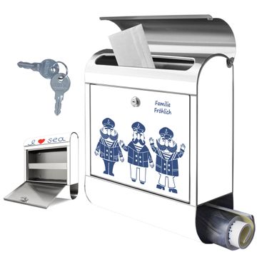 FUNKTION: Der banjado Edelstahl Briefkasten mit Motiv Motiv I Love Sea bietet Ihnen mit seinem Fassungsvermögen genügend Platz auch für große A4 Sendungen. Das integrierte Zeitungsfach eignet sich hervorragend um unkompliziert die Tageszeitung zu fassen. Auf Wunsch können Sie bei uns den passenden Ständer kaufen und so aus dem Wandbriefkasten einen Standbriefkasten machen. DESIGN: Der Motivbriefkasten hat ein sehr ansprechendes und ausgefallenes Design, damit entlocken Sie Ihren Nachbarn und dem Postboten ein Lächeln. Heben Sie Sich ab von der tristen grauen Masse ohne auf Funktionalität zu verzichten. DETAILS: Der Design Briefkasten mit Motiv Motiv I Love Sea besteht aus hochwertigem 18/0 Edelstahl. Das Motiv besteht aus einer wetter- und UV-resistenten Folie, die mit einem Schutzlaminat überzogen ist. Der Briefkasten wird mit Montagematerial und zwei Schlüsseln geliefert. NUTZEN: Sie können diesen Briefkasten sowohl als Wandbriefkasten montieren oder einen passenden Ständer auswählen und als Standbriefkasten einbetonieren. Die Größe bietet genügend Platz für Sendungen aller Art, das hochwertige Edelstahl ist rostfrei und die Motivfolie absolut wetterfest. SCHUTZ: Um Ihre Post optimal vor Witterungseinflüssen wie Starkregen zu schützen, empfehlen wir, den Briefkasten geschützt anzubringen. BANJADO: Ihr Briefkasten wird in Sachsen in einer kleinen Manufaktur von Hand veredelt. Die Motivfolie ist lösungsmittelfrei und schutzlaminiert, dies sorgt für einen langen Halt. Wir legen großen Wert auf die Verbindung von Funktionalität und Design. Sie erhalten Handarbeit aus Sachsen.