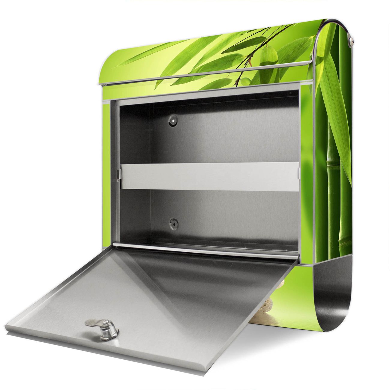 FUNKTION: Der banjado Edelstahl Briefkasten mit Motiv Motiv Innere Ruhe bietet Ihnen mit seinem Fassungsvermögen genügend Platz auch für große A4 Sendungen. Das integrierte Zeitungsfach eignet sich hervorragend um unkompliziert die Tageszeitung zu fassen. Auf Wunsch können Sie bei uns den passenden Ständer kaufen und so aus dem Wandbriefkasten einen Standbriefkasten machen. DESIGN: Der Motivbriefkasten hat ein sehr ansprechendes und ausgefallenes Design, damit entlocken Sie Ihren Nachbarn und dem Postboten ein Lächeln. Heben Sie Sich ab von der tristen grauen Masse ohne auf Funktionalität zu verzichten. DETAILS: Der Design Briefkasten mit Motiv Motiv Innere Ruhe besteht aus hochwertigem 18/0 Edelstahl. Das Motiv besteht aus einer wetter- und UV-resistenten Folie, die mit einem Schutzlaminat überzogen ist. Der Briefkasten wird mit Montagematerial und zwei Schlüsseln geliefert. NUTZEN: Sie können diesen Briefkasten sowohl als Wandbriefkasten montieren oder einen passenden Ständer auswählen und als Standbriefkasten einbetonieren. Die Größe bietet genügend Platz für Sendungen aller Art, das hochwertige Edelstahl ist rostfrei und die Motivfolie absolut wetterfest. SCHUTZ: Um Ihre Post optimal vor Witterungseinflüssen wie Starkregen zu schützen, empfehlen wir, den Briefkasten geschützt anzubringen. BANJADO: Ihr Briefkasten wird in Sachsen in einer kleinen Manufaktur von Hand veredelt. Die Motivfolie ist lösungsmittelfrei und schutzlaminiert, dies sorgt für einen langen Halt. Wir legen großen Wert auf die Verbindung von Funktionalität und Design. Sie erhalten Handarbeit aus Sachsen.