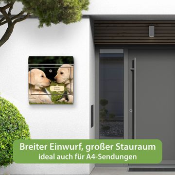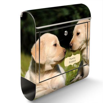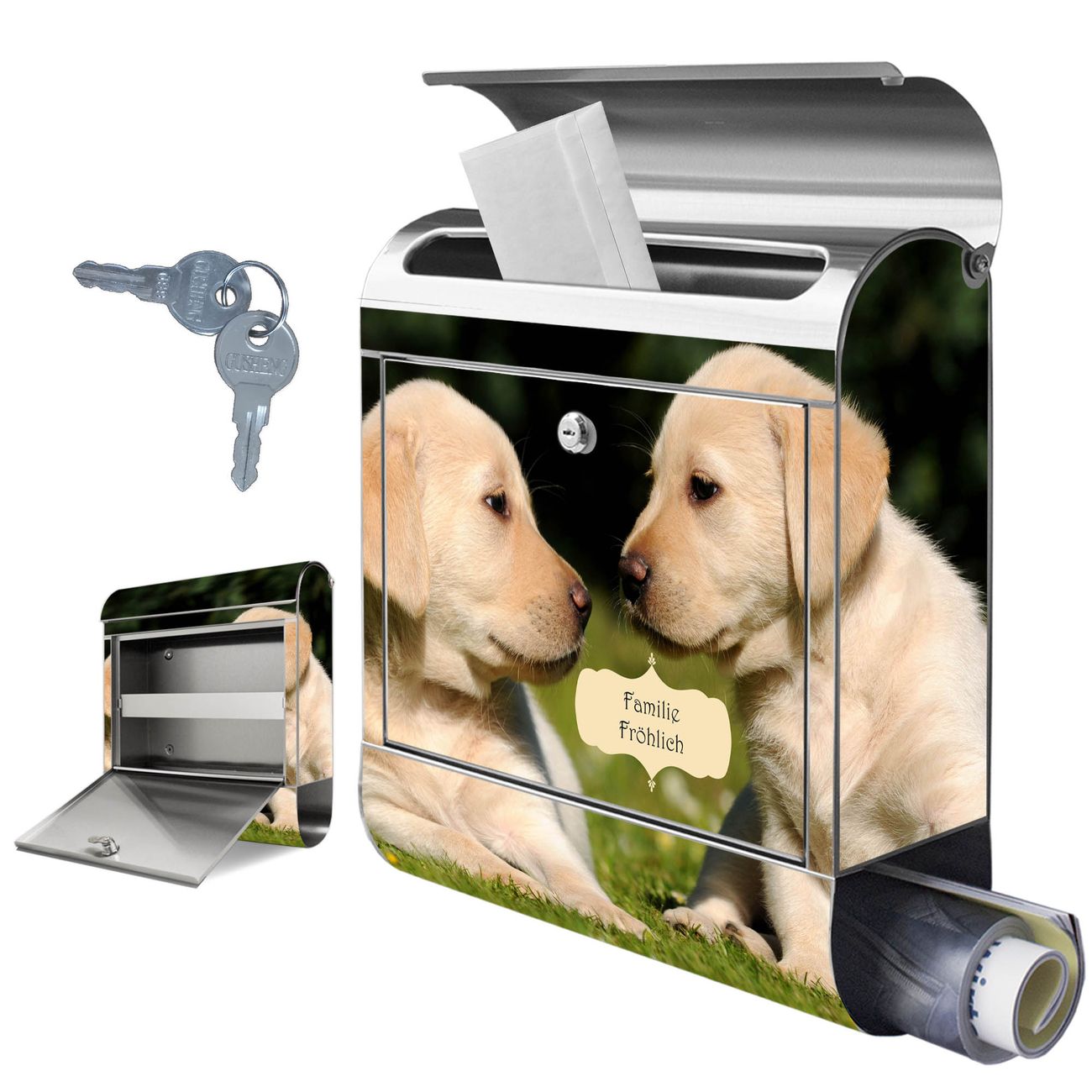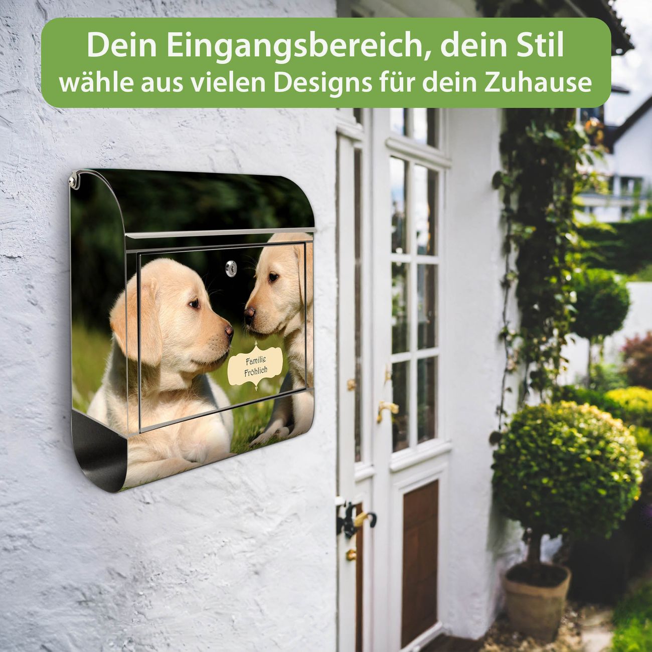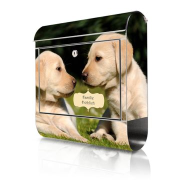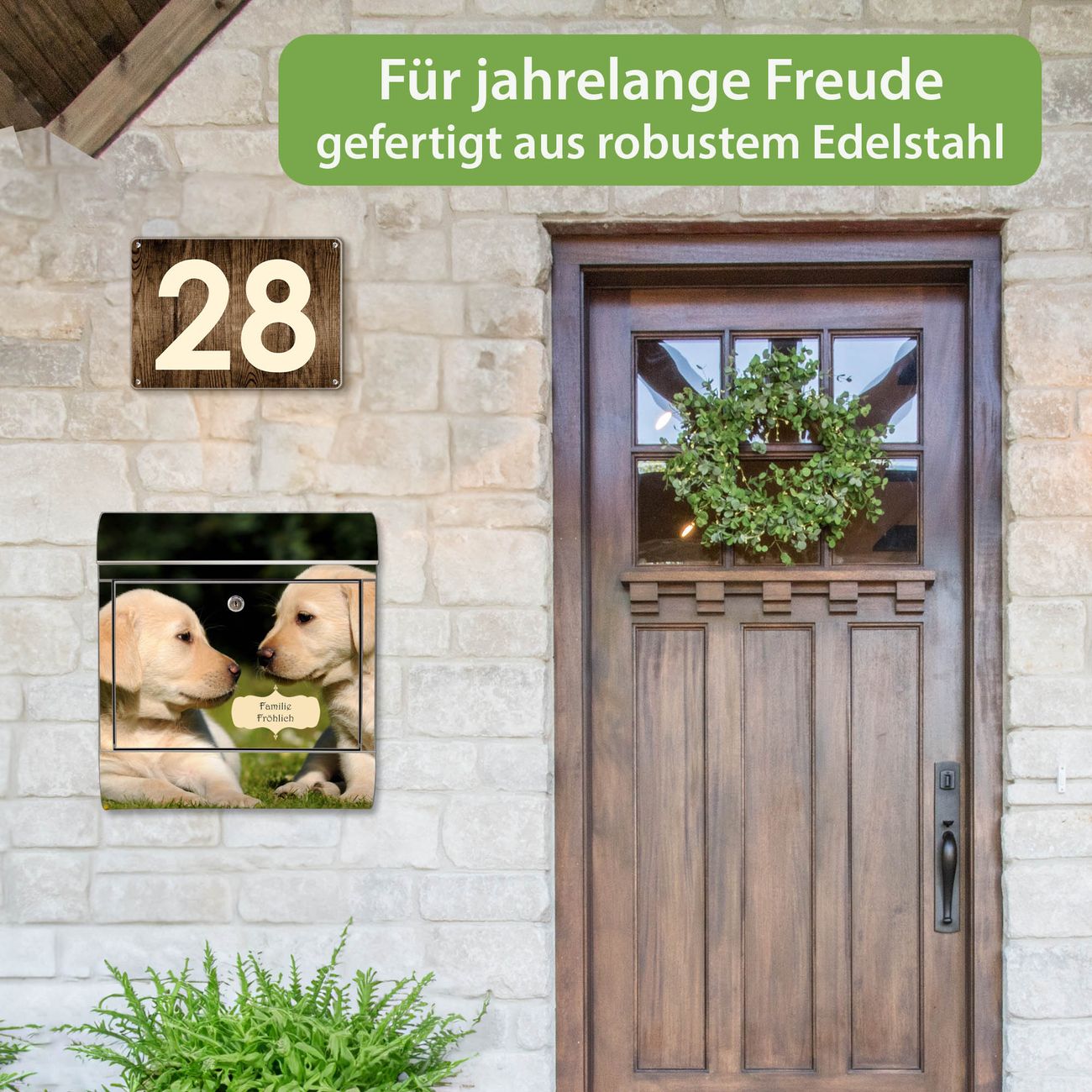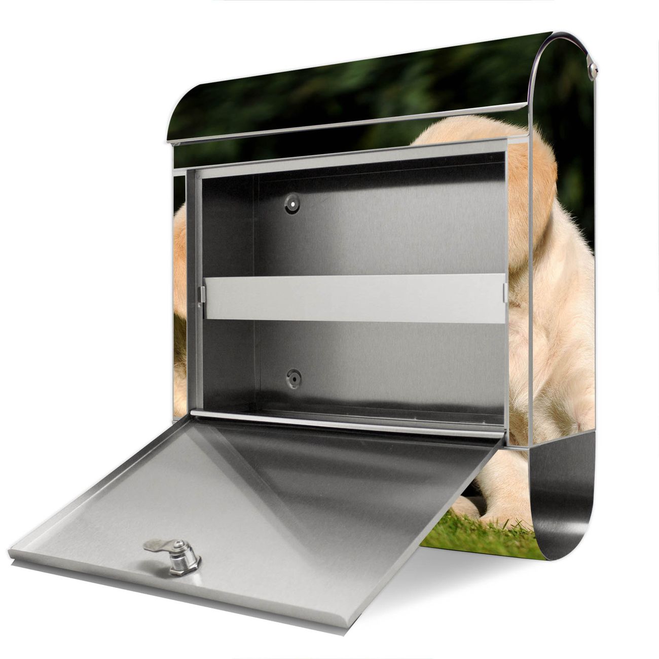 FUNKTION: Der banjado Edelstahl Briefkasten mit Motiv Motiv Labrador bietet Ihnen mit seinem Fassungsvermögen genügend Platz auch für große A4 Sendungen. Das integrierte Zeitungsfach eignet sich hervorragend um unkompliziert die Tageszeitung zu fassen. Auf Wunsch können Sie bei uns den passenden Ständer kaufen und so aus dem Wandbriefkasten einen Standbriefkasten machen. DESIGN: Der Motivbriefkasten hat ein sehr ansprechendes und ausgefallenes Design, damit entlocken Sie Ihren Nachbarn und dem Postboten ein Lächeln. Heben Sie Sich ab von der tristen grauen Masse ohne auf Funktionalität zu verzichten. DETAILS: Der Design Briefkasten mit Motiv Motiv Labrador besteht aus hochwertigem 18/0 Edelstahl. Das Motiv besteht aus einer wetter- und UV-resistenten Folie, die mit einem Schutzlaminat überzogen ist. Der Briefkasten wird mit Montagematerial und zwei Schlüsseln geliefert. NUTZEN: Sie können diesen Briefkasten sowohl als Wandbriefkasten montieren oder einen passenden Ständer auswählen und als Standbriefkasten einbetonieren. Die Größe bietet genügend Platz für Sendungen aller Art, das hochwertige Edelstahl ist rostfrei und die Motivfolie absolut wetterfest. SCHUTZ: Um Ihre Post optimal vor Witterungseinflüssen wie Starkregen zu schützen, empfehlen wir, den Briefkasten geschützt anzubringen. BANJADO: Ihr Briefkasten wird in Sachsen in einer kleinen Manufaktur von Hand veredelt. Die Motivfolie ist lösungsmittelfrei und schutzlaminiert, dies sorgt für einen langen Halt. Wir legen großen Wert auf die Verbindung von Funktionalität und Design. Sie erhalten Handarbeit aus Sachsen.