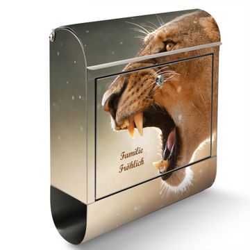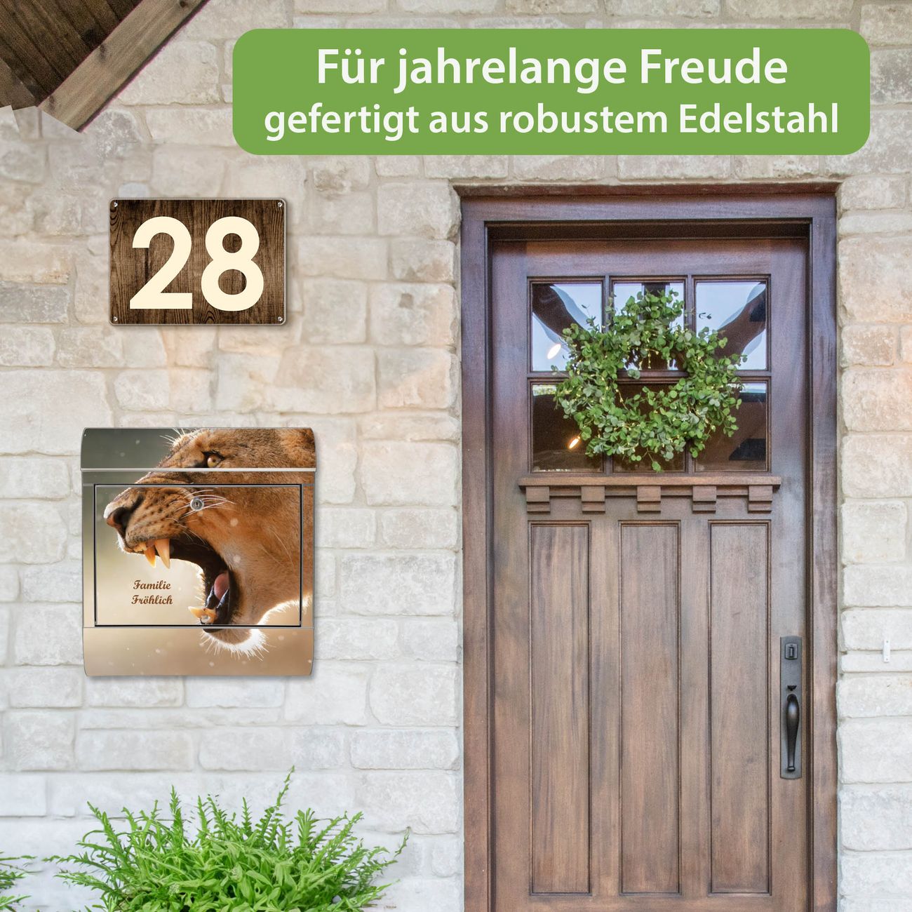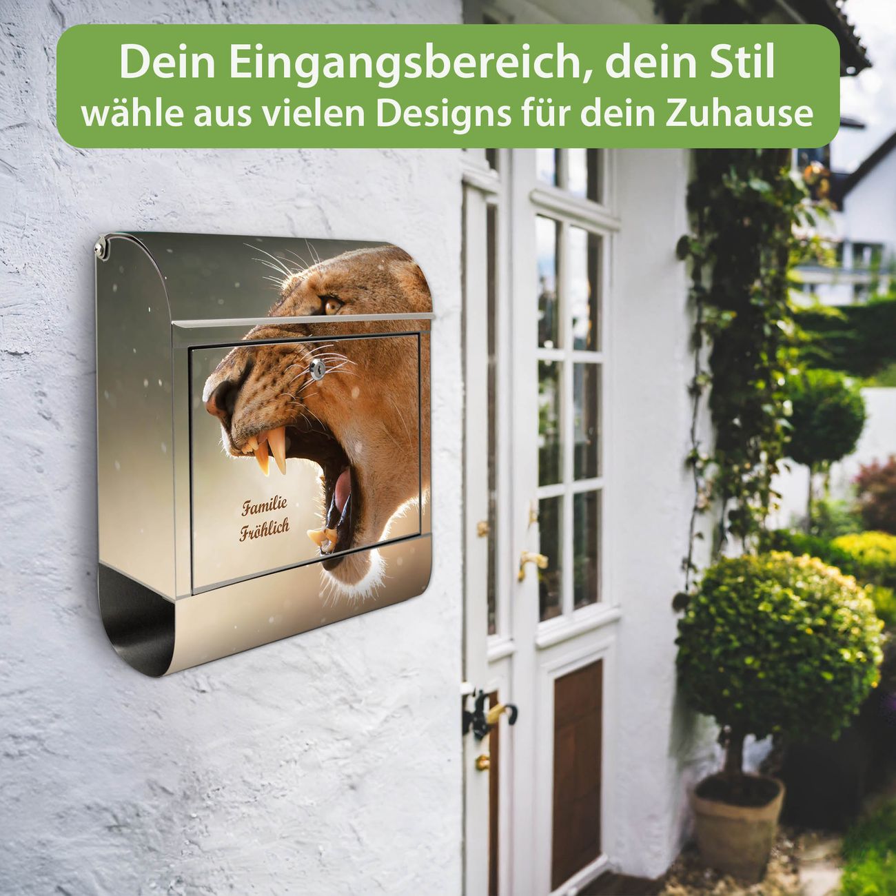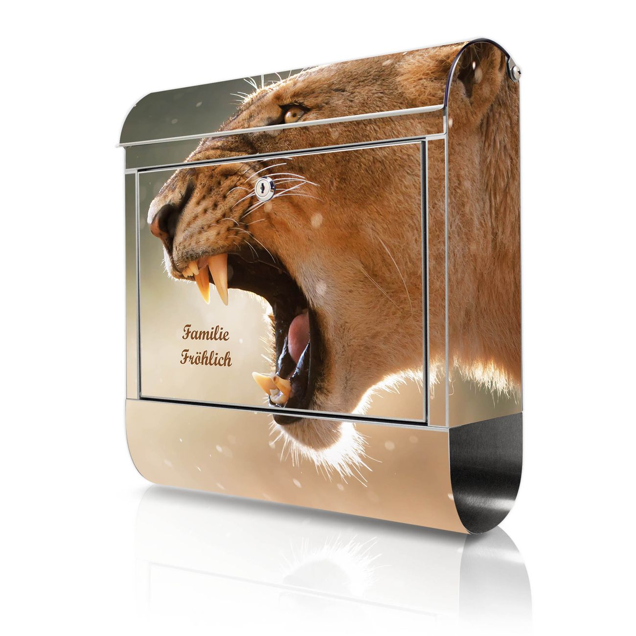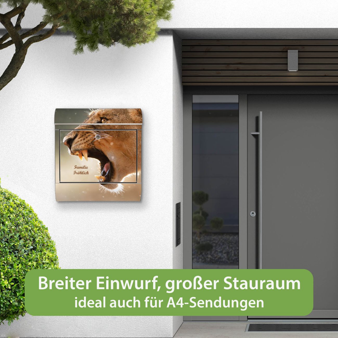 FUNKTION: Der banjado Edelstahl Briefkasten mit Motiv Motiv Löwin bietet Ihnen mit seinem Fassungsvermögen genügend Platz auch für große A4 Sendungen. Das integrierte Zeitungsfach eignet sich hervorragend um unkompliziert die Tageszeitung zu fassen. Auf Wunsch können Sie bei uns den passenden Ständer kaufen und so aus dem Wandbriefkasten einen Standbriefkasten machen. DESIGN: Der Motivbriefkasten hat ein sehr ansprechendes und ausgefallenes Design, damit entlocken Sie Ihren Nachbarn und dem Postboten ein Lächeln. Heben Sie Sich ab von der tristen grauen Masse ohne auf Funktionalität zu verzichten. DETAILS: Der Design Briefkasten mit Motiv Motiv Löwin besteht aus hochwertigem 18/0 Edelstahl. Das Motiv besteht aus einer wetter- und UV-resistenten Folie, die mit einem Schutzlaminat überzogen ist. Der Briefkasten wird mit Montagematerial und zwei Schlüsseln geliefert. NUTZEN: Sie können diesen Briefkasten sowohl als Wandbriefkasten montieren oder einen passenden Ständer auswählen und als Standbriefkasten einbetonieren. Die Größe bietet genügend Platz für Sendungen aller Art, das hochwertige Edelstahl ist rostfrei und die Motivfolie absolut wetterfest. SCHUTZ: Um Ihre Post optimal vor Witterungseinflüssen wie Starkregen zu schützen, empfehlen wir, den Briefkasten geschützt anzubringen. BANJADO: Ihr Briefkasten wird in Sachsen in einer kleinen Manufaktur von Hand veredelt. Die Motivfolie ist lösungsmittelfrei und schutzlaminiert, dies sorgt für einen langen Halt. Wir legen großen Wert auf die Verbindung von Funktionalität und Design. Sie erhalten Handarbeit aus Sachsen.