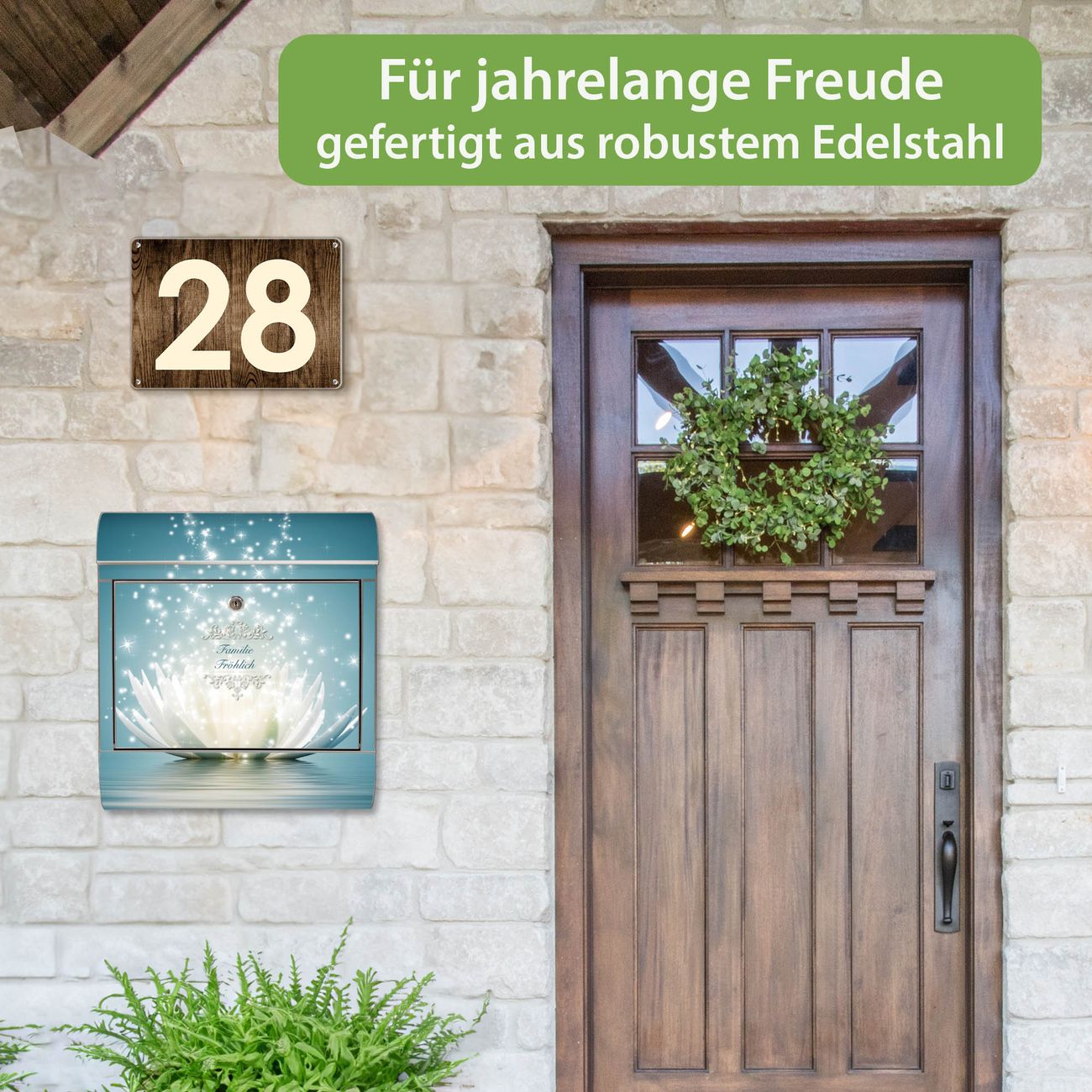 FUNKTION: Der banjado Edelstahl Briefkasten mit Motiv Motiv Magische Lotusblüte bietet Ihnen mit seinem Fassungsvermögen genügend Platz auch für große A4 Sendungen. Das integrierte Zeitungsfach eignet sich hervorragend um unkompliziert die Tageszeitung zu fassen. Auf Wunsch können Sie bei uns den passenden Ständer kaufen und so aus dem Wandbriefkasten einen Standbriefkasten machen. DESIGN: Der Motivbriefkasten hat ein sehr ansprechendes und ausgefallenes Design, damit entlocken Sie Ihren Nachbarn und dem Postboten ein Lächeln. Heben Sie Sich ab von der tristen grauen Masse ohne auf Funktionalität zu verzichten. DETAILS: Der Design Briefkasten mit Motiv Motiv Magische Lotusblüte besteht aus hochwertigem 18/0 Edelstahl. Das Motiv besteht aus einer wetter- und UV-resistenten Folie, die mit einem Schutzlaminat überzogen ist. Der Briefkasten wird mit Montagematerial und zwei Schlüsseln geliefert. NUTZEN: Sie können diesen Briefkasten sowohl als Wandbriefkasten montieren oder einen passenden Ständer auswählen und als Standbriefkasten einbetonieren. Die Größe bietet genügend Platz für Sendungen aller Art, das hochwertige Edelstahl ist rostfrei und die Motivfolie absolut wetterfest. SCHUTZ: Um Ihre Post optimal vor Witterungseinflüssen wie Starkregen zu schützen, empfehlen wir, den Briefkasten geschützt anzubringen. BANJADO: Ihr Briefkasten wird in Sachsen in einer kleinen Manufaktur von Hand veredelt. Die Motivfolie ist lösungsmittelfrei und schutzlaminiert, dies sorgt für einen langen Halt. Wir legen großen Wert auf die Verbindung von Funktionalität und Design. Sie erhalten Handarbeit aus Sachsen.
