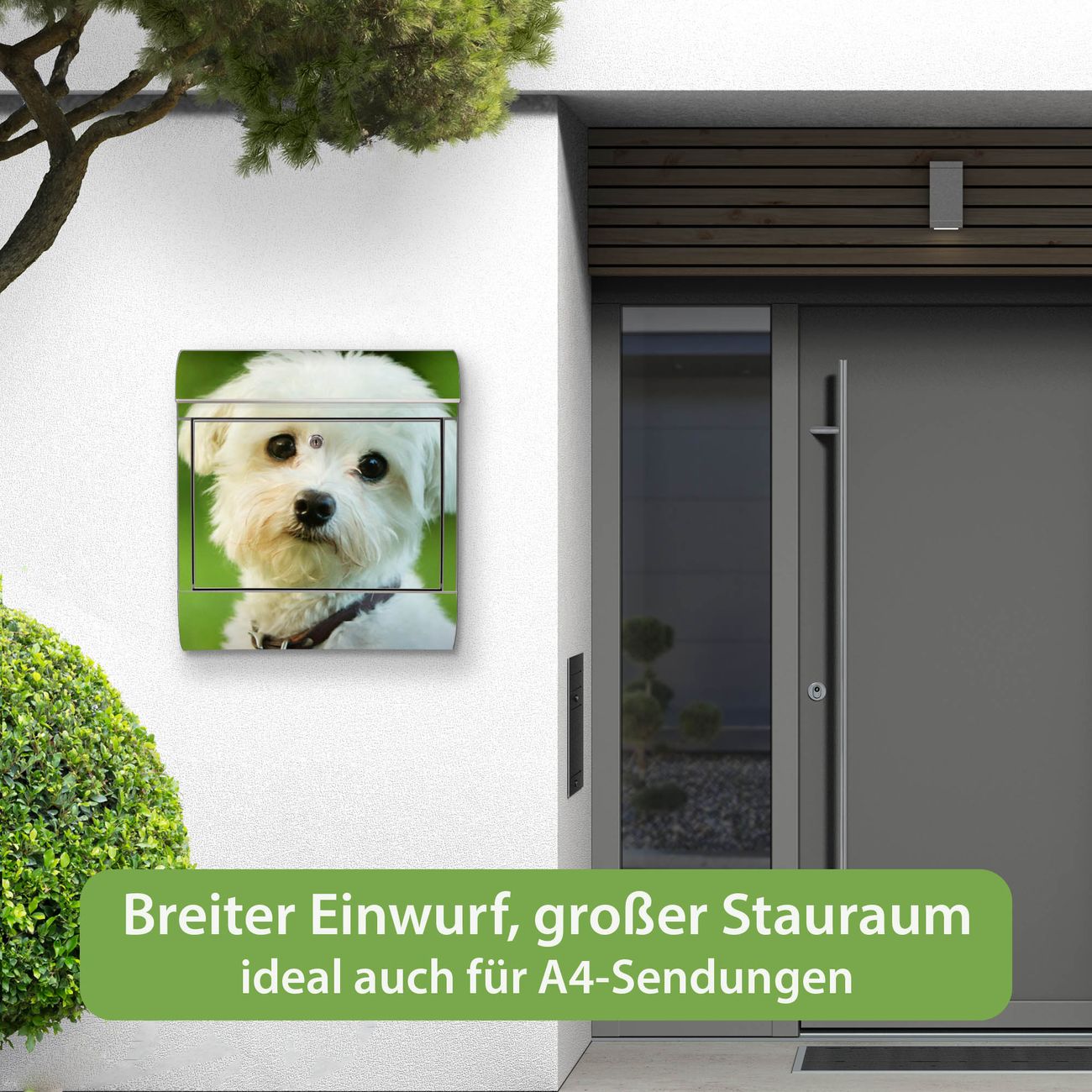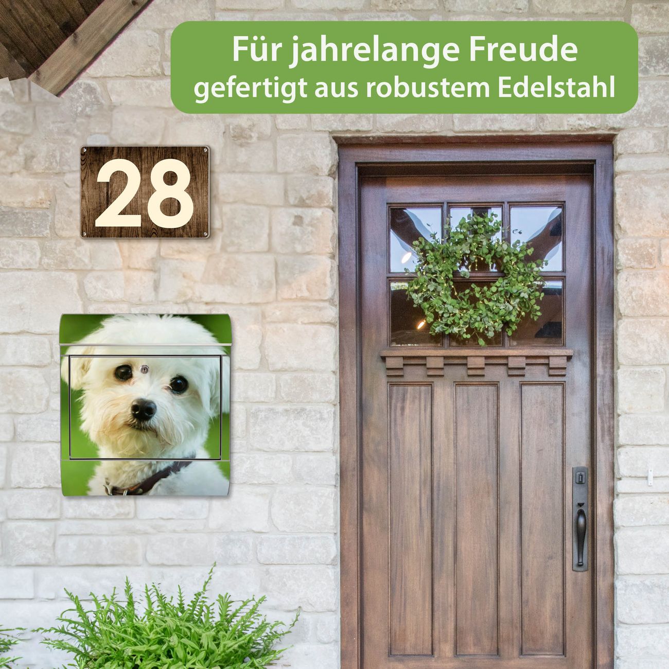 FUNKTION: Der banjado Edelstahl Briefkasten mit Motiv Motiv Mareike bietet Ihnen mit seinem Fassungsvermögen genügend Platz auch für große A4 Sendungen. Das integrierte Zeitungsfach eignet sich hervorragend um unkompliziert die Tageszeitung zu fassen. Auf Wunsch können Sie bei uns den passenden Ständer kaufen und so aus dem Wandbriefkasten einen Standbriefkasten machen. DESIGN: Der Motivbriefkasten hat ein sehr ansprechendes und ausgefallenes Design, damit entlocken Sie Ihren Nachbarn und dem Postboten ein Lächeln. Heben Sie Sich ab von der tristen grauen Masse ohne auf Funktionalität zu verzichten. DETAILS: Der Design Briefkasten mit Motiv Motiv Mareike besteht aus hochwertigem 18/0 Edelstahl. Das Motiv besteht aus einer wetter- und UV-resistenten Folie, die mit einem Schutzlaminat überzogen ist. Der Briefkasten wird mit Montagematerial und zwei Schlüsseln geliefert. NUTZEN: Sie können diesen Briefkasten sowohl als Wandbriefkasten montieren oder einen passenden Ständer auswählen und als Standbriefkasten einbetonieren. Die Größe bietet genügend Platz für Sendungen aller Art, das hochwertige Edelstahl ist rostfrei und die Motivfolie absolut wetterfest. SCHUTZ: Um Ihre Post optimal vor Witterungseinflüssen wie Starkregen zu schützen, empfehlen wir, den Briefkasten geschützt anzubringen. BANJADO: Ihr Briefkasten wird in Sachsen in einer kleinen Manufaktur von Hand veredelt. Die Motivfolie ist lösungsmittelfrei und schutzlaminiert, dies sorgt für einen langen Halt. Wir legen großen Wert auf die Verbindung von Funktionalität und Design. Sie erhalten Handarbeit aus Sachsen.