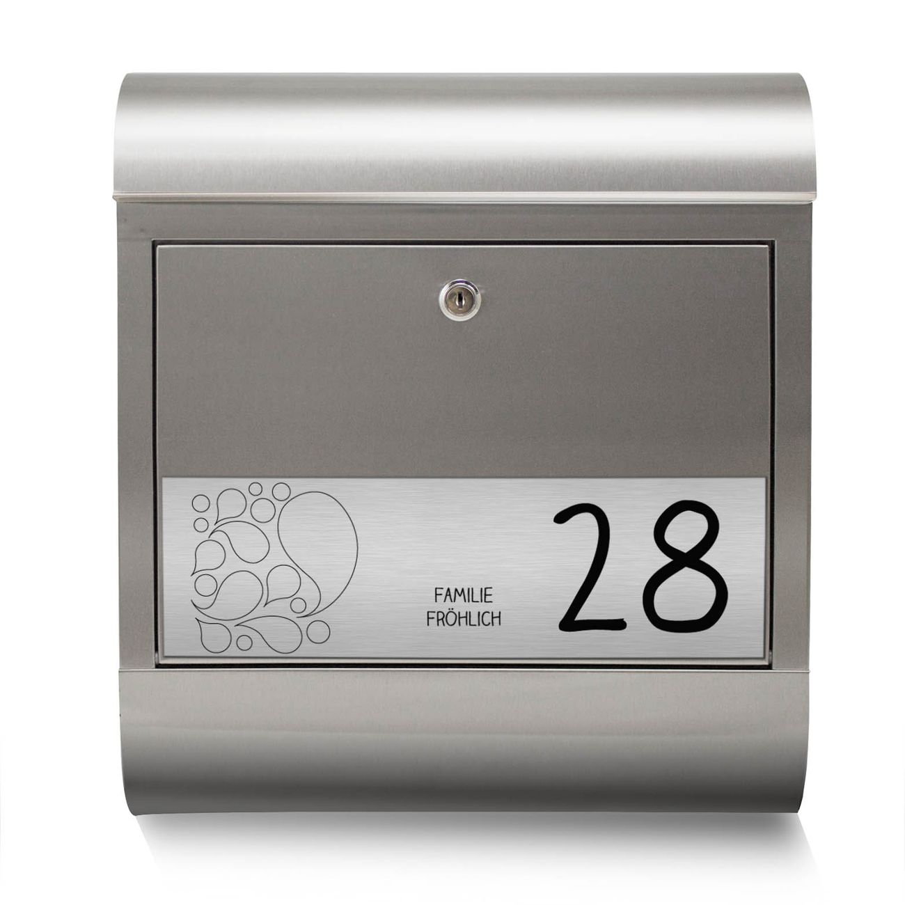 Heben Sie Sich von der tristen grauen Masse ab, ohne auf Funktionalität zu verzichten. Die Gravur Platte aus Acryl in Edelstahl-Optik ist 33x10cm groß und schmückt die Vorderseite des Briefkastens. Das Material sieht Edelstahl zum Verwechseln ähnlich und ist ebenso witterungsbeständig wie dieser. Durch das Bearbeiten erscheint an den gravierten Stellen die schwarze Unterschicht und hebt so in einem guten Kontrast ihren Wunschtext, Ihre Hausnummer und das Gravur Motiv Tropfen ab.