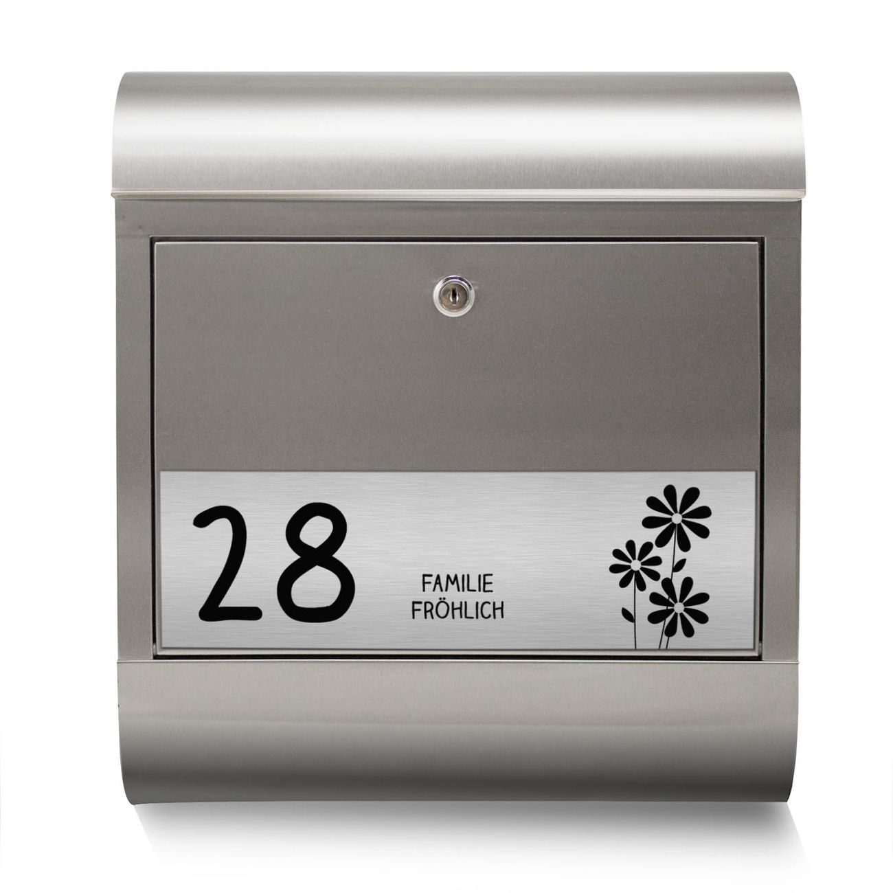 Heben Sie Sich von der tristen grauen Masse ab, ohne auf Funktionalität zu verzichten. Die Gravur Platte aus Acryl in Edelstahl-Optik ist 33x10cm groß und schmückt die Vorderseite des Briefkastens. Das Material sieht Edelstahl zum Verwechseln ähnlich und ist ebenso witterungsbeständig wie dieser. Durch das Bearbeiten erscheint an den gravierten Stellen die schwarze Unterschicht und hebt so in einem guten Kontrast ihren Wunschtext, Ihre Hausnummer und das Gravur Motiv WT Gänseblümchen ab.