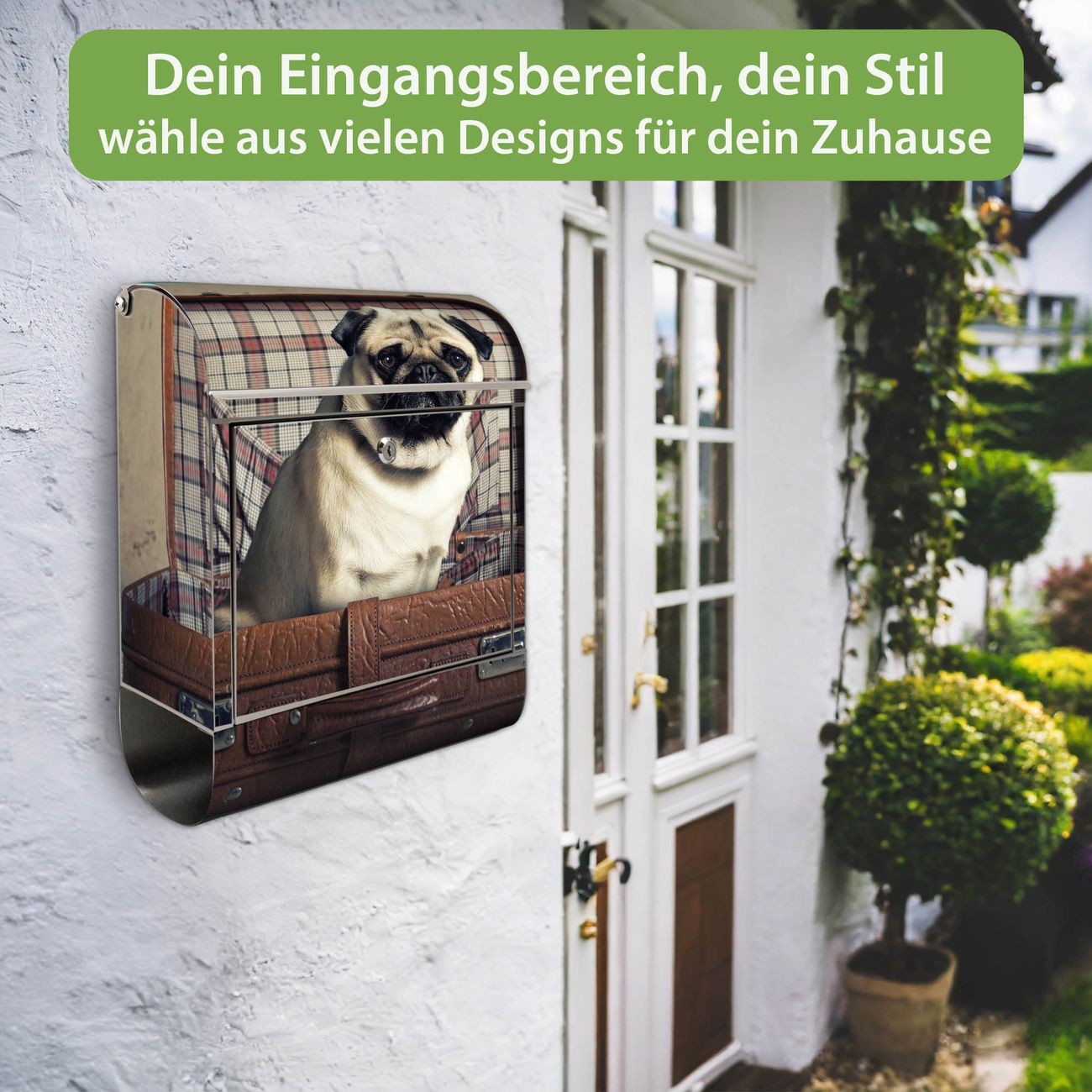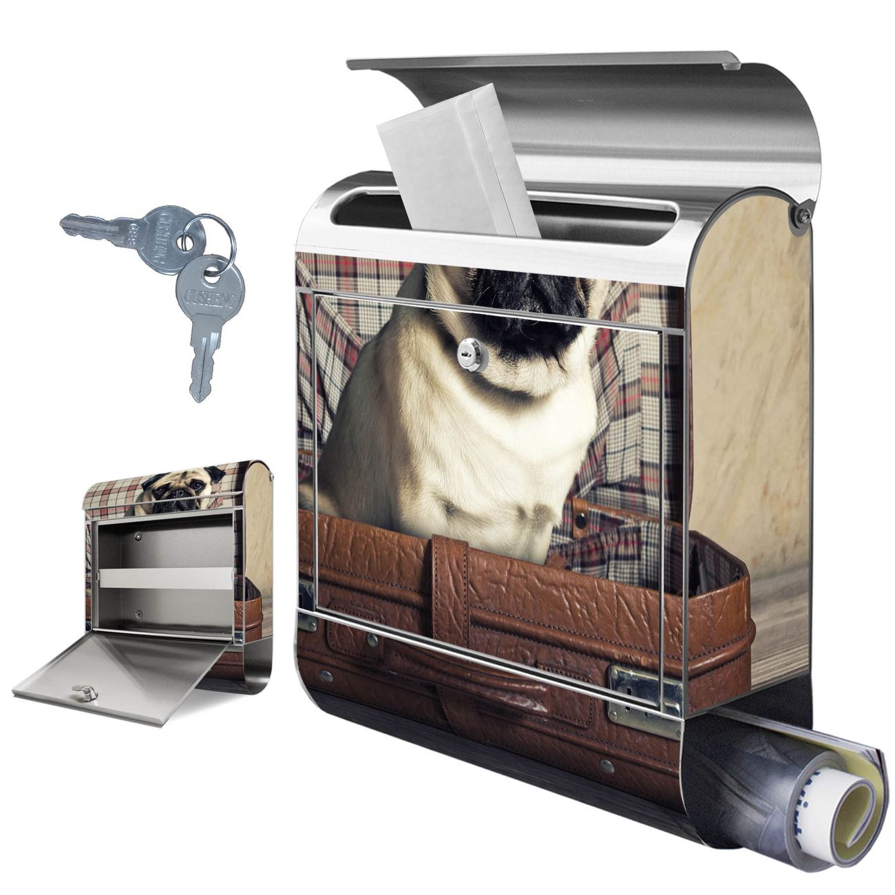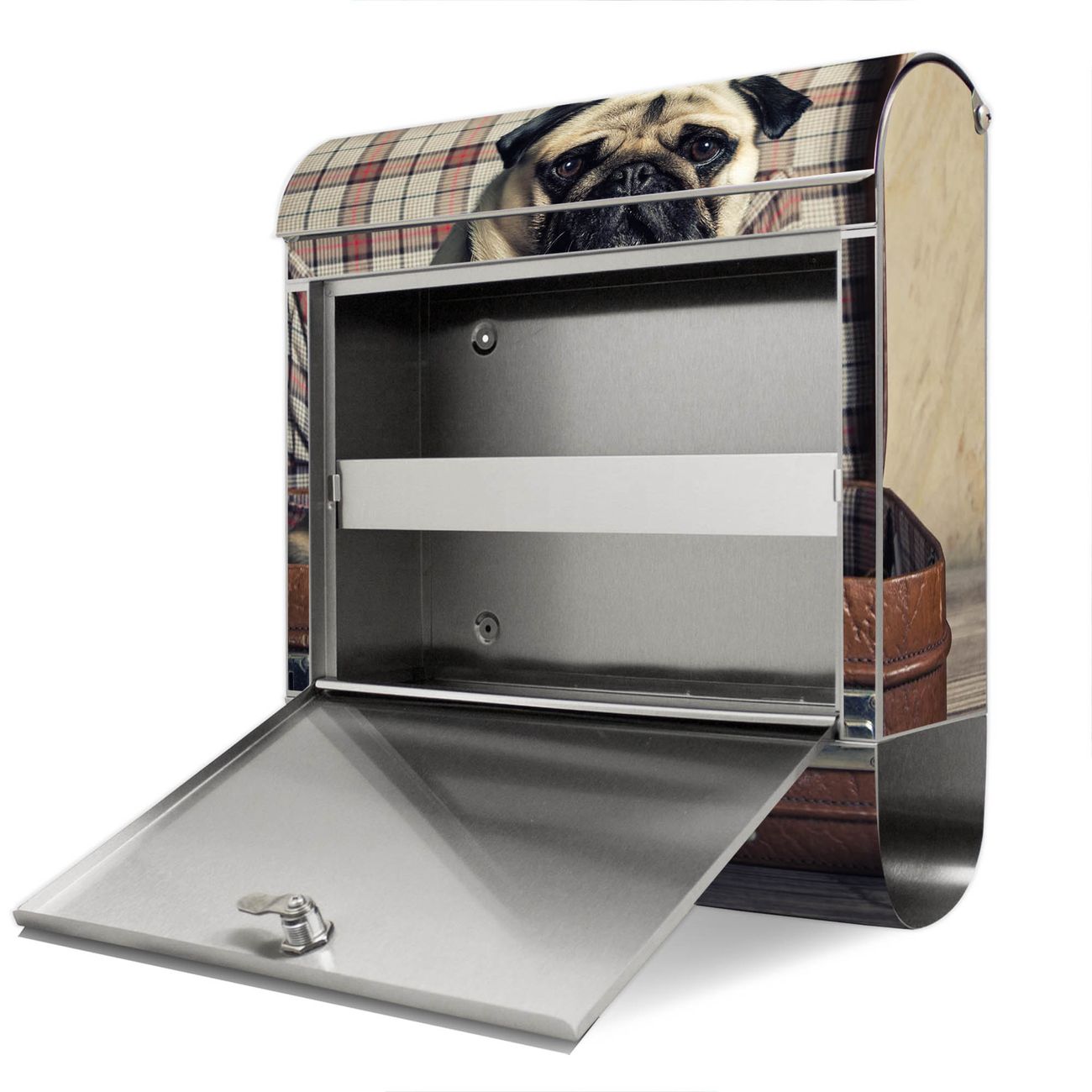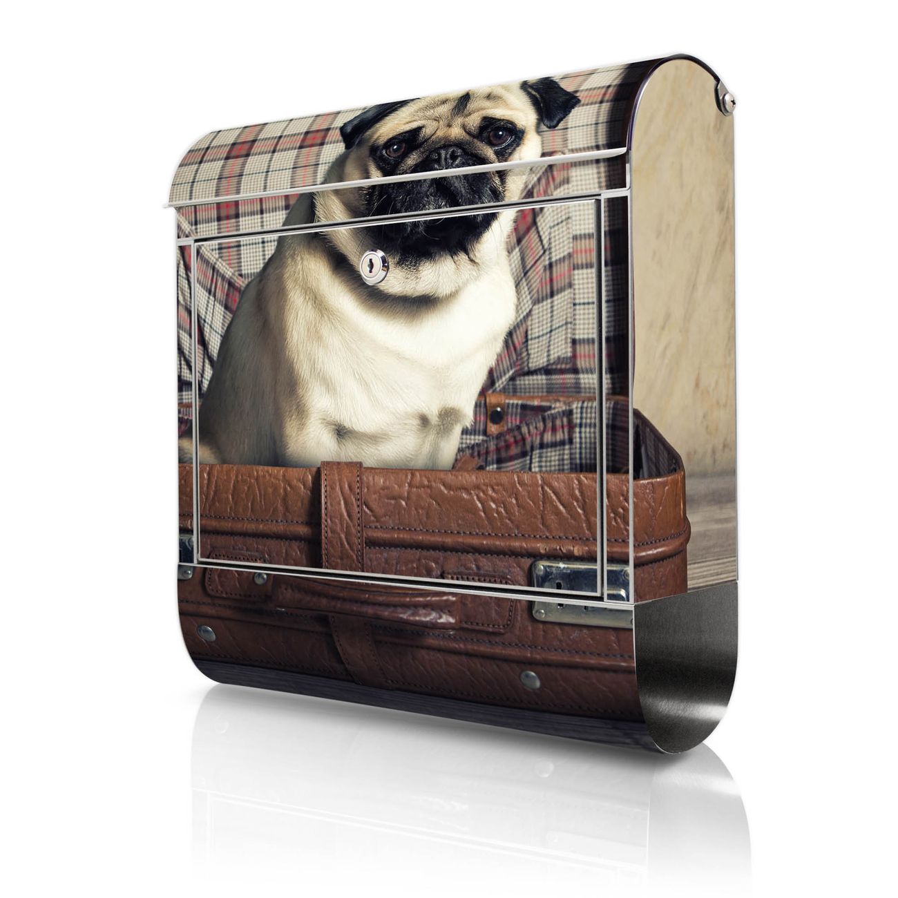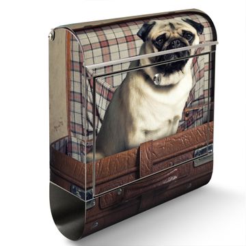 Wandbriefkasten Edelstahl Motiv Mops im Koffer