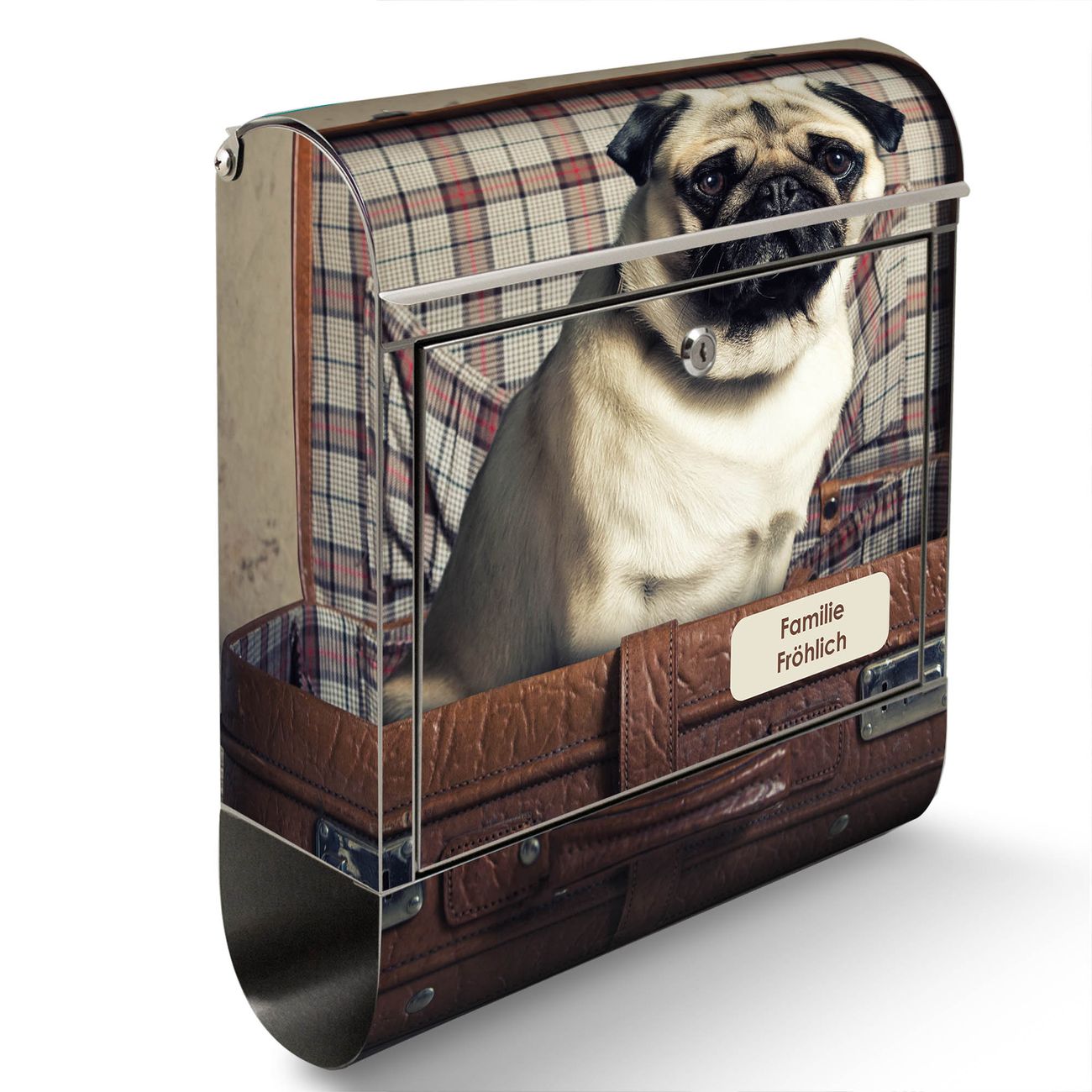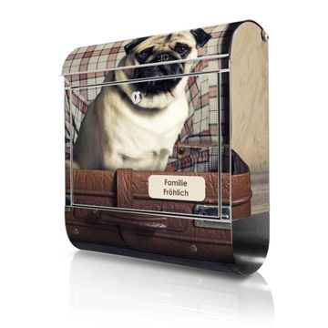 Wandbriefkasten Edelstahl Motiv Mops im Koffer