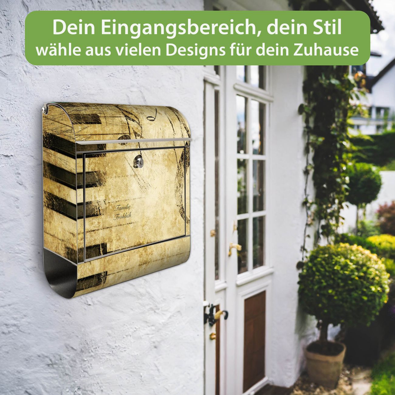 FUNKTION: Der banjado Edelstahl Briefkasten mit Motiv Motiv Music bietet Ihnen mit seinem Fassungsvermögen genügend Platz auch für große A4 Sendungen. Das integrierte Zeitungsfach eignet sich hervorragend um unkompliziert die Tageszeitung zu fassen. Auf Wunsch können Sie bei uns den passenden Ständer kaufen und so aus dem Wandbriefkasten einen Standbriefkasten machen. DESIGN: Der Motivbriefkasten hat ein sehr ansprechendes und ausgefallenes Design, damit entlocken Sie Ihren Nachbarn und dem Postboten ein Lächeln. Heben Sie Sich ab von der tristen grauen Masse ohne auf Funktionalität zu verzichten. DETAILS: Der Design Briefkasten mit Motiv Motiv Music besteht aus hochwertigem 18/0 Edelstahl. Das Motiv besteht aus einer wetter- und UV-resistenten Folie, die mit einem Schutzlaminat überzogen ist. Der Briefkasten wird mit Montagematerial und zwei Schlüsseln geliefert. NUTZEN: Sie können diesen Briefkasten sowohl als Wandbriefkasten montieren oder einen passenden Ständer auswählen und als Standbriefkasten einbetonieren. Die Größe bietet genügend Platz für Sendungen aller Art, das hochwertige Edelstahl ist rostfrei und die Motivfolie absolut wetterfest. SCHUTZ: Um Ihre Post optimal vor Witterungseinflüssen wie Starkregen zu schützen, empfehlen wir, den Briefkasten geschützt anzubringen. BANJADO: Ihr Briefkasten wird in Sachsen in einer kleinen Manufaktur von Hand veredelt. Die Motivfolie ist lösungsmittelfrei und schutzlaminiert, dies sorgt für einen langen Halt. Wir legen großen Wert auf die Verbindung von Funktionalität und Design. Sie erhalten Handarbeit aus Sachsen.
