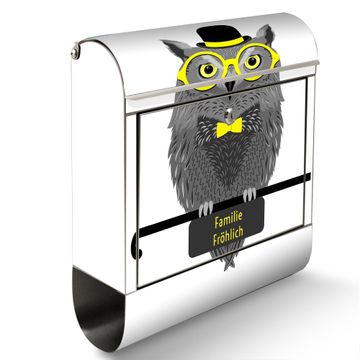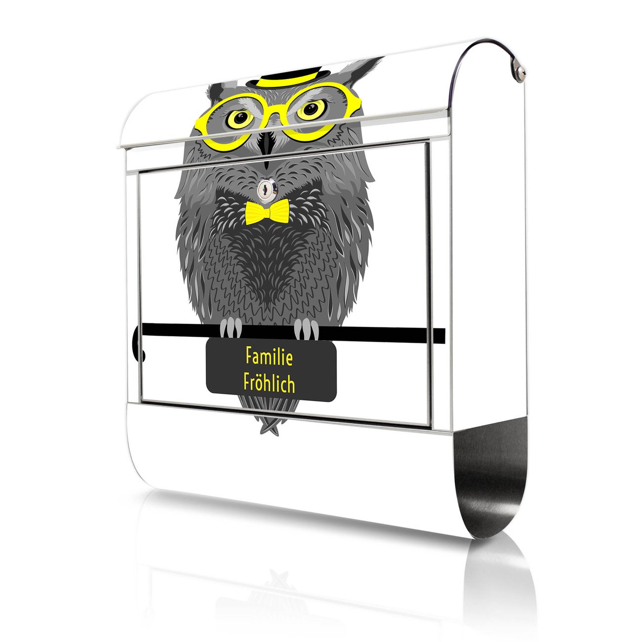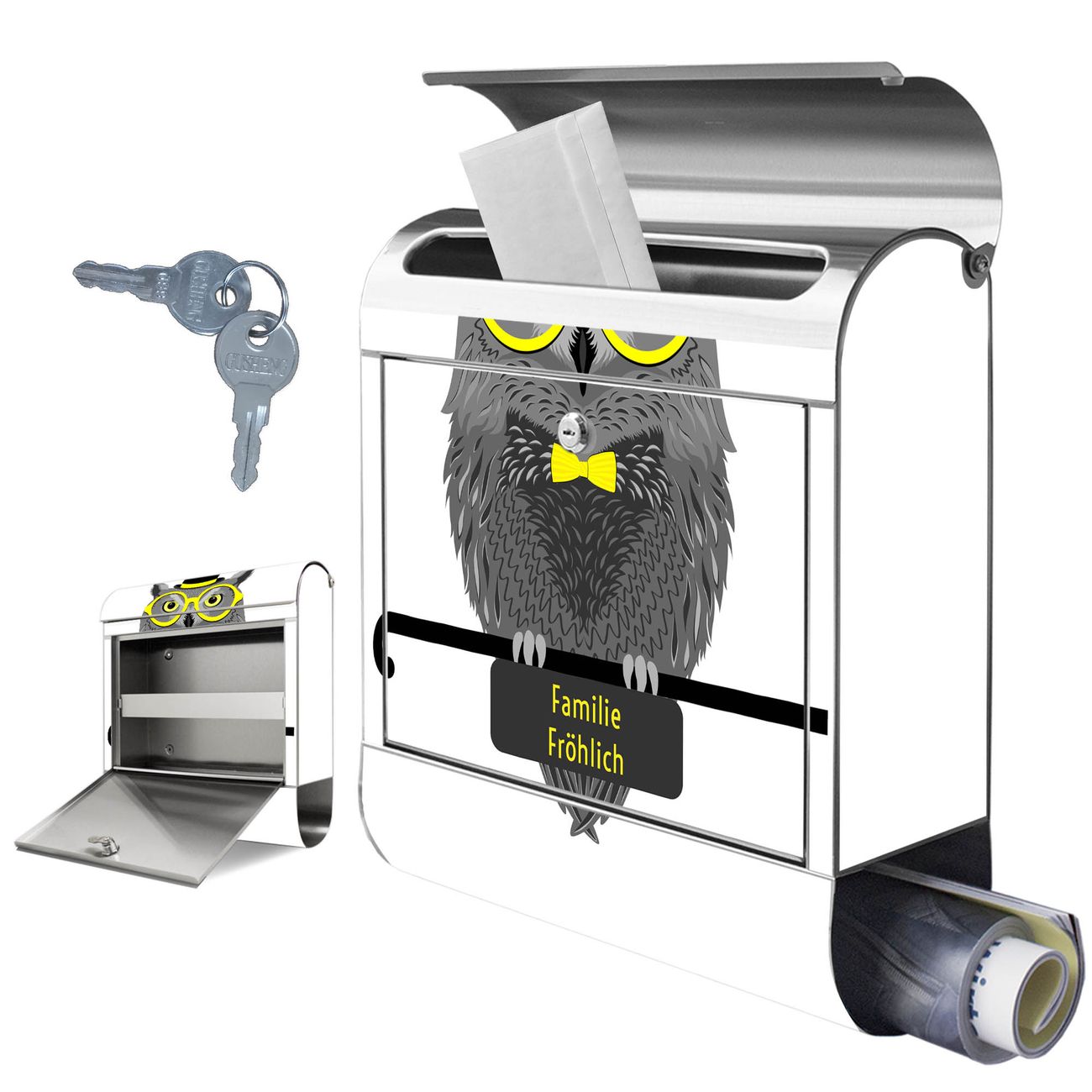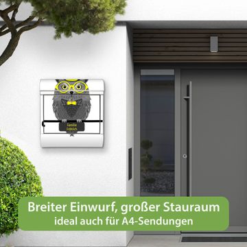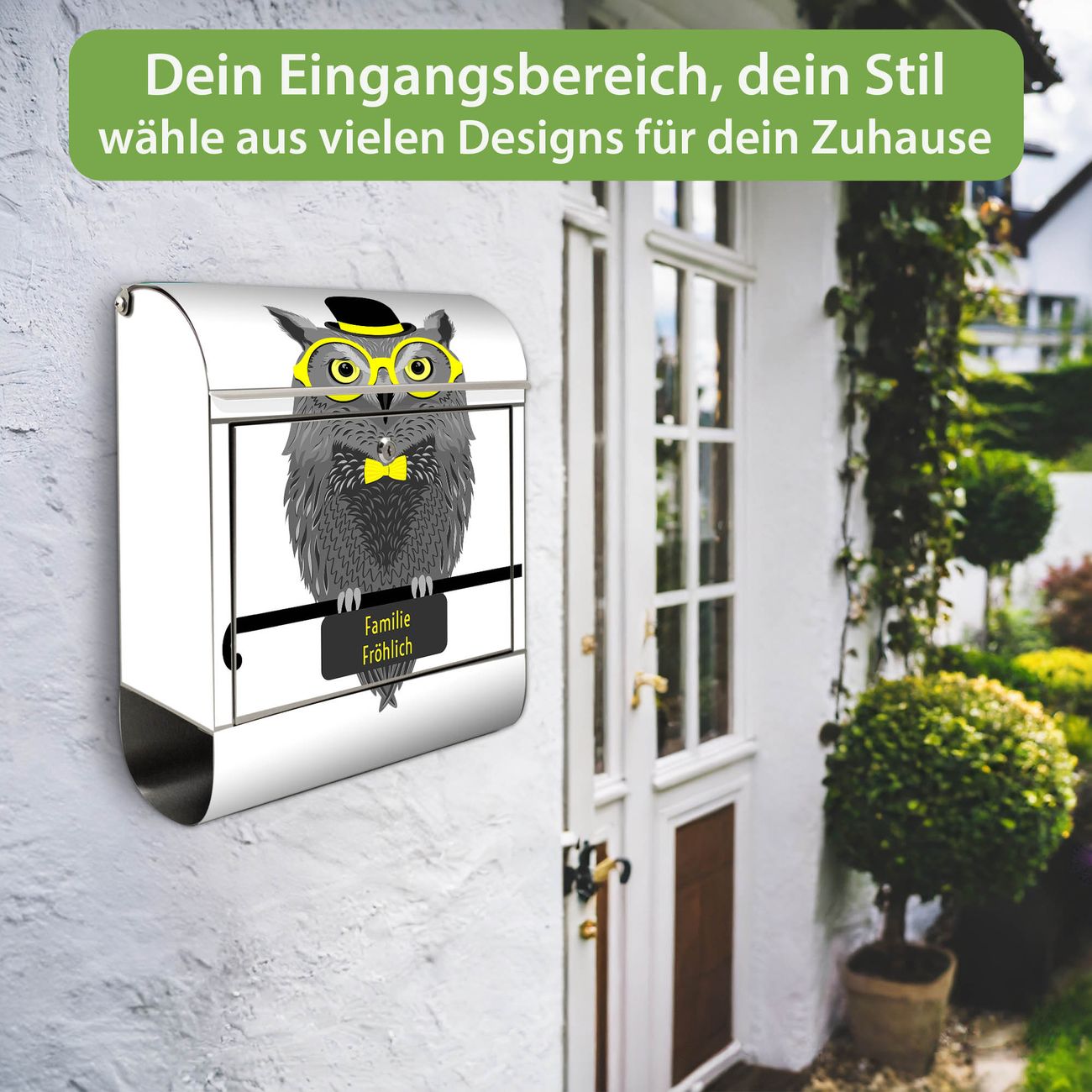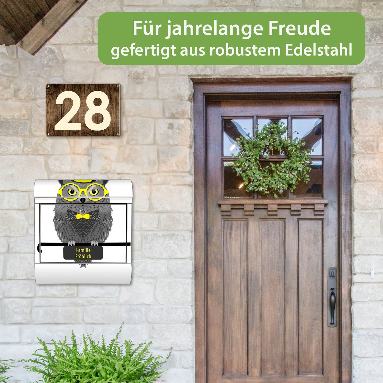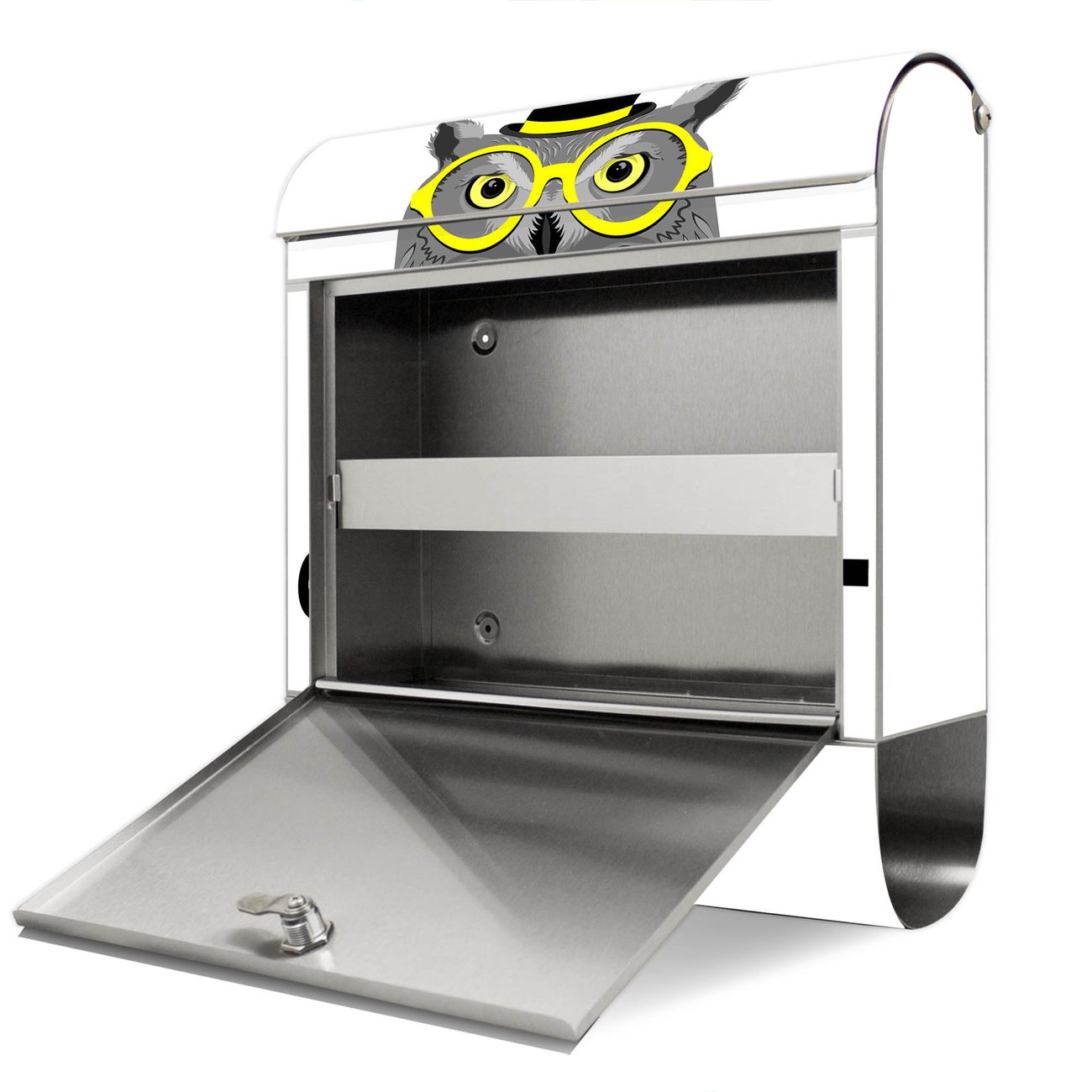 FUNKTION: Der banjado Edelstahl Briefkasten mit Motiv Motiv Owling bietet Ihnen mit seinem Fassungsvermögen genügend Platz auch für große A4 Sendungen. Das integrierte Zeitungsfach eignet sich hervorragend um unkompliziert die Tageszeitung zu fassen. Auf Wunsch können Sie bei uns den passenden Ständer kaufen und so aus dem Wandbriefkasten einen Standbriefkasten machen. DESIGN: Der Motivbriefkasten hat ein sehr ansprechendes und ausgefallenes Design, damit entlocken Sie Ihren Nachbarn und dem Postboten ein Lächeln. Heben Sie Sich ab von der tristen grauen Masse ohne auf Funktionalität zu verzichten. DETAILS: Der Design Briefkasten mit Motiv Motiv Owling besteht aus hochwertigem 18/0 Edelstahl. Das Motiv besteht aus einer wetter- und UV-resistenten Folie, die mit einem Schutzlaminat überzogen ist. Der Briefkasten wird mit Montagematerial und zwei Schlüsseln geliefert. NUTZEN: Sie können diesen Briefkasten sowohl als Wandbriefkasten montieren oder einen passenden Ständer auswählen und als Standbriefkasten einbetonieren. Die Größe bietet genügend Platz für Sendungen aller Art, das hochwertige Edelstahl ist rostfrei und die Motivfolie absolut wetterfest. SCHUTZ: Um Ihre Post optimal vor Witterungseinflüssen wie Starkregen zu schützen, empfehlen wir, den Briefkasten geschützt anzubringen. BANJADO: Ihr Briefkasten wird in Sachsen in einer kleinen Manufaktur von Hand veredelt. Die Motivfolie ist lösungsmittelfrei und schutzlaminiert, dies sorgt für einen langen Halt. Wir legen großen Wert auf die Verbindung von Funktionalität und Design. Sie erhalten Handarbeit aus Sachsen.