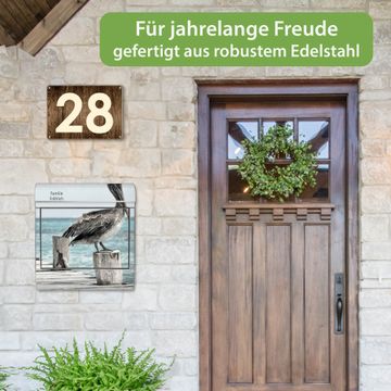 FUNKTION: Der banjado Edelstahl Briefkasten mit Motiv Motiv Pelikane bietet Ihnen mit seinem Fassungsvermögen genügend Platz auch für große A4 Sendungen. Das integrierte Zeitungsfach eignet sich hervorragend um unkompliziert die Tageszeitung zu fassen. Auf Wunsch können Sie bei uns den passenden Ständer kaufen und so aus dem Wandbriefkasten einen Standbriefkasten machen. DESIGN: Der Motivbriefkasten hat ein sehr ansprechendes und ausgefallenes Design, damit entlocken Sie Ihren Nachbarn und dem Postboten ein Lächeln. Heben Sie Sich ab von der tristen grauen Masse ohne auf Funktionalität zu verzichten. DETAILS: Der Design Briefkasten mit Motiv Motiv Pelikane besteht aus hochwertigem 18/0 Edelstahl. Das Motiv besteht aus einer wetter- und UV-resistenten Folie, die mit einem Schutzlaminat überzogen ist. Der Briefkasten wird mit Montagematerial und zwei Schlüsseln geliefert. NUTZEN: Sie können diesen Briefkasten sowohl als Wandbriefkasten montieren oder einen passenden Ständer auswählen und als Standbriefkasten einbetonieren. Die Größe bietet genügend Platz für Sendungen aller Art, das hochwertige Edelstahl ist rostfrei und die Motivfolie absolut wetterfest. SCHUTZ: Um Ihre Post optimal vor Witterungseinflüssen wie Starkregen zu schützen, empfehlen wir, den Briefkasten geschützt anzubringen. BANJADO: Ihr Briefkasten wird in Sachsen in einer kleinen Manufaktur von Hand veredelt. Die Motivfolie ist lösungsmittelfrei und schutzlaminiert, dies sorgt für einen langen Halt. Wir legen großen Wert auf die Verbindung von Funktionalität und Design. Sie erhalten Handarbeit aus Sachsen.