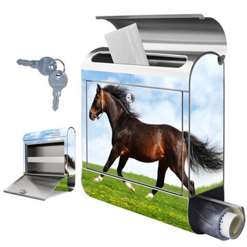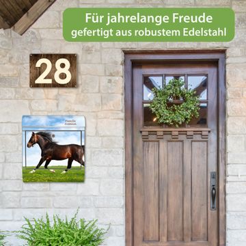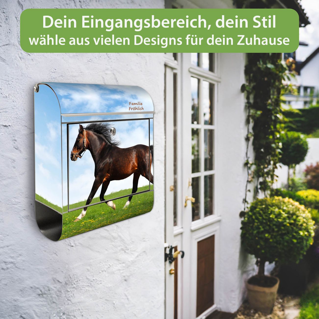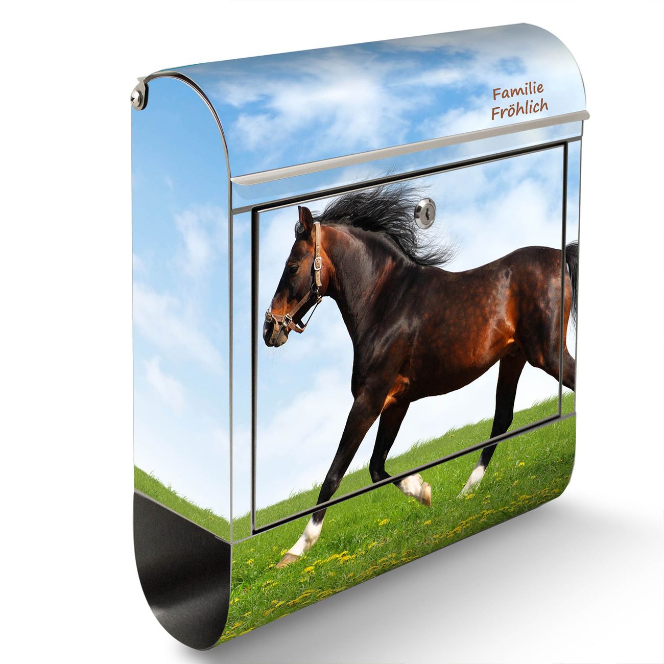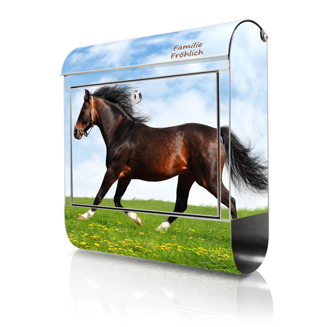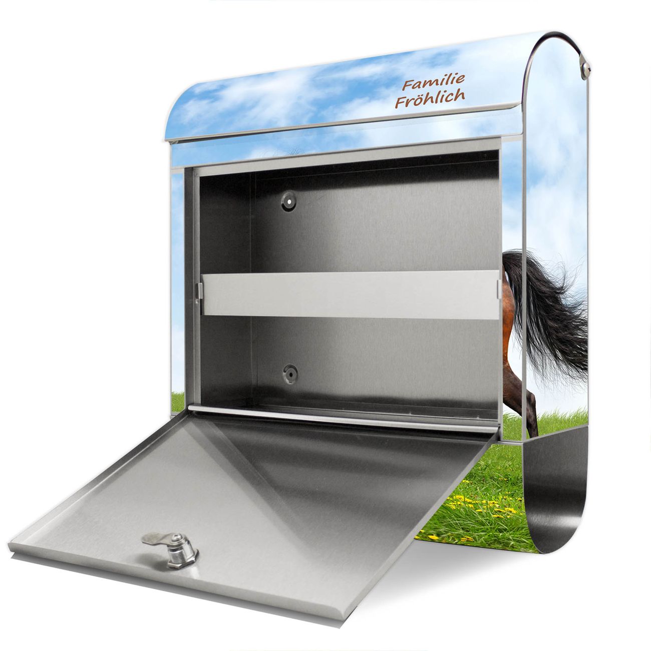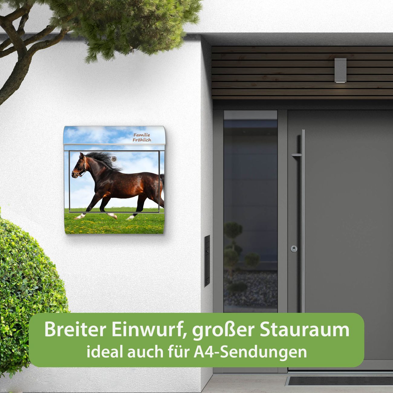 FUNKTION: Der banjado Edelstahl Briefkasten mit Motiv Motiv Pferd bietet Ihnen mit seinem Fassungsvermögen genügend Platz auch für große A4 Sendungen. Das integrierte Zeitungsfach eignet sich hervorragend um unkompliziert die Tageszeitung zu fassen. Auf Wunsch können Sie bei uns den passenden Ständer kaufen und so aus dem Wandbriefkasten einen Standbriefkasten machen. DESIGN: Der Motivbriefkasten hat ein sehr ansprechendes und ausgefallenes Design, damit entlocken Sie Ihren Nachbarn und dem Postboten ein Lächeln. Heben Sie Sich ab von der tristen grauen Masse ohne auf Funktionalität zu verzichten. DETAILS: Der Design Briefkasten mit Motiv Motiv Pferd besteht aus hochwertigem 18/0 Edelstahl. Das Motiv besteht aus einer wetter- und UV-resistenten Folie, die mit einem Schutzlaminat überzogen ist. Der Briefkasten wird mit Montagematerial und zwei Schlüsseln geliefert. NUTZEN: Sie können diesen Briefkasten sowohl als Wandbriefkasten montieren oder einen passenden Ständer auswählen und als Standbriefkasten einbetonieren. Die Größe bietet genügend Platz für Sendungen aller Art, das hochwertige Edelstahl ist rostfrei und die Motivfolie absolut wetterfest. SCHUTZ: Um Ihre Post optimal vor Witterungseinflüssen wie Starkregen zu schützen, empfehlen wir, den Briefkasten geschützt anzubringen. BANJADO: Ihr Briefkasten wird in Sachsen in einer kleinen Manufaktur von Hand veredelt. Die Motivfolie ist lösungsmittelfrei und schutzlaminiert, dies sorgt für einen langen Halt. Wir legen großen Wert auf die Verbindung von Funktionalität und Design. Sie erhalten Handarbeit aus Sachsen.