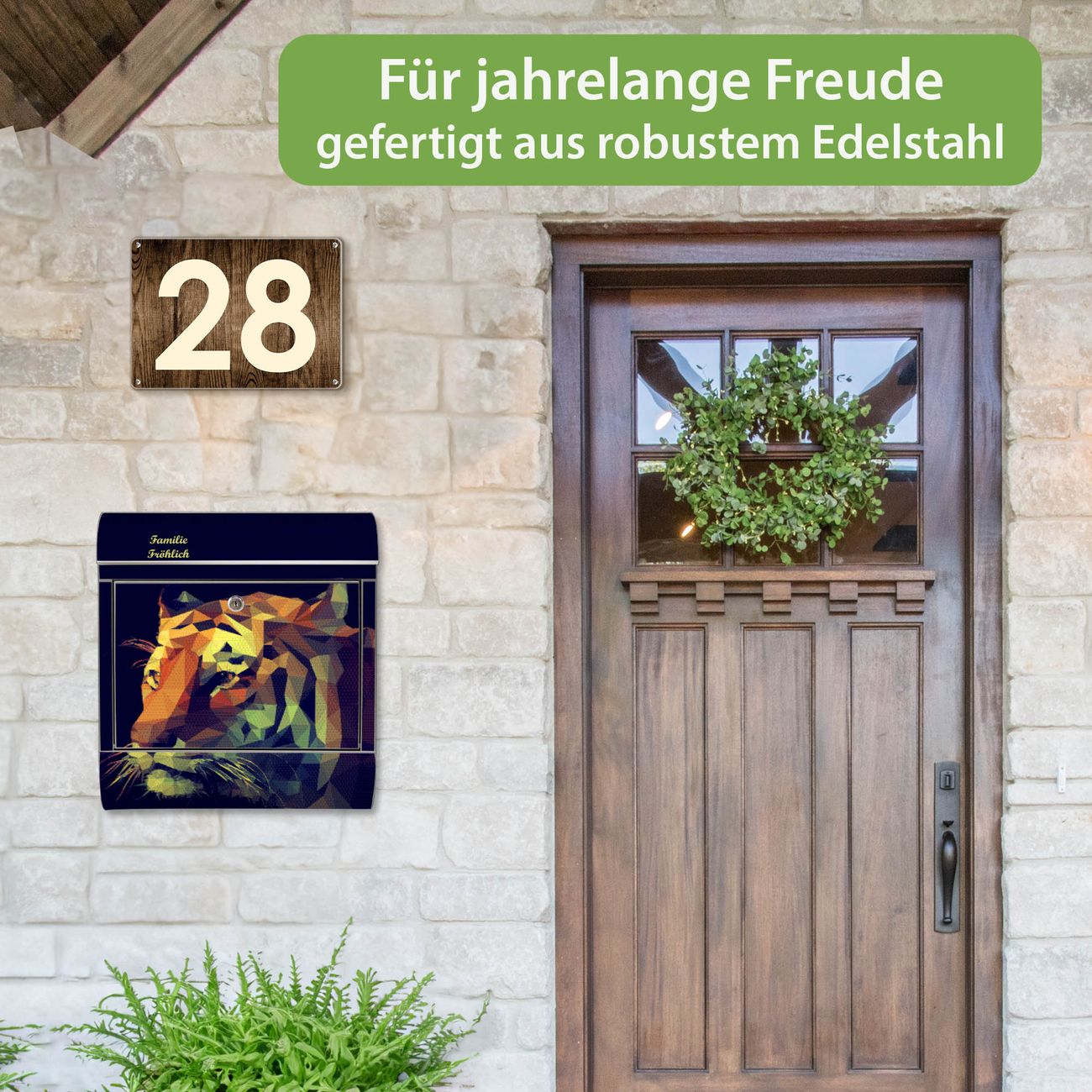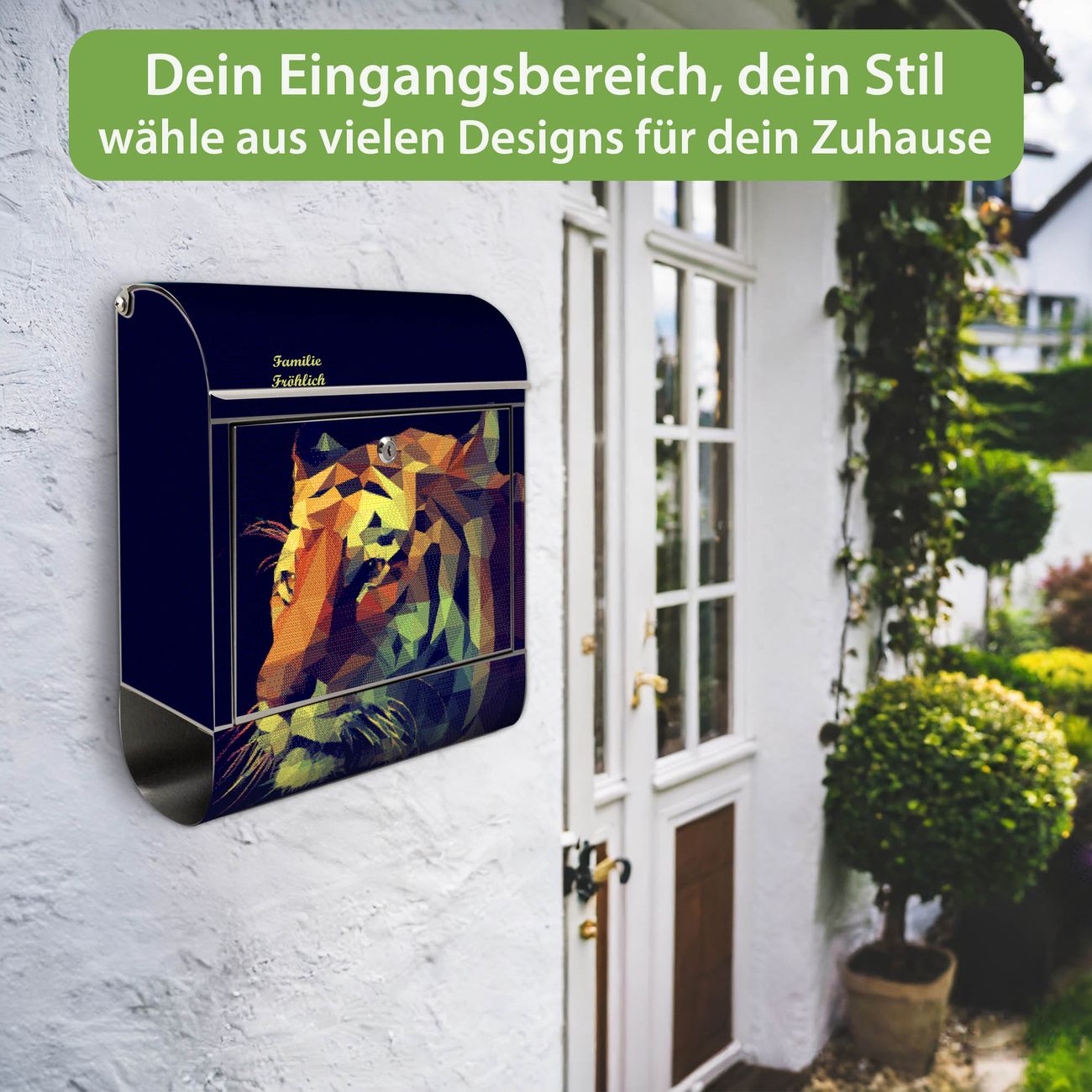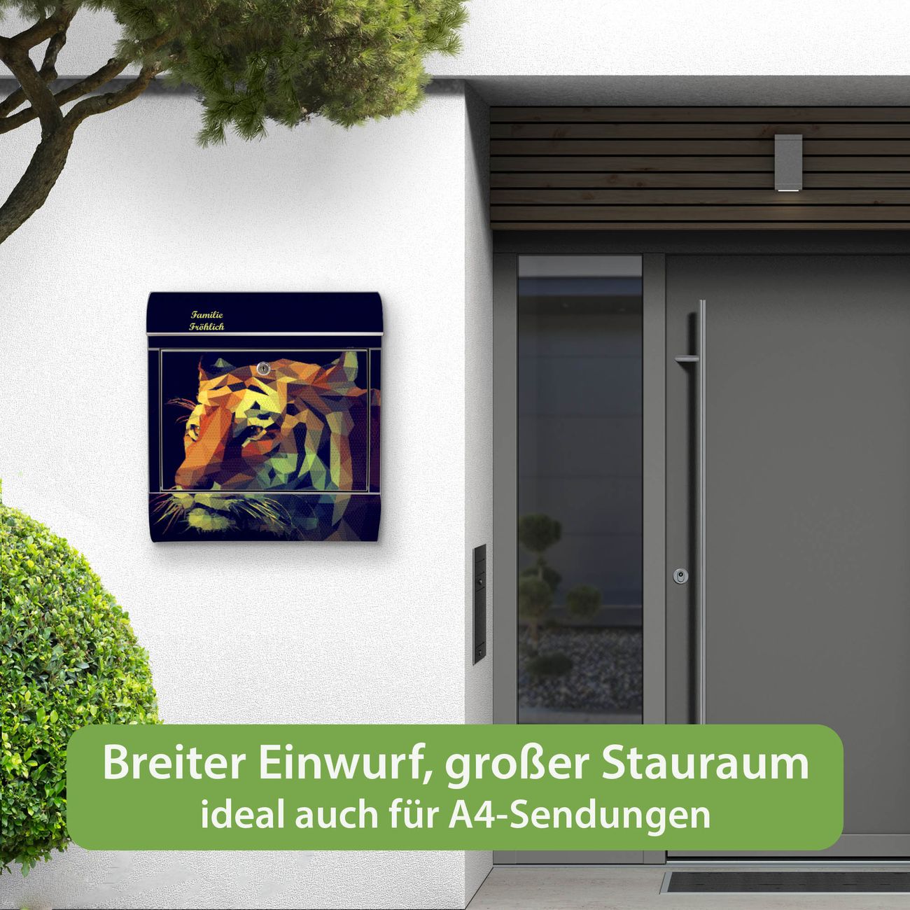 FUNKTION: Der banjado Edelstahl Briefkasten mit Motiv Motiv Polygon Tiger bietet Ihnen mit seinem Fassungsvermögen genügend Platz auch für große A4 Sendungen. Das integrierte Zeitungsfach eignet sich hervorragend um unkompliziert die Tageszeitung zu fassen. Auf Wunsch können Sie bei uns den passenden Ständer kaufen und so aus dem Wandbriefkasten einen Standbriefkasten machen. DESIGN: Der Motivbriefkasten hat ein sehr ansprechendes und ausgefallenes Design, damit entlocken Sie Ihren Nachbarn und dem Postboten ein Lächeln. Heben Sie Sich ab von der tristen grauen Masse ohne auf Funktionalität zu verzichten. DETAILS: Der Design Briefkasten mit Motiv Motiv Polygon Tiger besteht aus hochwertigem 18/0 Edelstahl. Das Motiv besteht aus einer wetter- und UV-resistenten Folie, die mit einem Schutzlaminat überzogen ist. Der Briefkasten wird mit Montagematerial und zwei Schlüsseln geliefert. NUTZEN: Sie können diesen Briefkasten sowohl als Wandbriefkasten montieren oder einen passenden Ständer auswählen und als Standbriefkasten einbetonieren. Die Größe bietet genügend Platz für Sendungen aller Art, das hochwertige Edelstahl ist rostfrei und die Motivfolie absolut wetterfest. SCHUTZ: Um Ihre Post optimal vor Witterungseinflüssen wie Starkregen zu schützen, empfehlen wir, den Briefkasten geschützt anzubringen. BANJADO: Ihr Briefkasten wird in Sachsen in einer kleinen Manufaktur von Hand veredelt. Die Motivfolie ist lösungsmittelfrei und schutzlaminiert, dies sorgt für einen langen Halt. Wir legen großen Wert auf die Verbindung von Funktionalität und Design. Sie erhalten Handarbeit aus Sachsen.