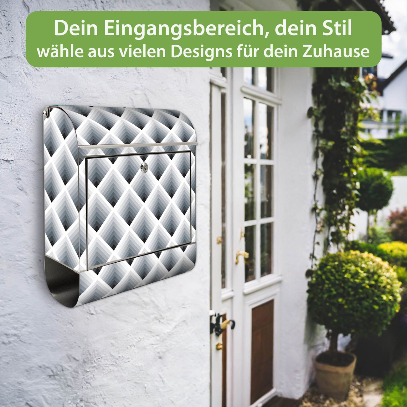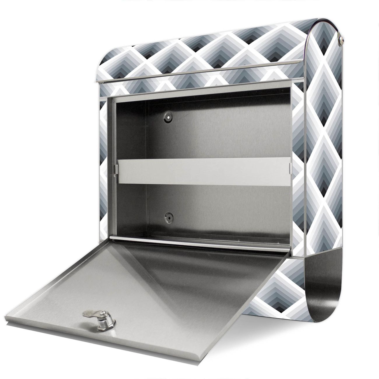 FUNKTION: Der banjado Edelstahl Briefkasten mit Motiv Motiv Raster 3D Grau bietet Ihnen mit seinem Fassungsvermögen genügend Platz auch für große A4 Sendungen. Das integrierte Zeitungsfach eignet sich hervorragend um unkompliziert die Tageszeitung zu fassen. Auf Wunsch können Sie bei uns den passenden Ständer kaufen und so aus dem Wandbriefkasten einen Standbriefkasten machen. DESIGN: Der Motivbriefkasten hat ein sehr ansprechendes und ausgefallenes Design, damit entlocken Sie Ihren Nachbarn und dem Postboten ein Lächeln. Heben Sie Sich ab von der tristen grauen Masse ohne auf Funktionalität zu verzichten. DETAILS: Der Design Briefkasten mit Motiv Motiv Raster 3D Grau besteht aus hochwertigem 18/0 Edelstahl. Das Motiv besteht aus einer wetter- und UV-resistenten Folie, die mit einem Schutzlaminat überzogen ist. Der Briefkasten wird mit Montagematerial und zwei Schlüsseln geliefert. NUTZEN: Sie können diesen Briefkasten sowohl als Wandbriefkasten montieren oder einen passenden Ständer auswählen und als Standbriefkasten einbetonieren. Die Größe bietet genügend Platz für Sendungen aller Art, das hochwertige Edelstahl ist rostfrei und die Motivfolie absolut wetterfest. SCHUTZ: Um Ihre Post optimal vor Witterungseinflüssen wie Starkregen zu schützen, empfehlen wir, den Briefkasten geschützt anzubringen. BANJADO: Ihr Briefkasten wird in Sachsen in einer kleinen Manufaktur von Hand veredelt. Die Motivfolie ist lösungsmittelfrei und schutzlaminiert, dies sorgt für einen langen Halt. Wir legen großen Wert auf die Verbindung von Funktionalität und Design. Sie erhalten Handarbeit aus Sachsen.