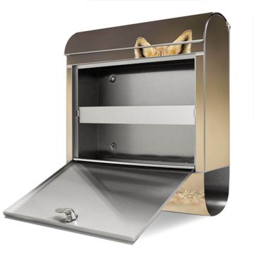 FUNKTION: Der banjado Edelstahl Briefkasten mit Motiv Motiv Rosalie bietet Ihnen mit seinem Fassungsvermögen genügend Platz auch für große A4 Sendungen. Das integrierte Zeitungsfach eignet sich hervorragend um unkompliziert die Tageszeitung zu fassen. Auf Wunsch können Sie bei uns den passenden Ständer kaufen und so aus dem Wandbriefkasten einen Standbriefkasten machen. DESIGN: Der Motivbriefkasten hat ein sehr ansprechendes und ausgefallenes Design, damit entlocken Sie Ihren Nachbarn und dem Postboten ein Lächeln. Heben Sie Sich ab von der tristen grauen Masse ohne auf Funktionalität zu verzichten. DETAILS: Der Design Briefkasten mit Motiv Motiv Rosalie besteht aus hochwertigem 18/0 Edelstahl. Das Motiv besteht aus einer wetter- und UV-resistenten Folie, die mit einem Schutzlaminat überzogen ist. Der Briefkasten wird mit Montagematerial und zwei Schlüsseln geliefert. NUTZEN: Sie können diesen Briefkasten sowohl als Wandbriefkasten montieren oder einen passenden Ständer auswählen und als Standbriefkasten einbetonieren. Die Größe bietet genügend Platz für Sendungen aller Art, das hochwertige Edelstahl ist rostfrei und die Motivfolie absolut wetterfest. SCHUTZ: Um Ihre Post optimal vor Witterungseinflüssen wie Starkregen zu schützen, empfehlen wir, den Briefkasten geschützt anzubringen. BANJADO: Ihr Briefkasten wird in Sachsen in einer kleinen Manufaktur von Hand veredelt. Die Motivfolie ist lösungsmittelfrei und schutzlaminiert, dies sorgt für einen langen Halt. Wir legen großen Wert auf die Verbindung von Funktionalität und Design. Sie erhalten Handarbeit aus Sachsen.