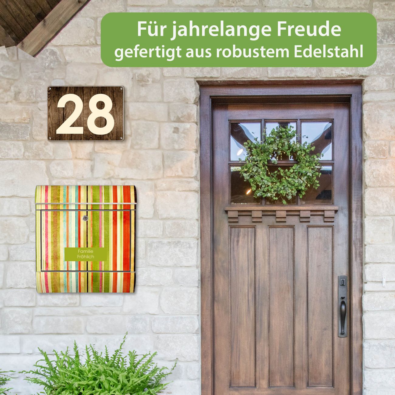 FUNKTION: Der banjado Edelstahl Briefkasten mit Motiv Motiv Streifen bietet Ihnen mit seinem Fassungsvermögen genügend Platz auch für große A4 Sendungen. Das integrierte Zeitungsfach eignet sich hervorragend um unkompliziert die Tageszeitung zu fassen. Auf Wunsch können Sie bei uns den passenden Ständer kaufen und so aus dem Wandbriefkasten einen Standbriefkasten machen. DESIGN: Der Motivbriefkasten hat ein sehr ansprechendes und ausgefallenes Design, damit entlocken Sie Ihren Nachbarn und dem Postboten ein Lächeln. Heben Sie Sich ab von der tristen grauen Masse ohne auf Funktionalität zu verzichten. DETAILS: Der Design Briefkasten mit Motiv Motiv Streifen besteht aus hochwertigem 18/0 Edelstahl. Das Motiv besteht aus einer wetter- und UV-resistenten Folie, die mit einem Schutzlaminat überzogen ist. Der Briefkasten wird mit Montagematerial und zwei Schlüsseln geliefert. NUTZEN: Sie können diesen Briefkasten sowohl als Wandbriefkasten montieren oder einen passenden Ständer auswählen und als Standbriefkasten einbetonieren. Die Größe bietet genügend Platz für Sendungen aller Art, das hochwertige Edelstahl ist rostfrei und die Motivfolie absolut wetterfest. SCHUTZ: Um Ihre Post optimal vor Witterungseinflüssen wie Starkregen zu schützen, empfehlen wir, den Briefkasten geschützt anzubringen. BANJADO: Ihr Briefkasten wird in Sachsen in einer kleinen Manufaktur von Hand veredelt. Die Motivfolie ist lösungsmittelfrei und schutzlaminiert, dies sorgt für einen langen Halt. Wir legen großen Wert auf die Verbindung von Funktionalität und Design. Sie erhalten Handarbeit aus Sachsen.