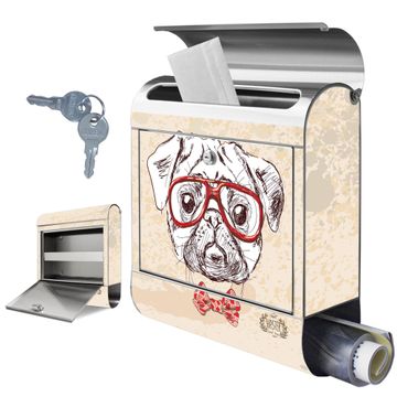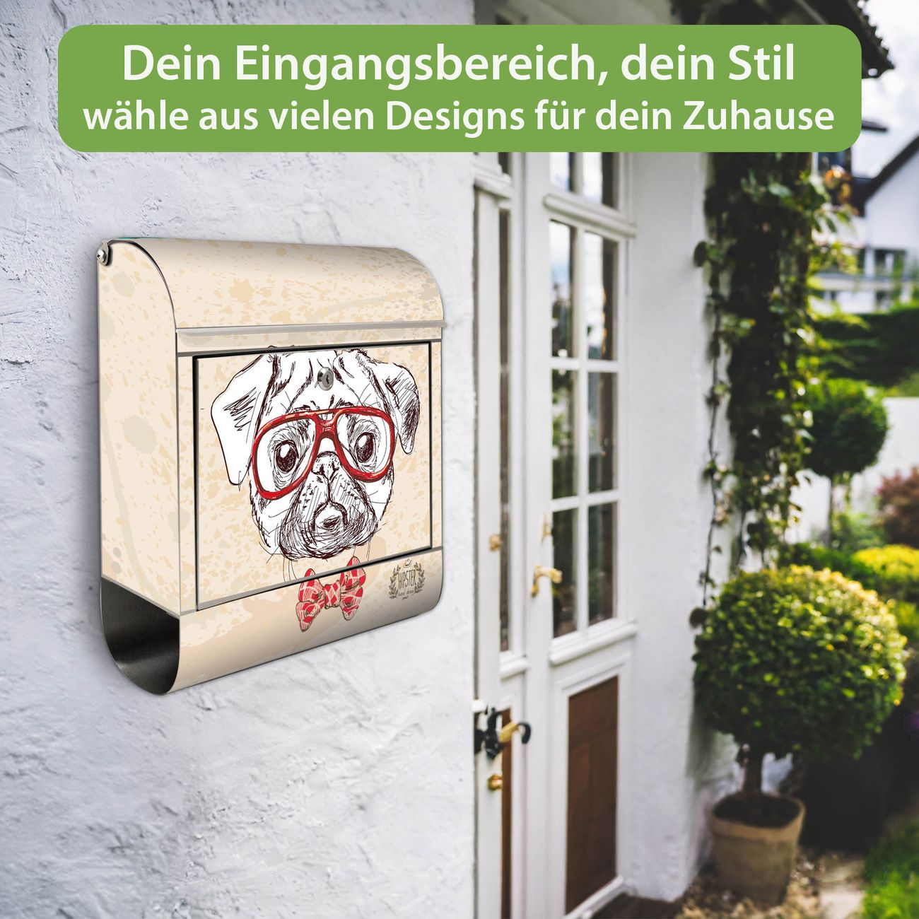 FUNKTION: Der banjado Edelstahl Briefkasten mit Motiv Motiv Timothy bietet Ihnen mit seinem Fassungsvermögen genügend Platz auch für große A4 Sendungen. Das integrierte Zeitungsfach eignet sich hervorragend um unkompliziert die Tageszeitung zu fassen. Auf Wunsch können Sie bei uns den passenden Ständer kaufen und so aus dem Wandbriefkasten einen Standbriefkasten machen. DESIGN: Der Motivbriefkasten hat ein sehr ansprechendes und ausgefallenes Design, damit entlocken Sie Ihren Nachbarn und dem Postboten ein Lächeln. Heben Sie Sich ab von der tristen grauen Masse ohne auf Funktionalität zu verzichten. DETAILS: Der Design Briefkasten mit Motiv Motiv Timothy besteht aus hochwertigem 18/0 Edelstahl. Das Motiv besteht aus einer wetter- und UV-resistenten Folie, die mit einem Schutzlaminat überzogen ist. Der Briefkasten wird mit Montagematerial und zwei Schlüsseln geliefert. NUTZEN: Sie können diesen Briefkasten sowohl als Wandbriefkasten montieren oder einen passenden Ständer auswählen und als Standbriefkasten einbetonieren. Die Größe bietet genügend Platz für Sendungen aller Art, das hochwertige Edelstahl ist rostfrei und die Motivfolie absolut wetterfest. SCHUTZ: Um Ihre Post optimal vor Witterungseinflüssen wie Starkregen zu schützen, empfehlen wir, den Briefkasten geschützt anzubringen. BANJADO: Ihr Briefkasten wird in Sachsen in einer kleinen Manufaktur von Hand veredelt. Die Motivfolie ist lösungsmittelfrei und schutzlaminiert, dies sorgt für einen langen Halt. Wir legen großen Wert auf die Verbindung von Funktionalität und Design. Sie erhalten Handarbeit aus Sachsen.