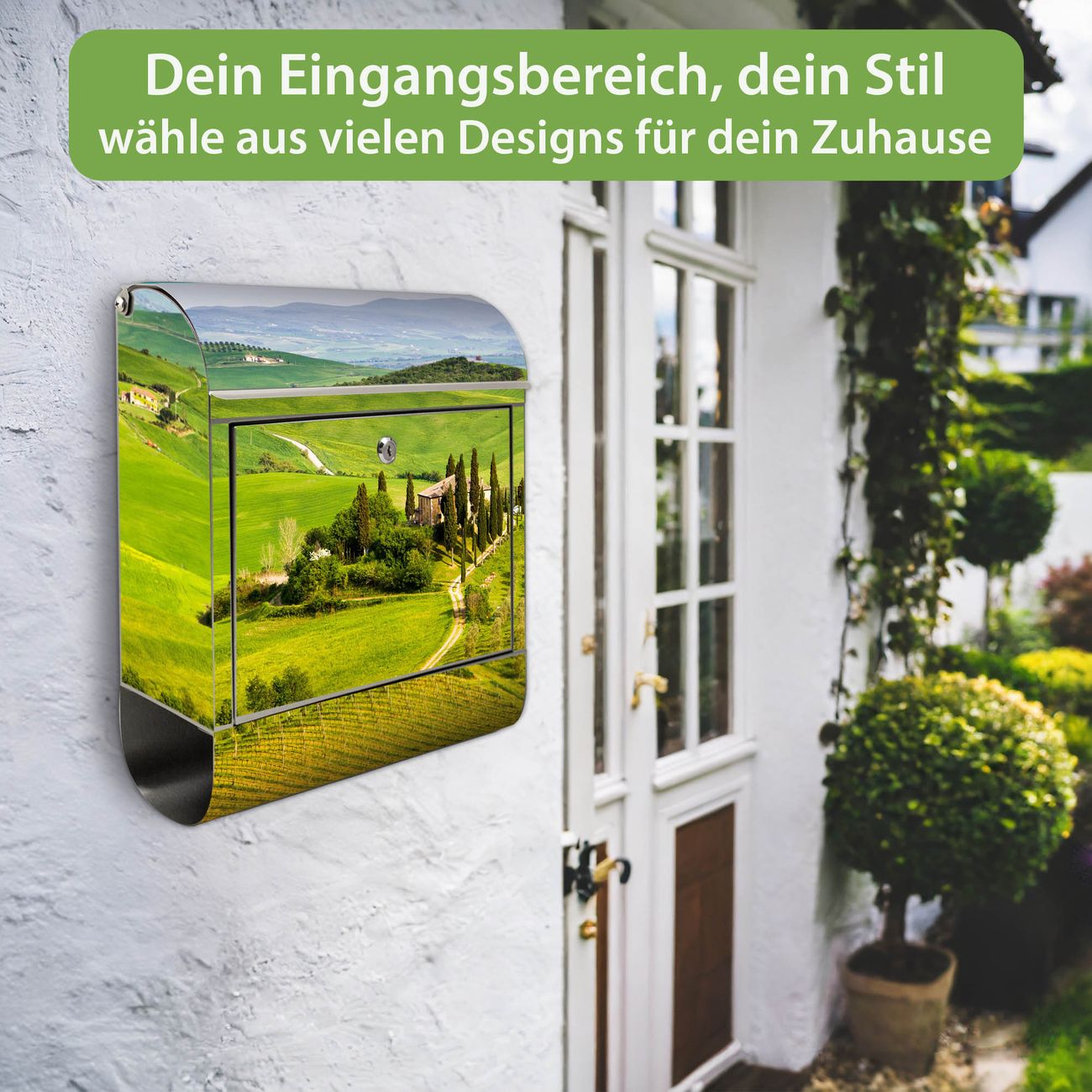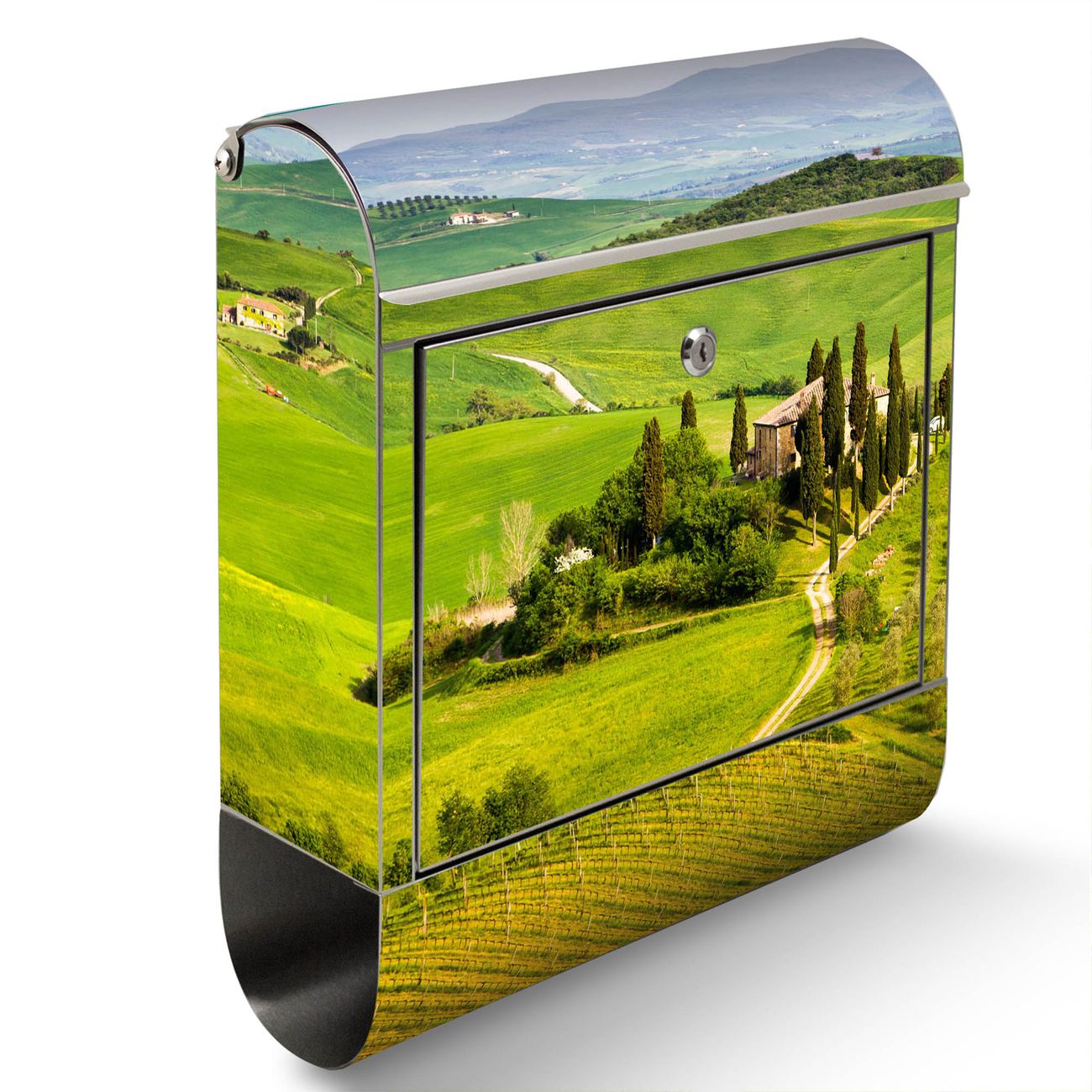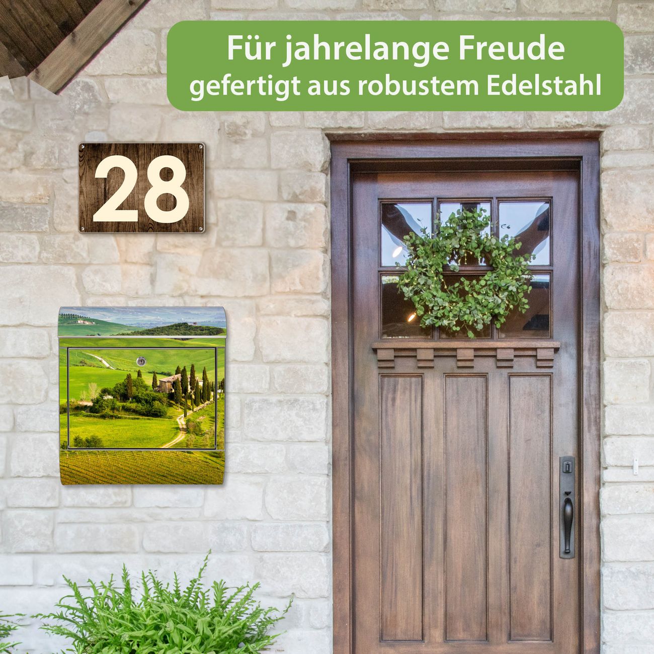 FUNKTION: Der banjado Edelstahl Briefkasten mit Motiv Motiv Toskana bietet Ihnen mit seinem Fassungsvermögen genügend Platz auch für große A4 Sendungen. Das integrierte Zeitungsfach eignet sich hervorragend um unkompliziert die Tageszeitung zu fassen. Auf Wunsch können Sie bei uns den passenden Ständer kaufen und so aus dem Wandbriefkasten einen Standbriefkasten machen. DESIGN: Der Motivbriefkasten hat ein sehr ansprechendes und ausgefallenes Design, damit entlocken Sie Ihren Nachbarn und dem Postboten ein Lächeln. Heben Sie Sich ab von der tristen grauen Masse ohne auf Funktionalität zu verzichten. DETAILS: Der Design Briefkasten mit Motiv Motiv Toskana besteht aus hochwertigem 18/0 Edelstahl. Das Motiv besteht aus einer wetter- und UV-resistenten Folie, die mit einem Schutzlaminat überzogen ist. Der Briefkasten wird mit Montagematerial und zwei Schlüsseln geliefert. NUTZEN: Sie können diesen Briefkasten sowohl als Wandbriefkasten montieren oder einen passenden Ständer auswählen und als Standbriefkasten einbetonieren. Die Größe bietet genügend Platz für Sendungen aller Art, das hochwertige Edelstahl ist rostfrei und die Motivfolie absolut wetterfest. SCHUTZ: Um Ihre Post optimal vor Witterungseinflüssen wie Starkregen zu schützen, empfehlen wir, den Briefkasten geschützt anzubringen. BANJADO: Ihr Briefkasten wird in Sachsen in einer kleinen Manufaktur von Hand veredelt. Die Motivfolie ist lösungsmittelfrei und schutzlaminiert, dies sorgt für einen langen Halt. Wir legen großen Wert auf die Verbindung von Funktionalität und Design. Sie erhalten Handarbeit aus Sachsen.