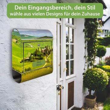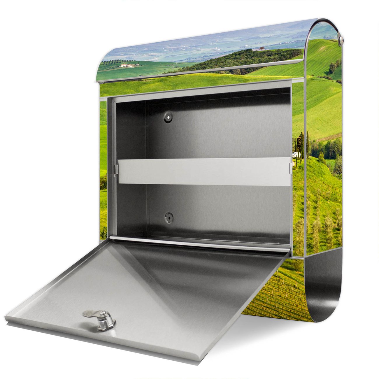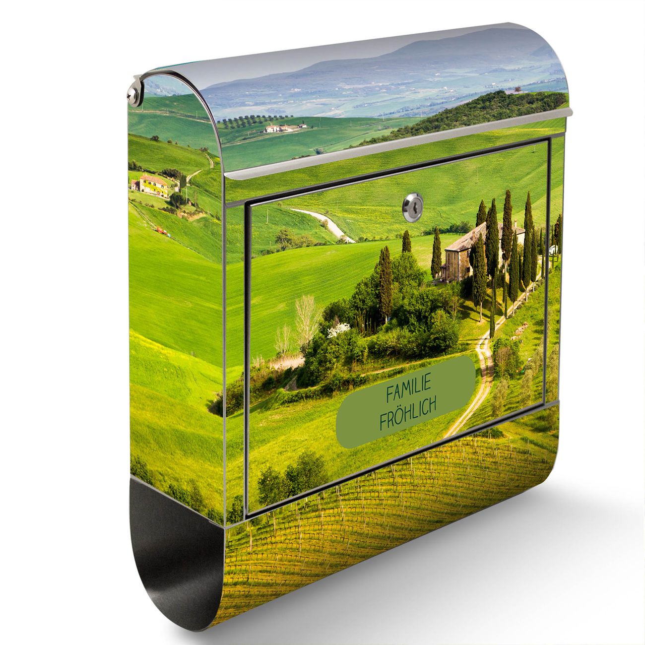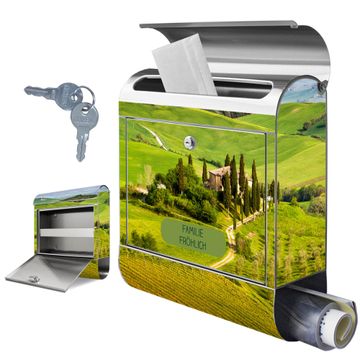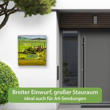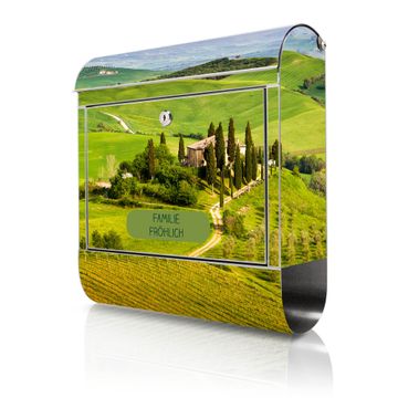 FUNKTION: Der banjado Edelstahl Briefkasten mit Motiv Motiv Toskana bietet Ihnen mit seinem Fassungsvermögen genügend Platz auch für große A4 Sendungen. Das integrierte Zeitungsfach eignet sich hervorragend um unkompliziert die Tageszeitung zu fassen. Auf Wunsch können Sie bei uns den passenden Ständer kaufen und so aus dem Wandbriefkasten einen Standbriefkasten machen. DESIGN: Der Motivbriefkasten hat ein sehr ansprechendes und ausgefallenes Design, damit entlocken Sie Ihren Nachbarn und dem Postboten ein Lächeln. Heben Sie Sich ab von der tristen grauen Masse ohne auf Funktionalität zu verzichten. DETAILS: Der Design Briefkasten mit Motiv Motiv Toskana besteht aus hochwertigem 18/0 Edelstahl. Das Motiv besteht aus einer wetter- und UV-resistenten Folie, die mit einem Schutzlaminat überzogen ist. Der Briefkasten wird mit Montagematerial und zwei Schlüsseln geliefert. NUTZEN: Sie können diesen Briefkasten sowohl als Wandbriefkasten montieren oder einen passenden Ständer auswählen und als Standbriefkasten einbetonieren. Die Größe bietet genügend Platz für Sendungen aller Art, das hochwertige Edelstahl ist rostfrei und die Motivfolie absolut wetterfest. SCHUTZ: Um Ihre Post optimal vor Witterungseinflüssen wie Starkregen zu schützen, empfehlen wir, den Briefkasten geschützt anzubringen. BANJADO: Ihr Briefkasten wird in Sachsen in einer kleinen Manufaktur von Hand veredelt. Die Motivfolie ist lösungsmittelfrei und schutzlaminiert, dies sorgt für einen langen Halt. Wir legen großen Wert auf die Verbindung von Funktionalität und Design. Sie erhalten Handarbeit aus Sachsen.