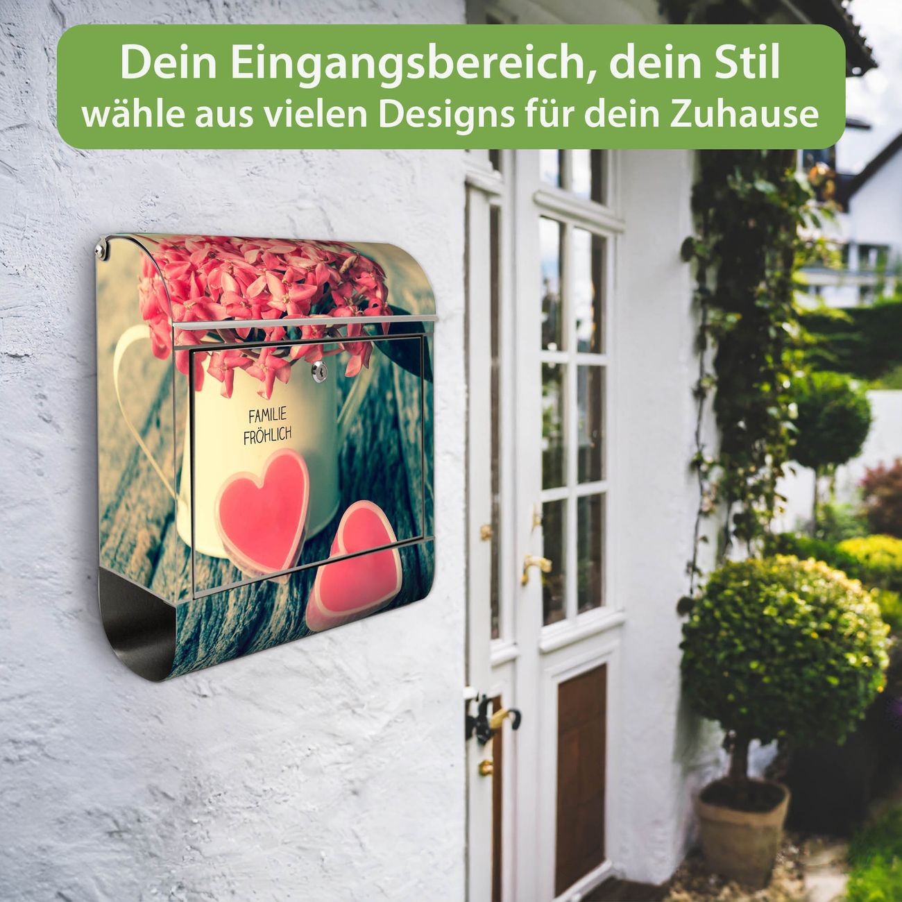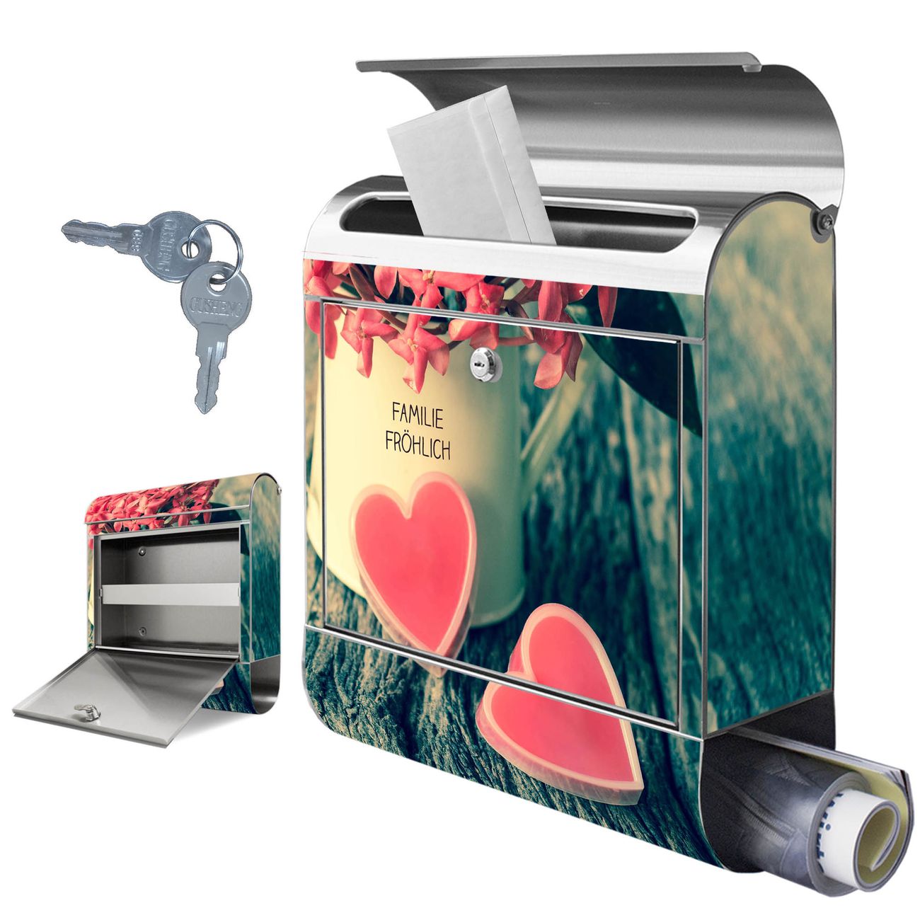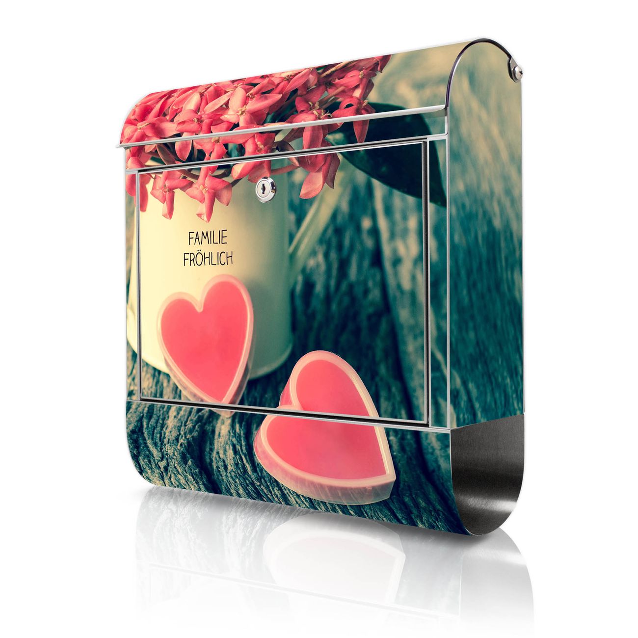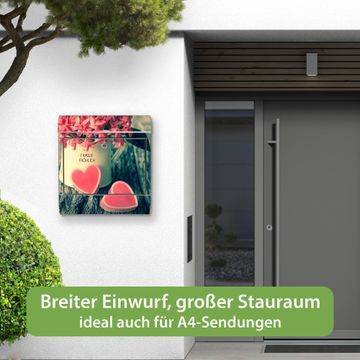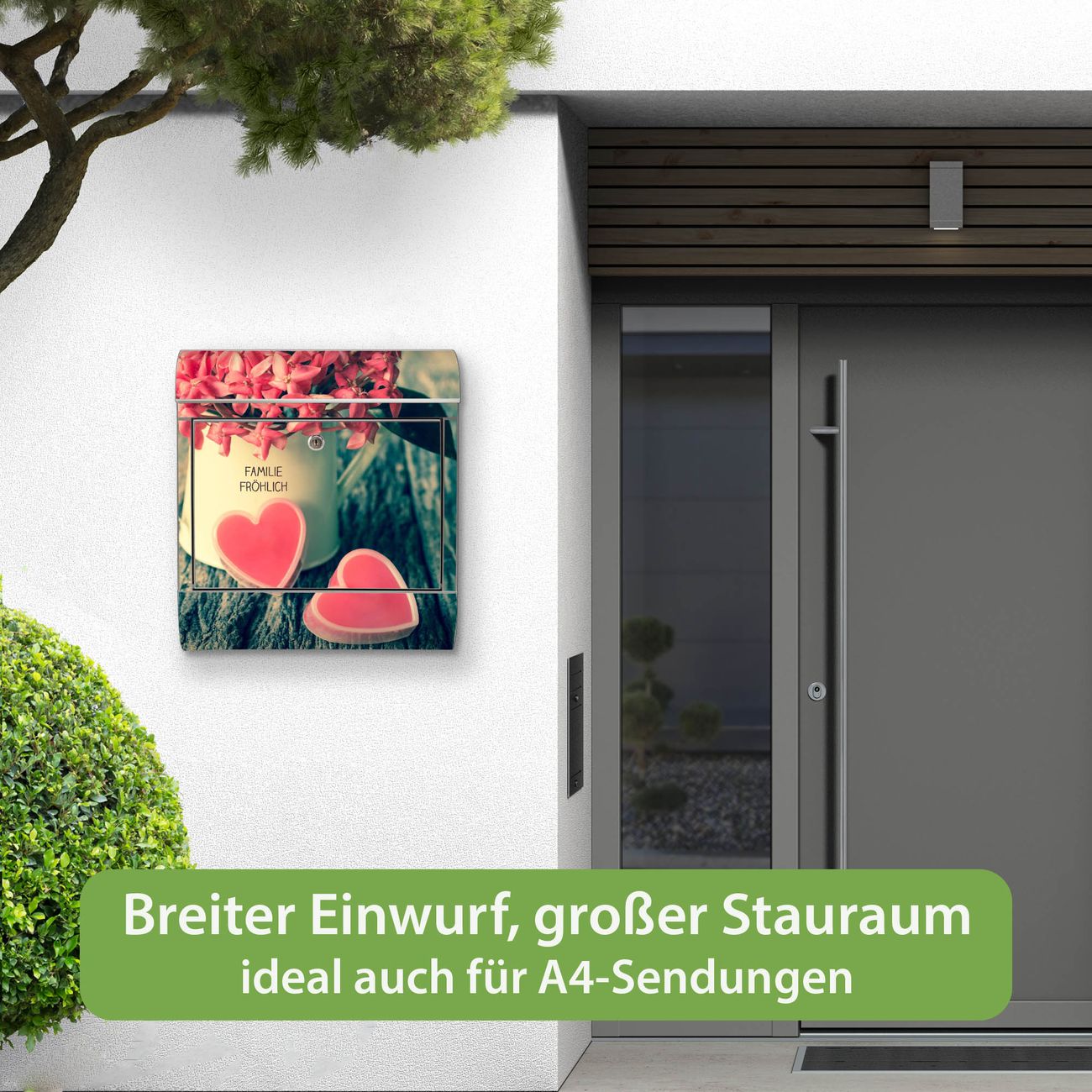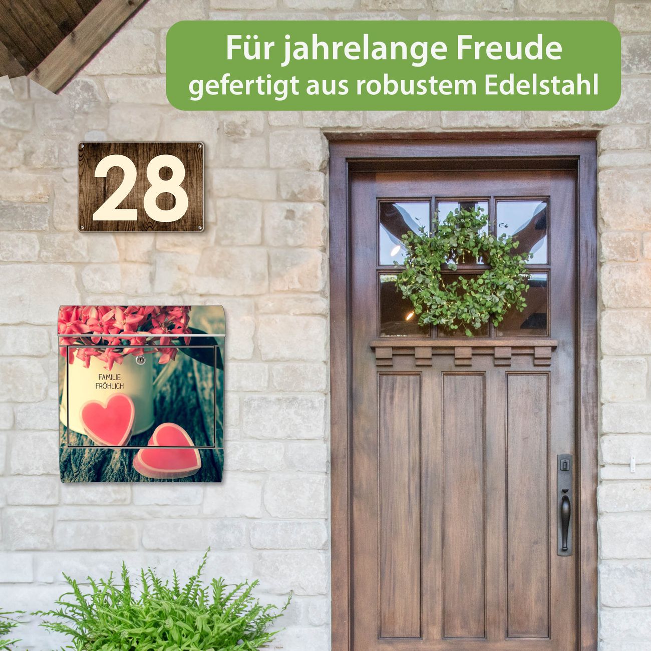 FUNKTION: Der banjado Edelstahl Briefkasten mit Motiv Motiv Valentin bietet Ihnen mit seinem Fassungsvermögen genügend Platz auch für große A4 Sendungen. Das integrierte Zeitungsfach eignet sich hervorragend um unkompliziert die Tageszeitung zu fassen. Auf Wunsch können Sie bei uns den passenden Ständer kaufen und so aus dem Wandbriefkasten einen Standbriefkasten machen. DESIGN: Der Motivbriefkasten hat ein sehr ansprechendes und ausgefallenes Design, damit entlocken Sie Ihren Nachbarn und dem Postboten ein Lächeln. Heben Sie Sich ab von der tristen grauen Masse ohne auf Funktionalität zu verzichten. DETAILS: Der Design Briefkasten mit Motiv Motiv Valentin besteht aus hochwertigem 18/0 Edelstahl. Das Motiv besteht aus einer wetter- und UV-resistenten Folie, die mit einem Schutzlaminat überzogen ist. Der Briefkasten wird mit Montagematerial und zwei Schlüsseln geliefert. NUTZEN: Sie können diesen Briefkasten sowohl als Wandbriefkasten montieren oder einen passenden Ständer auswählen und als Standbriefkasten einbetonieren. Die Größe bietet genügend Platz für Sendungen aller Art, das hochwertige Edelstahl ist rostfrei und die Motivfolie absolut wetterfest. SCHUTZ: Um Ihre Post optimal vor Witterungseinflüssen wie Starkregen zu schützen, empfehlen wir, den Briefkasten geschützt anzubringen. BANJADO: Ihr Briefkasten wird in Sachsen in einer kleinen Manufaktur von Hand veredelt. Die Motivfolie ist lösungsmittelfrei und schutzlaminiert, dies sorgt für einen langen Halt. Wir legen großen Wert auf die Verbindung von Funktionalität und Design. Sie erhalten Handarbeit aus Sachsen.