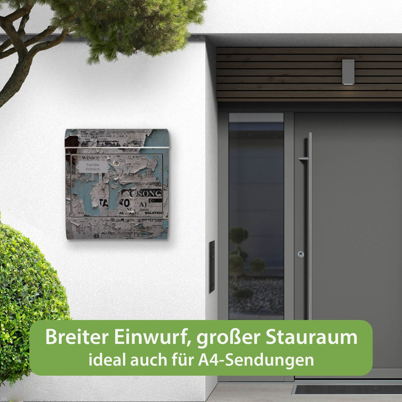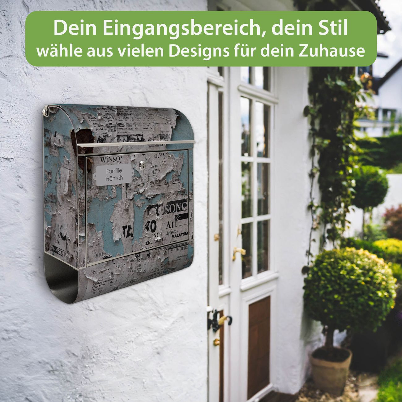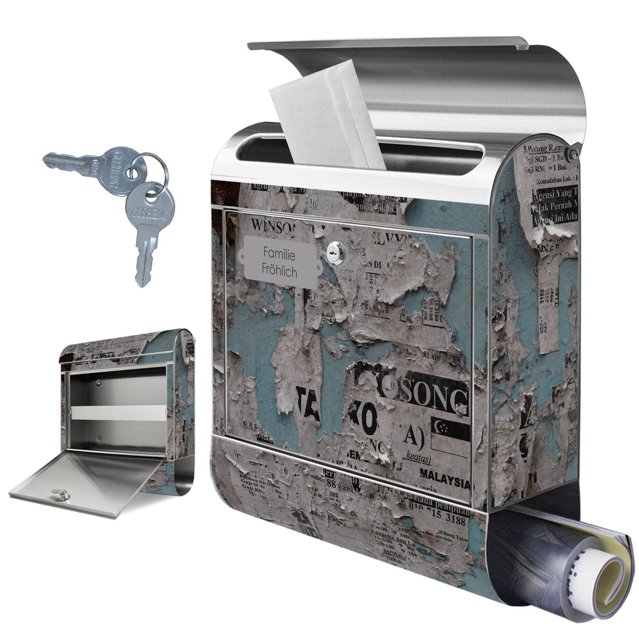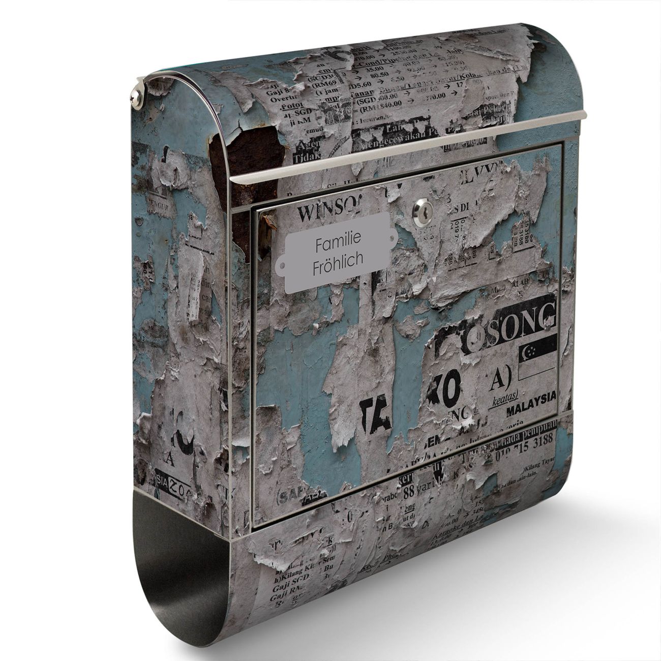 Wandbriefkasten Edelstahl Motiv Wand mit Zeitungen