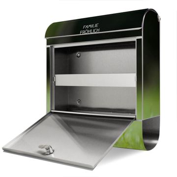 FUNKTION: Der banjado Edelstahl Briefkasten mit Motiv Motiv Welpe im Gras bietet Ihnen mit seinem Fassungsvermögen genügend Platz auch für große A4 Sendungen. Das integrierte Zeitungsfach eignet sich hervorragend um unkompliziert die Tageszeitung zu fassen. Auf Wunsch können Sie bei uns den passenden Ständer kaufen und so aus dem Wandbriefkasten einen Standbriefkasten machen. DESIGN: Der Motivbriefkasten hat ein sehr ansprechendes und ausgefallenes Design, damit entlocken Sie Ihren Nachbarn und dem Postboten ein Lächeln. Heben Sie Sich ab von der tristen grauen Masse ohne auf Funktionalität zu verzichten. DETAILS: Der Design Briefkasten mit Motiv Motiv Welpe im Gras besteht aus hochwertigem 18/0 Edelstahl. Das Motiv besteht aus einer wetter- und UV-resistenten Folie, die mit einem Schutzlaminat überzogen ist. Der Briefkasten wird mit Montagematerial und zwei Schlüsseln geliefert. NUTZEN: Sie können diesen Briefkasten sowohl als Wandbriefkasten montieren oder einen passenden Ständer auswählen und als Standbriefkasten einbetonieren. Die Größe bietet genügend Platz für Sendungen aller Art, das hochwertige Edelstahl ist rostfrei und die Motivfolie absolut wetterfest. SCHUTZ: Um Ihre Post optimal vor Witterungseinflüssen wie Starkregen zu schützen, empfehlen wir, den Briefkasten geschützt anzubringen. BANJADO: Ihr Briefkasten wird in Sachsen in einer kleinen Manufaktur von Hand veredelt. Die Motivfolie ist lösungsmittelfrei und schutzlaminiert, dies sorgt für einen langen Halt. Wir legen großen Wert auf die Verbindung von Funktionalität und Design. Sie erhalten Handarbeit aus Sachsen.