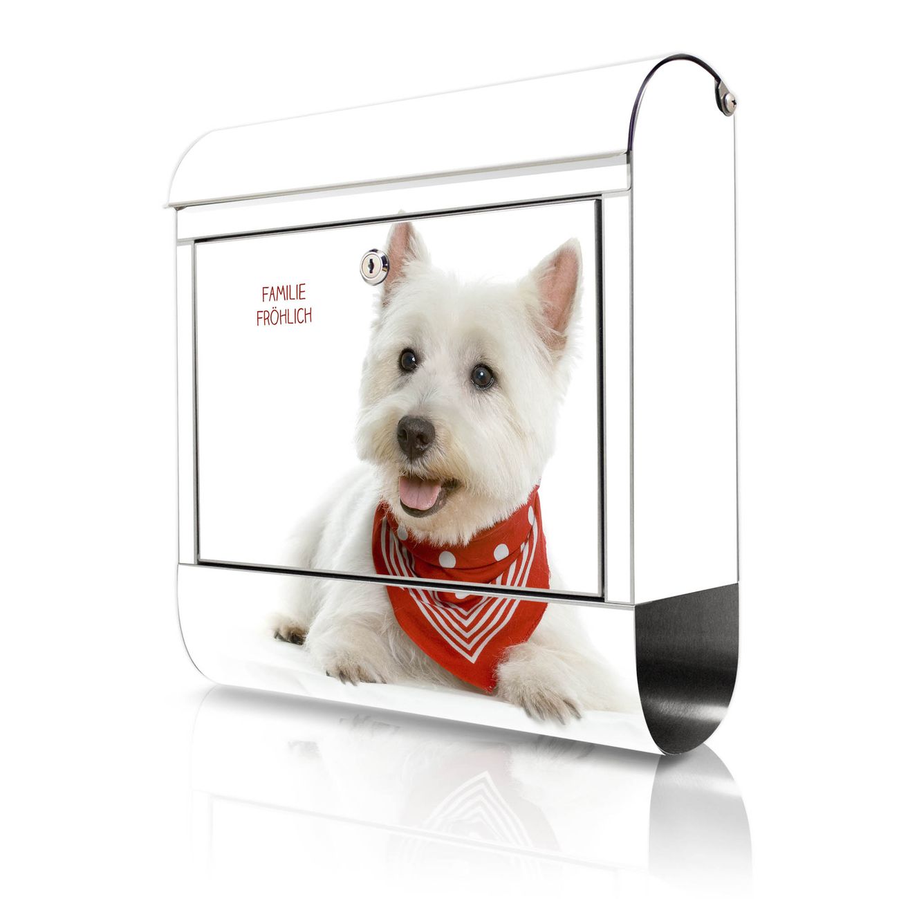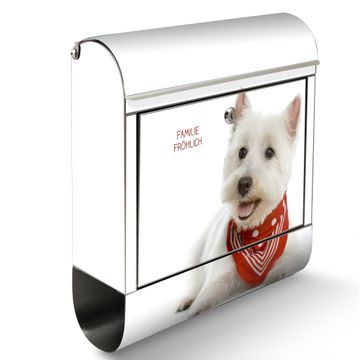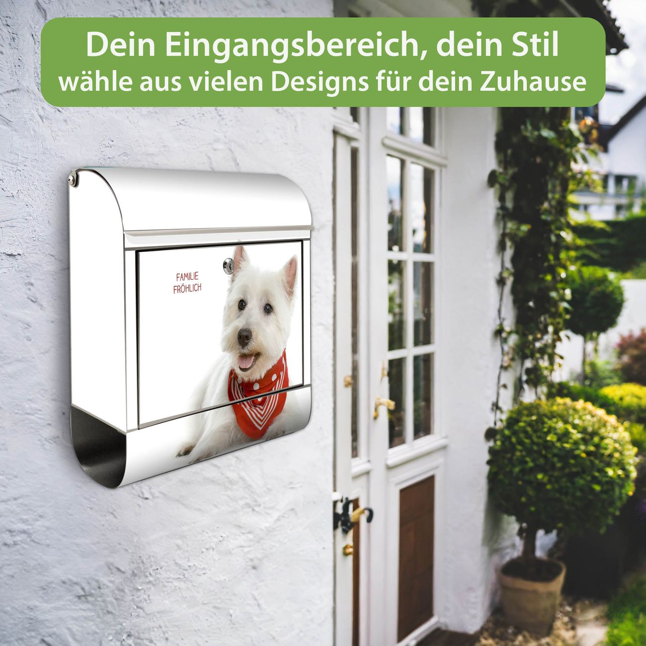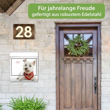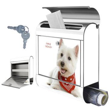 FUNKTION: Der banjado Edelstahl Briefkasten mit Motiv Motiv Westie bietet Ihnen mit seinem Fassungsvermögen genügend Platz auch für große A4 Sendungen. Das integrierte Zeitungsfach eignet sich hervorragend um unkompliziert die Tageszeitung zu fassen. Auf Wunsch können Sie bei uns den passenden Ständer kaufen und so aus dem Wandbriefkasten einen Standbriefkasten machen. DESIGN: Der Motivbriefkasten hat ein sehr ansprechendes und ausgefallenes Design, damit entlocken Sie Ihren Nachbarn und dem Postboten ein Lächeln. Heben Sie Sich ab von der tristen grauen Masse ohne auf Funktionalität zu verzichten. DETAILS: Der Design Briefkasten mit Motiv Motiv Westie besteht aus hochwertigem 18/0 Edelstahl. Das Motiv besteht aus einer wetter- und UV-resistenten Folie, die mit einem Schutzlaminat überzogen ist. Der Briefkasten wird mit Montagematerial und zwei Schlüsseln geliefert. NUTZEN: Sie können diesen Briefkasten sowohl als Wandbriefkasten montieren oder einen passenden Ständer auswählen und als Standbriefkasten einbetonieren. Die Größe bietet genügend Platz für Sendungen aller Art, das hochwertige Edelstahl ist rostfrei und die Motivfolie absolut wetterfest. SCHUTZ: Um Ihre Post optimal vor Witterungseinflüssen wie Starkregen zu schützen, empfehlen wir, den Briefkasten geschützt anzubringen. BANJADO: Ihr Briefkasten wird in Sachsen in einer kleinen Manufaktur von Hand veredelt. Die Motivfolie ist lösungsmittelfrei und schutzlaminiert, dies sorgt für einen langen Halt. Wir legen großen Wert auf die Verbindung von Funktionalität und Design. Sie erhalten Handarbeit aus Sachsen.