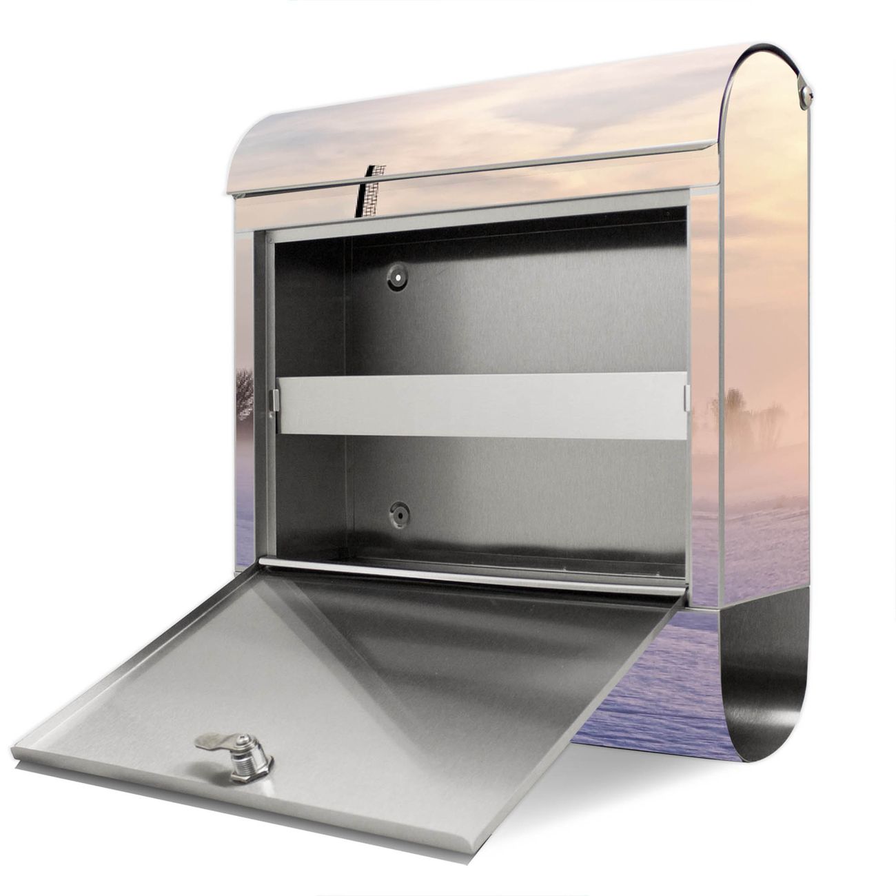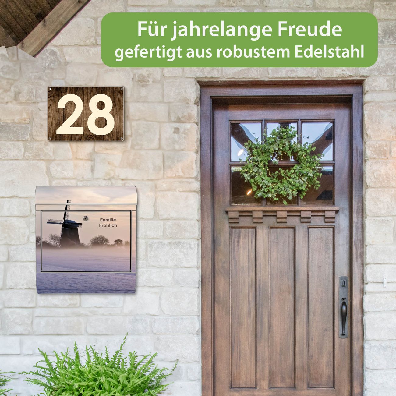 FUNKTION: Der banjado Edelstahl Briefkasten mit Motiv Motiv Windmühle im Winter bietet Ihnen mit seinem Fassungsvermögen genügend Platz auch für große A4 Sendungen. Das integrierte Zeitungsfach eignet sich hervorragend um unkompliziert die Tageszeitung zu fassen. Auf Wunsch können Sie bei uns den passenden Ständer kaufen und so aus dem Wandbriefkasten einen Standbriefkasten machen. DESIGN: Der Motivbriefkasten hat ein sehr ansprechendes und ausgefallenes Design, damit entlocken Sie Ihren Nachbarn und dem Postboten ein Lächeln. Heben Sie Sich ab von der tristen grauen Masse ohne auf Funktionalität zu verzichten. DETAILS: Der Design Briefkasten mit Motiv Motiv Windmühle im Winter besteht aus hochwertigem 18/0 Edelstahl. Das Motiv besteht aus einer wetter- und UV-resistenten Folie, die mit einem Schutzlaminat überzogen ist. Der Briefkasten wird mit Montagematerial und zwei Schlüsseln geliefert. NUTZEN: Sie können diesen Briefkasten sowohl als Wandbriefkasten montieren oder einen passenden Ständer auswählen und als Standbriefkasten einbetonieren. Die Größe bietet genügend Platz für Sendungen aller Art, das hochwertige Edelstahl ist rostfrei und die Motivfolie absolut wetterfest. SCHUTZ: Um Ihre Post optimal vor Witterungseinflüssen wie Starkregen zu schützen, empfehlen wir, den Briefkasten geschützt anzubringen. BANJADO: Ihr Briefkasten wird in Sachsen in einer kleinen Manufaktur von Hand veredelt. Die Motivfolie ist lösungsmittelfrei und schutzlaminiert, dies sorgt für einen langen Halt. Wir legen großen Wert auf die Verbindung von Funktionalität und Design. Sie erhalten Handarbeit aus Sachsen.